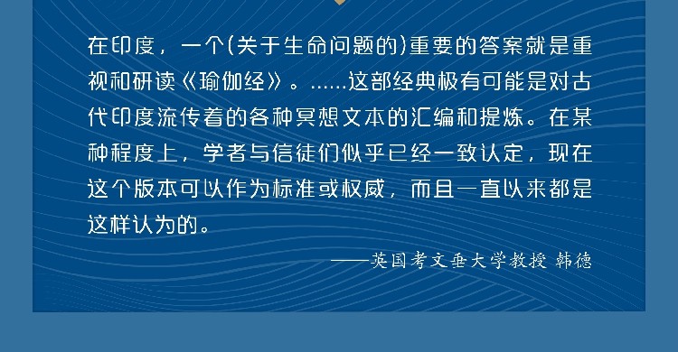 在印度,一个(关于生命问题的)重要的答案就是重视和研读《瑜伽经》。……这部经典极有可能是对古代印度流传着的各种冥想文本的汇编和提炼。在某种程度上,学者与信徒们似乎已经一致认定,现在这个版本可以作为标准或权威,而且一直以为都是这样认为的。