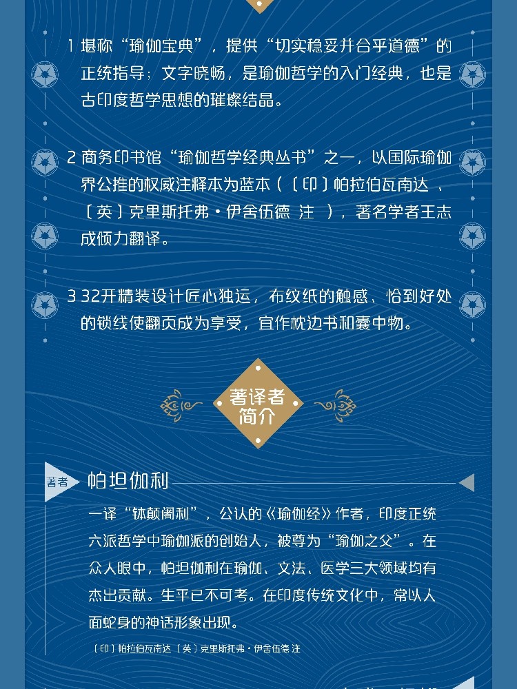 二、作为商务印书馆推出的“瑜伽哲学经典丛书”之一,以国际瑜伽界公推的权威注释本(〔印〕帕拉伯瓦南达 、〔英〕克里斯托弗·伊舍伍德 注 )为蓝本,著名学者王志成教授倾力翻译。