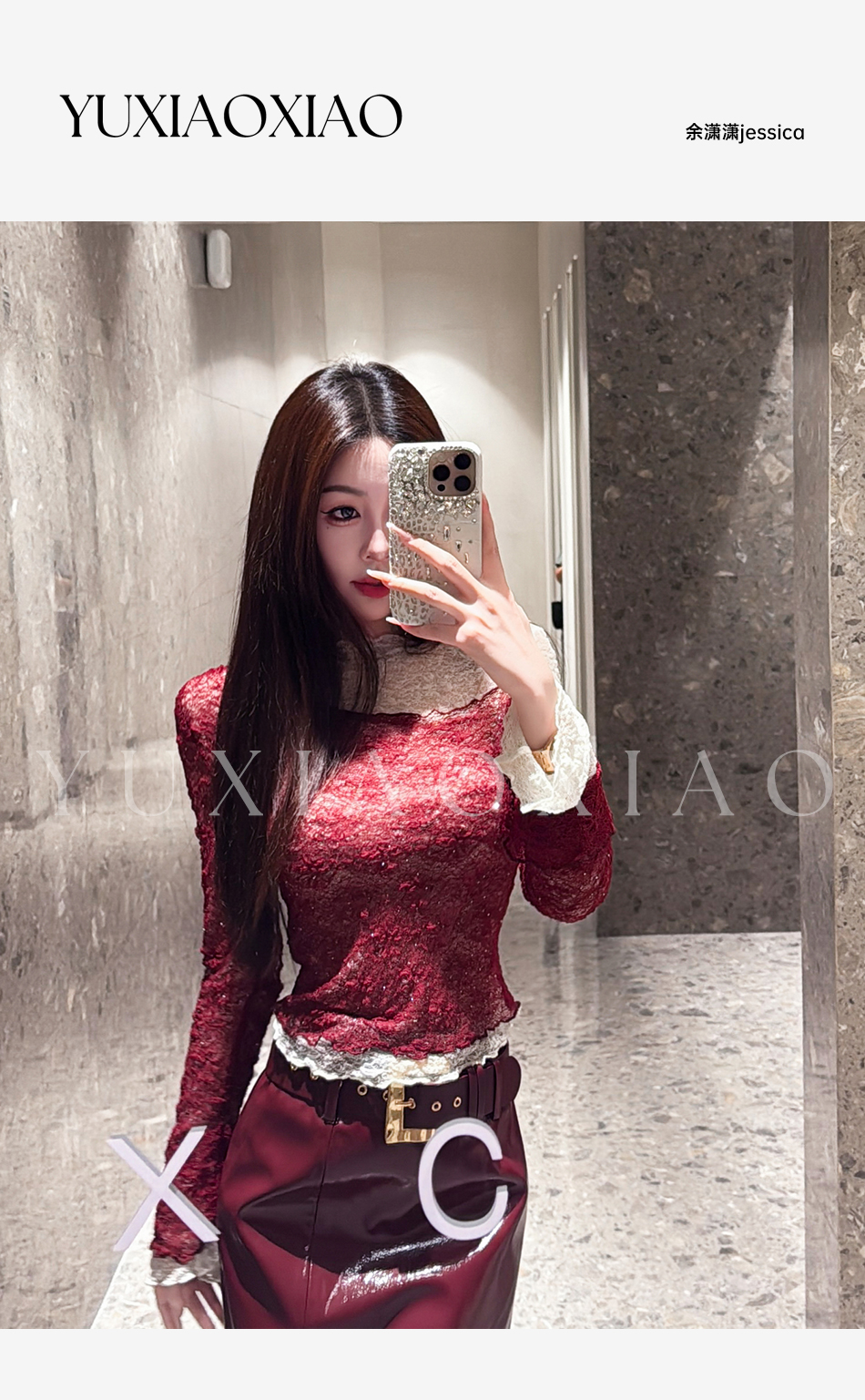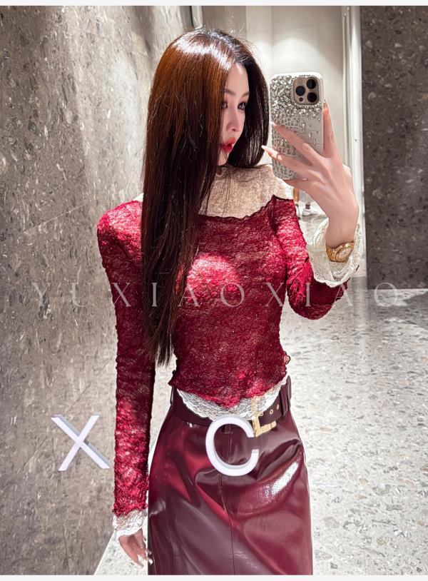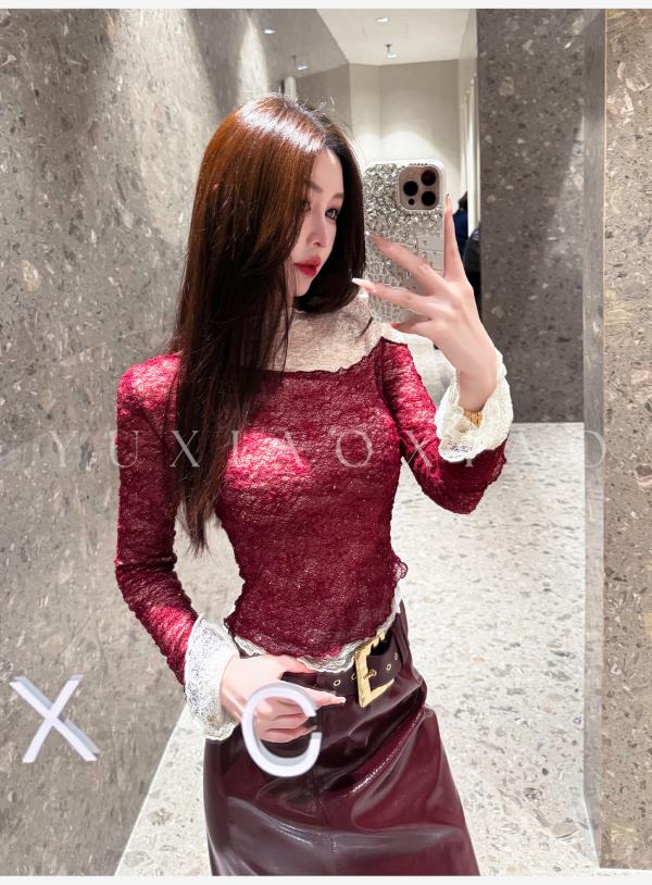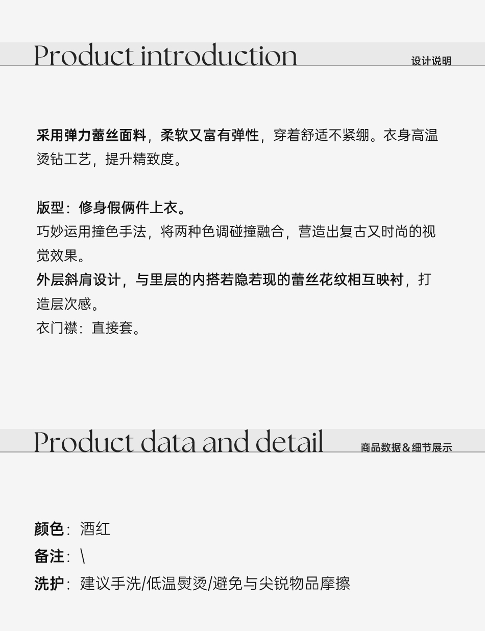 余潇潇【温柔丹霞】复古花纹精致撞色弹力蕾丝烫钻修身假俩件上衣