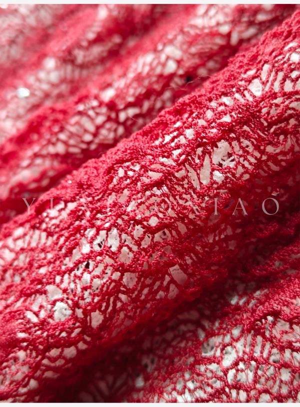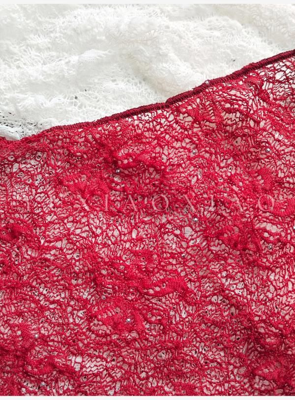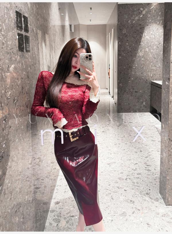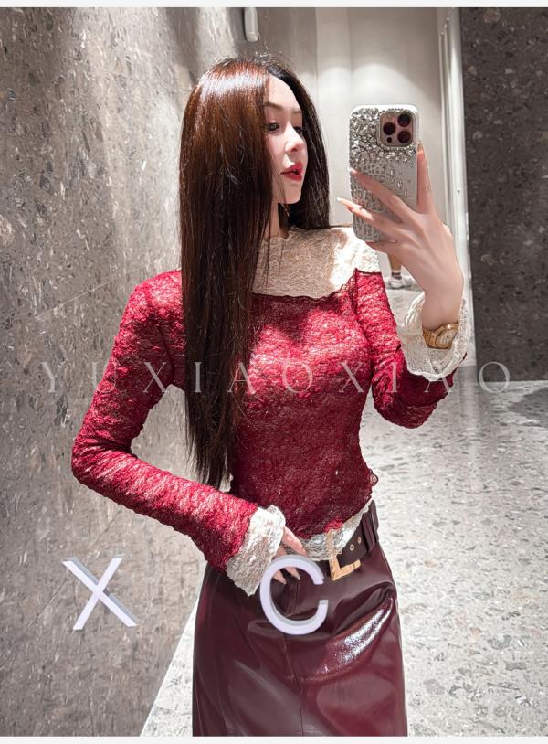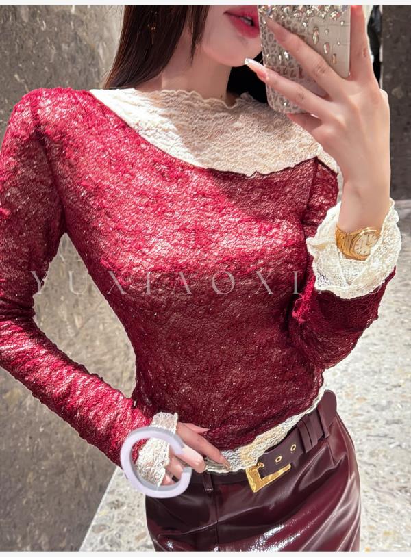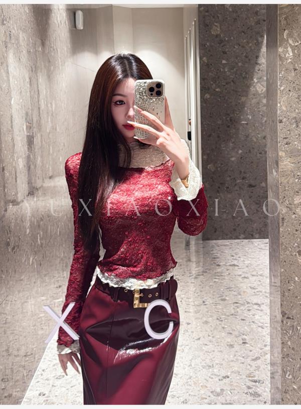 余潇潇【温柔丹霞】复古花纹精致撞色弹力蕾丝烫钻修身假俩件上衣