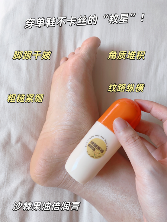 ❄ **秋冬黄金用法** 1. **急救皲裂**:热水泡手足→毛巾轻拭→厚敷膏体+保鲜膜包裹10分钟 2. **日常防护**:出门前/睡前涂指尖+脚后跟,防冷风裂口 3. **强效护理**:睡前套棉袜/手套,晨起摸得到嫩滑 脚后跟如果有 纹路深、白线多、穿袜子还经常刮到 经常穿凉鞋、拖鞋、高跟鞋是原因之一 让我们用沙棘果油倍润膏看看