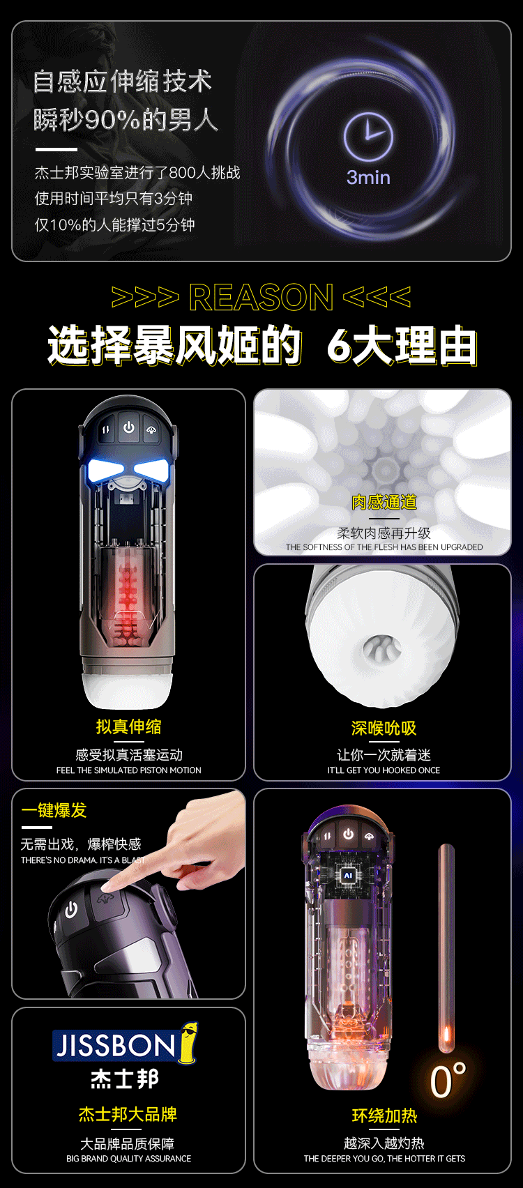 杰士邦 暴风姬全自动伸缩加温飞机杯电动自慰器男性口交神器