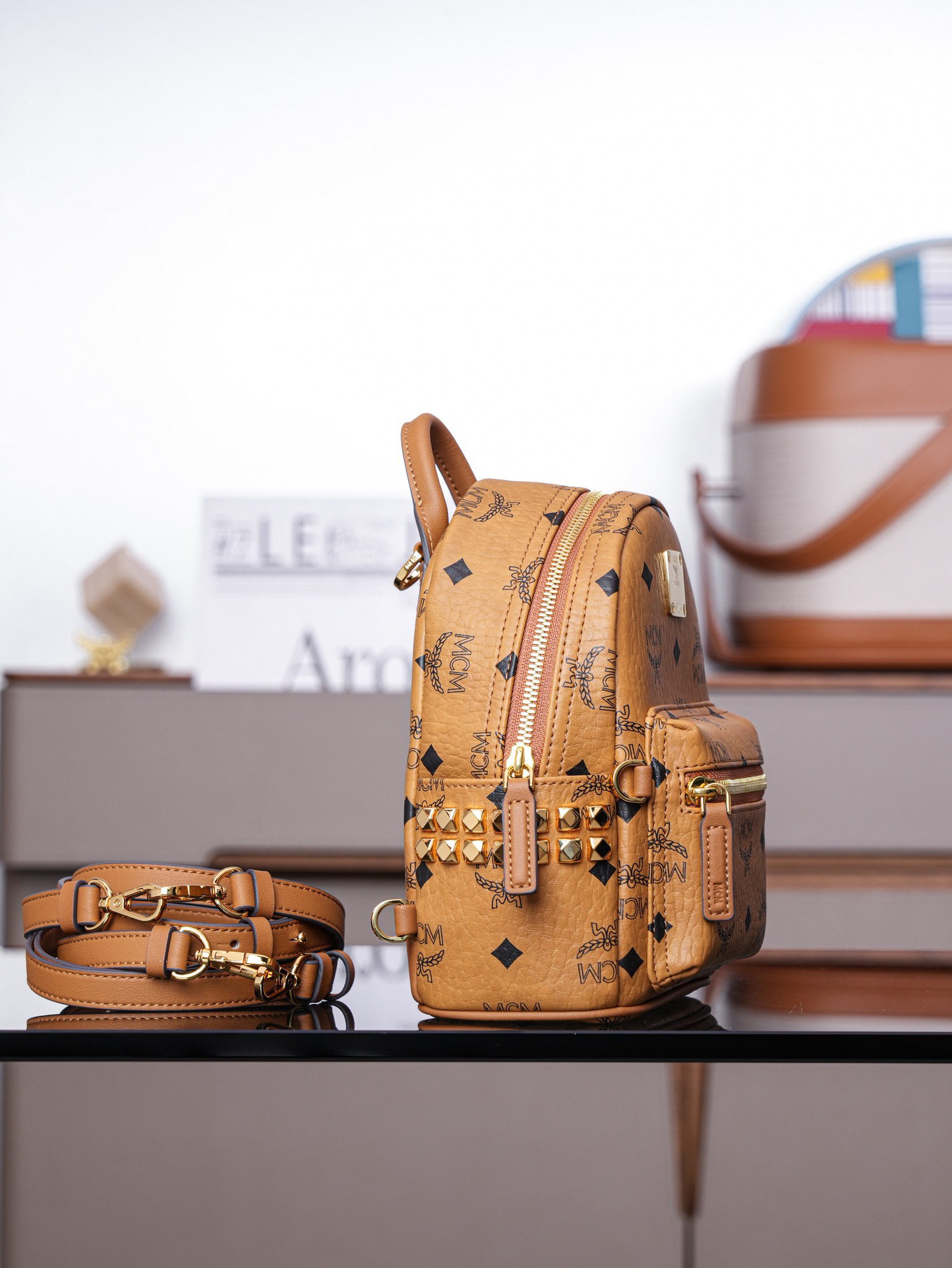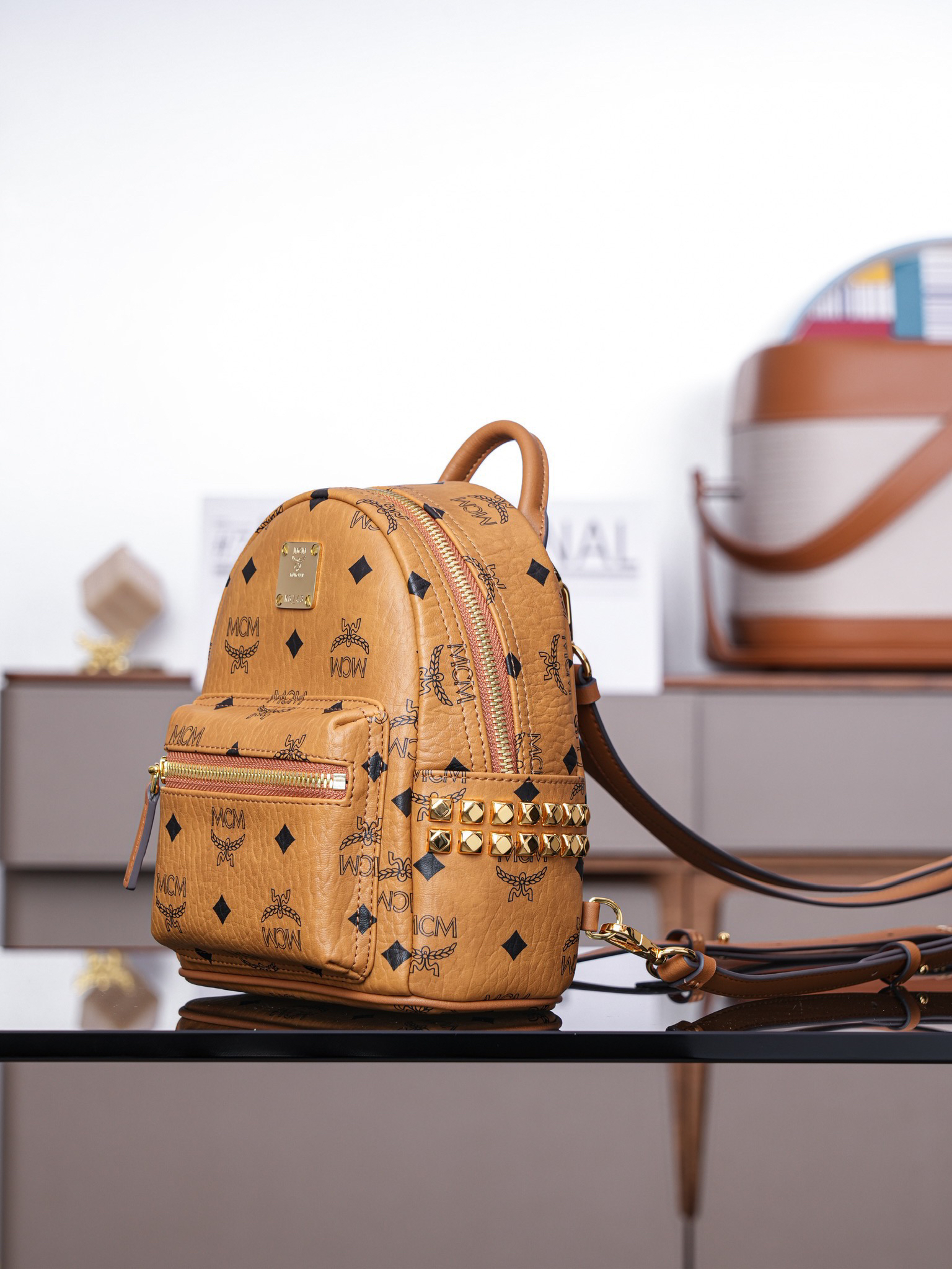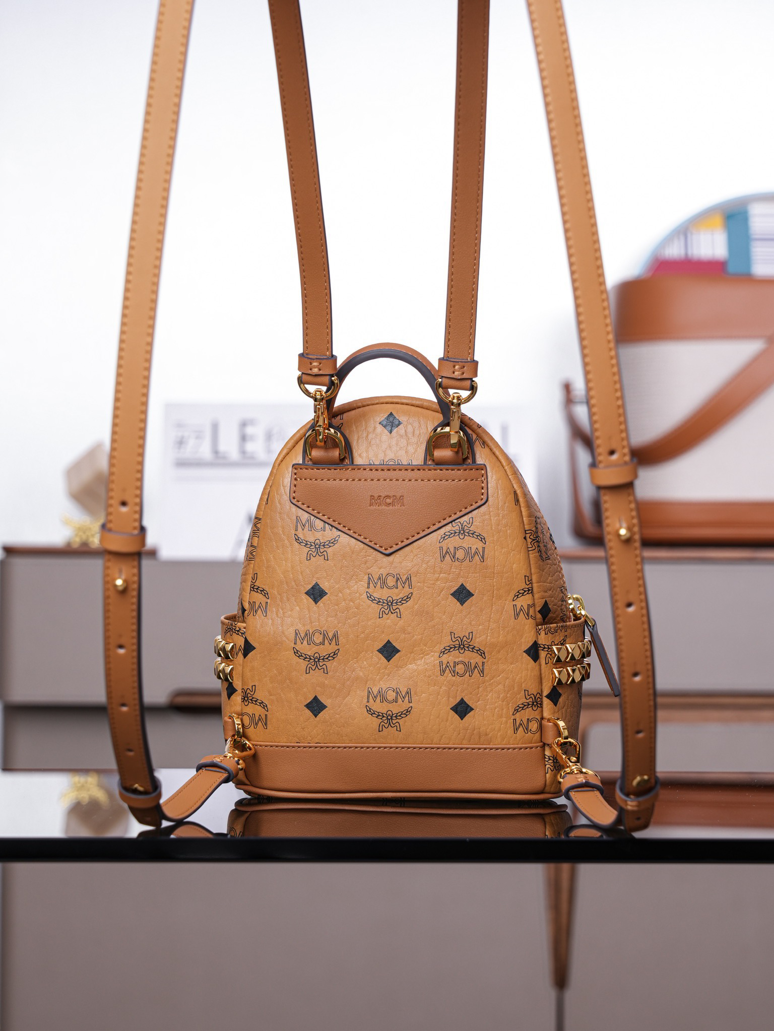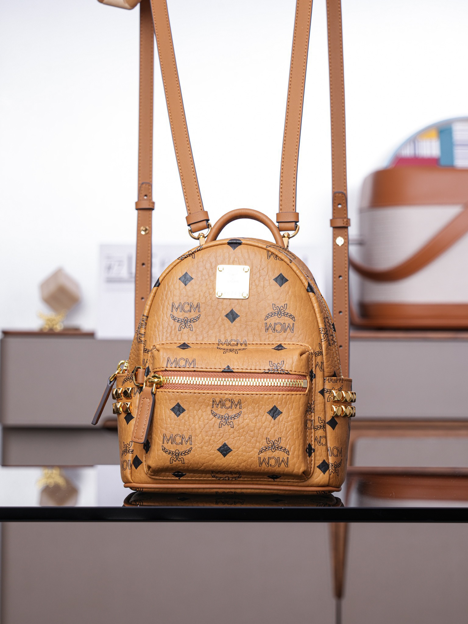 秋冬特惠💰800 原单MCM 原厂皮 超迷你干邑色 双肩包 这款迷你Stark Visetos双肩背包饰有铆钉细节MMK6SVE92CO001 经典Stark双肩背包