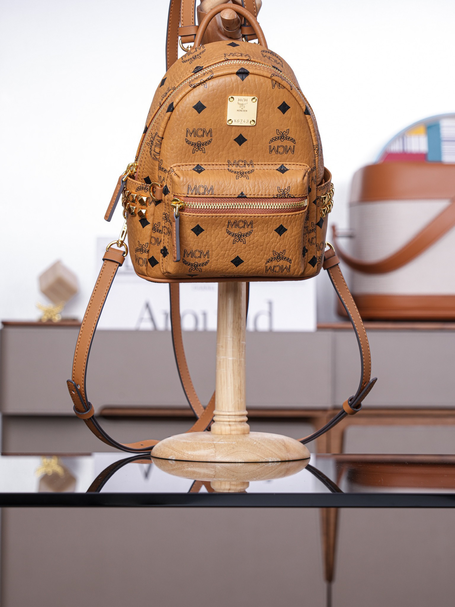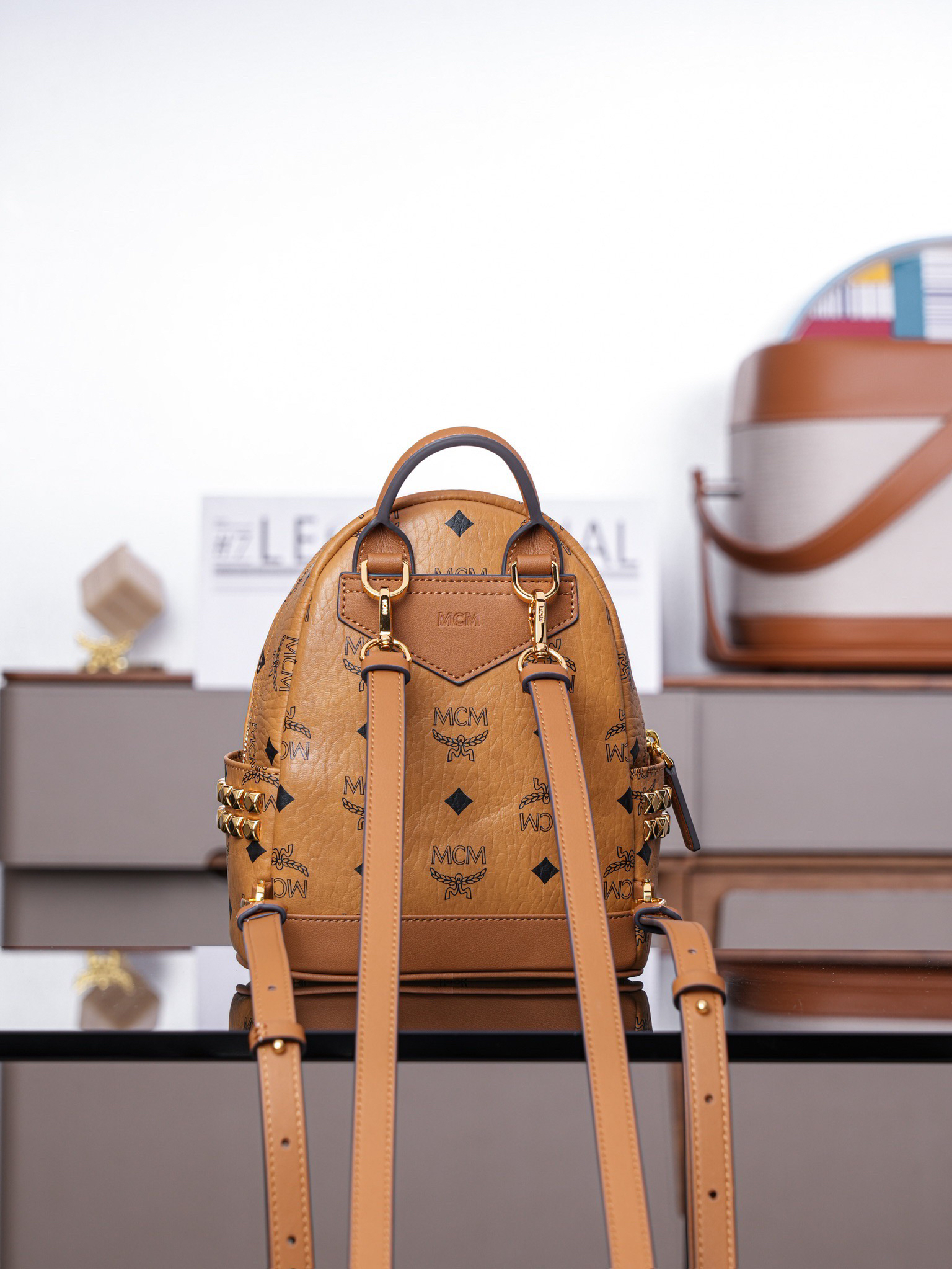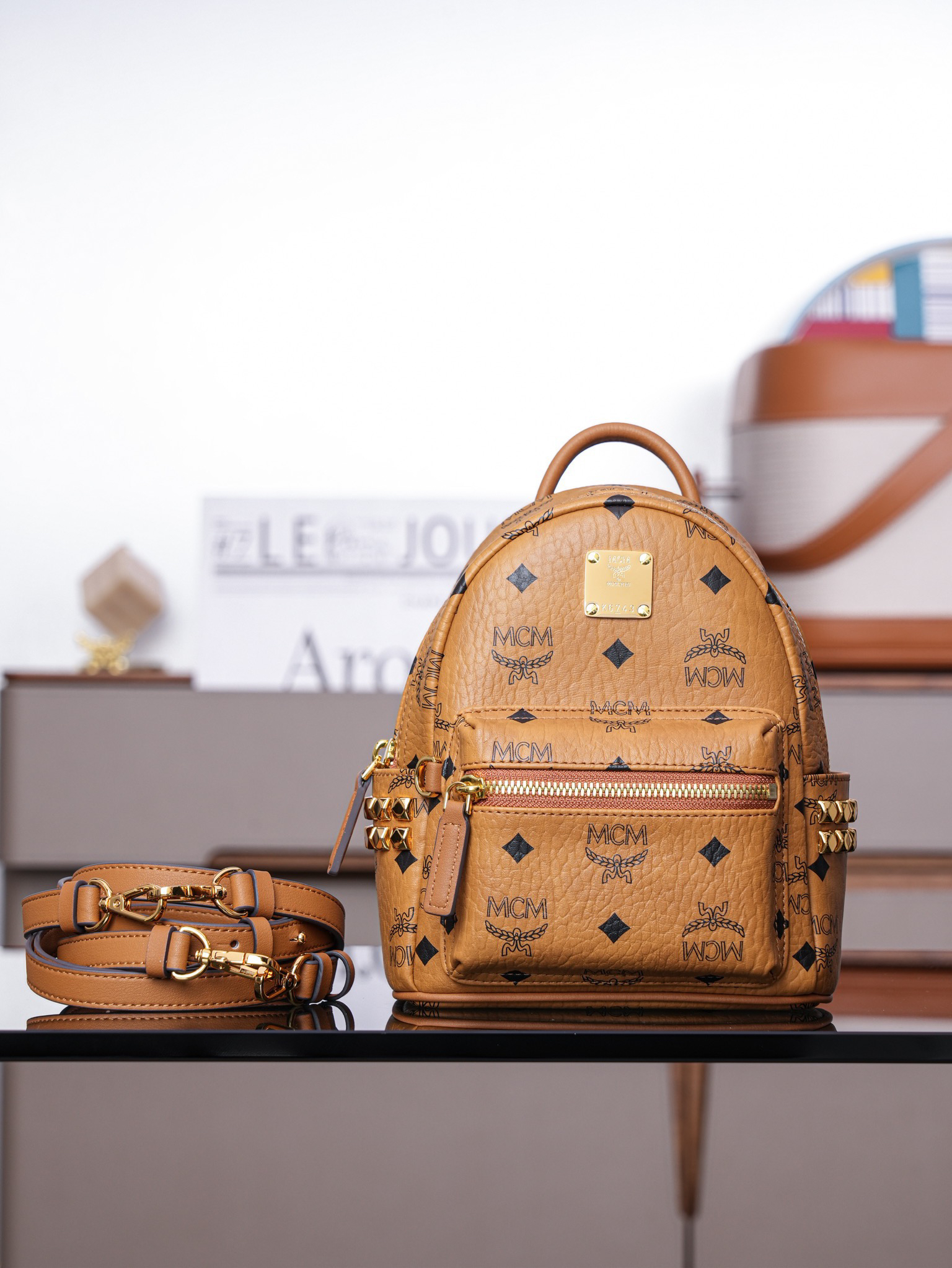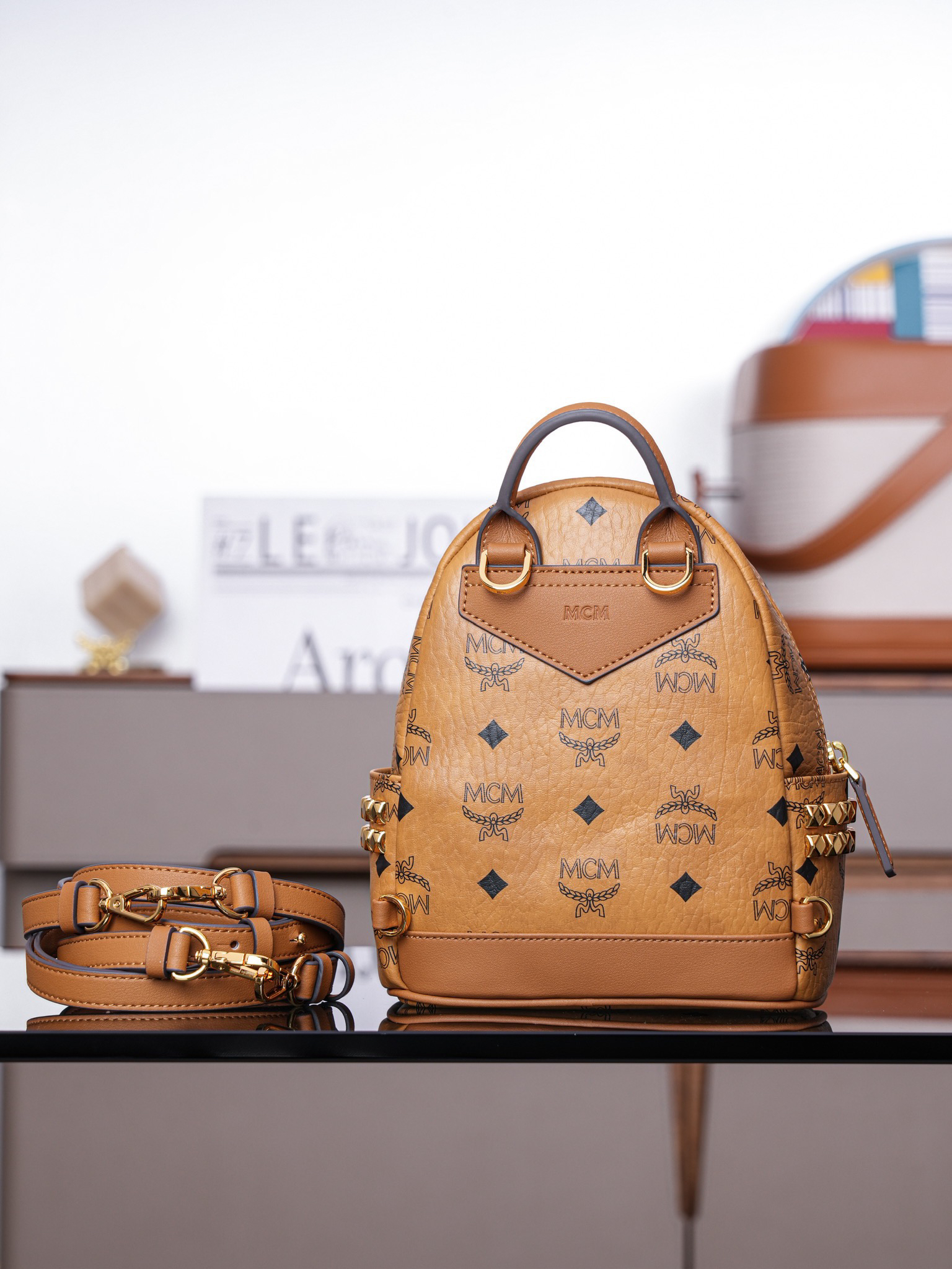 秋冬特惠💰800 原单MCM 原厂皮 超迷你干邑色 双肩包 这款迷你Stark Visetos双肩背包饰有铆钉细节MMK6SVE92CO001 经典Stark双肩背包