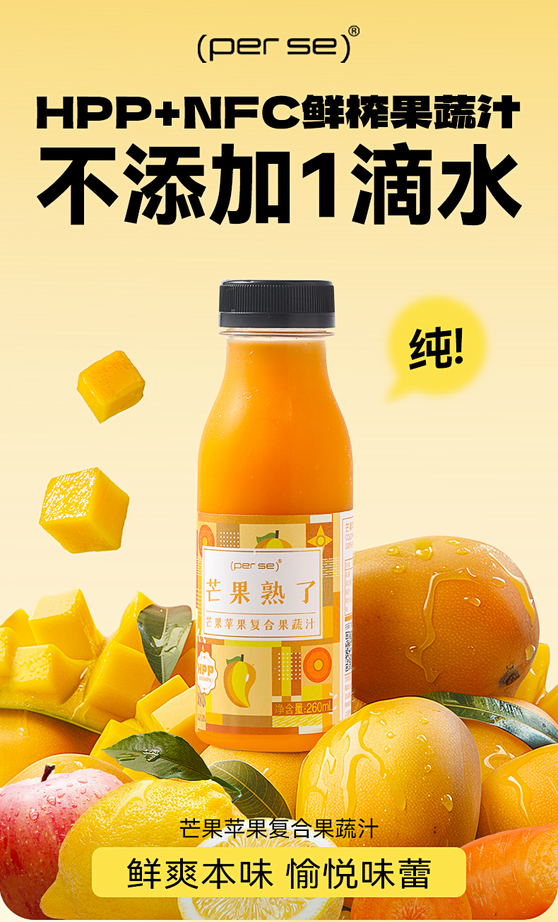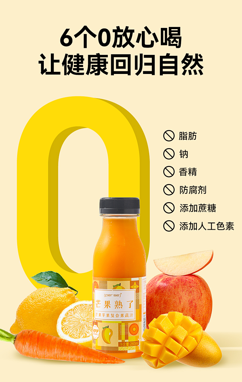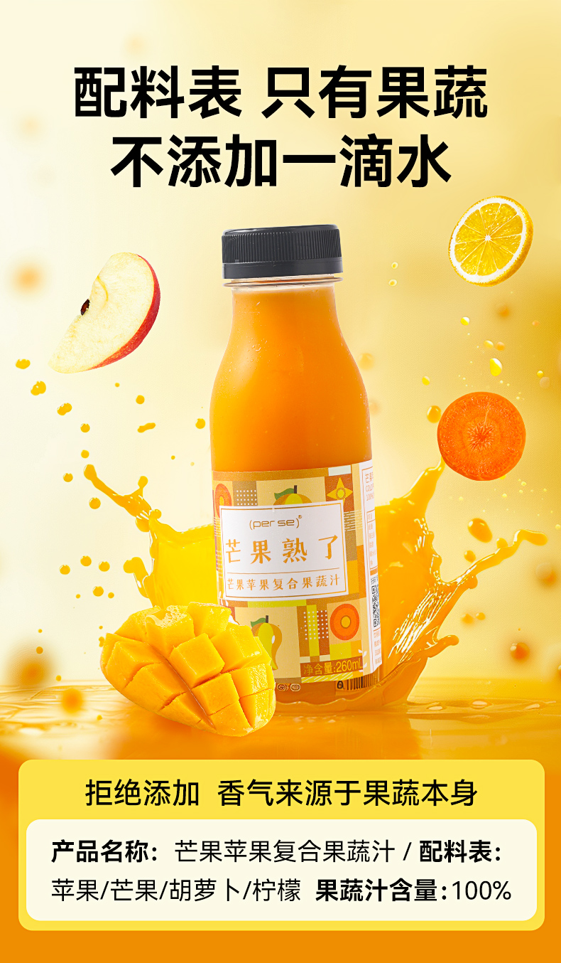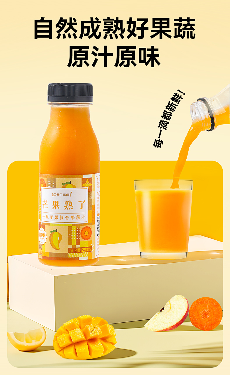 HPP芒果苹果复合果蔬汁260ml*6瓶装鲜榨纯果汁0添NFC轻断食代餐