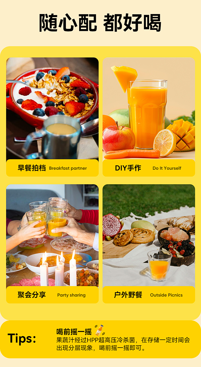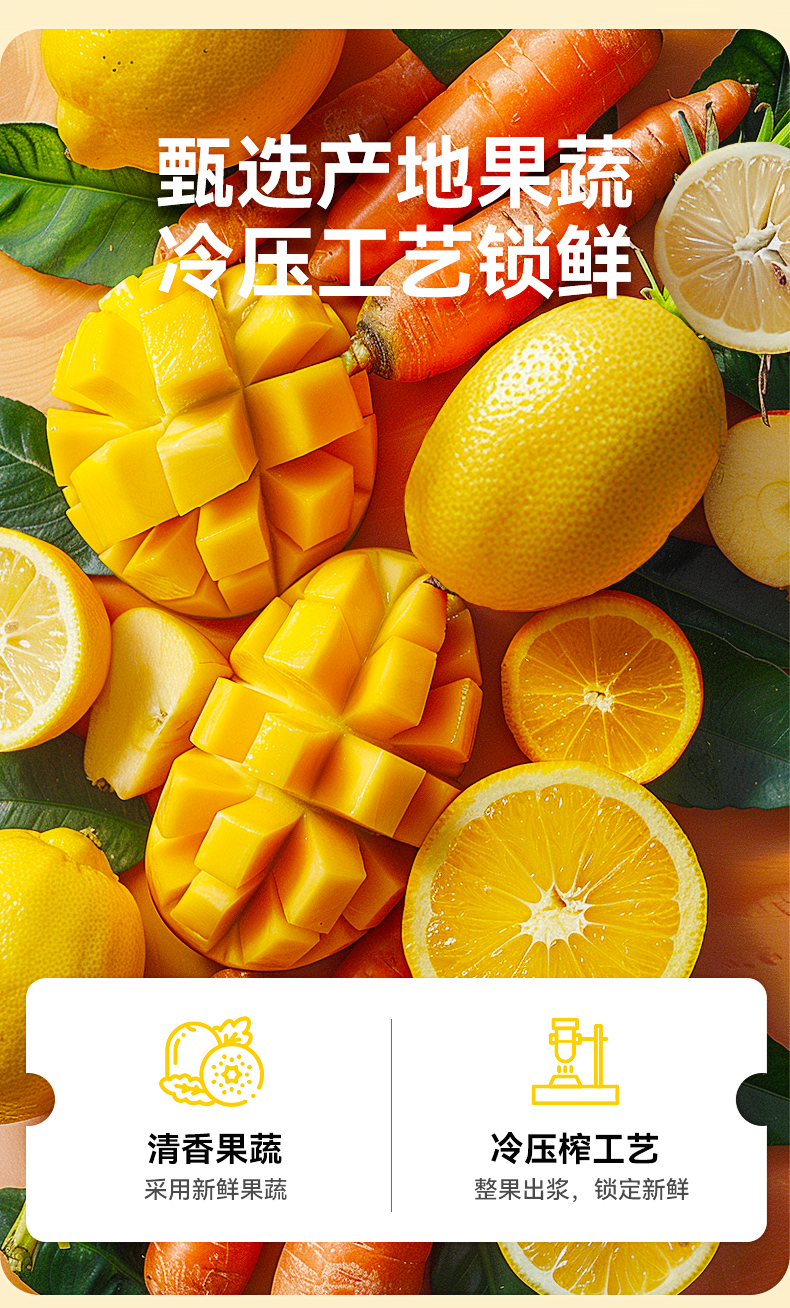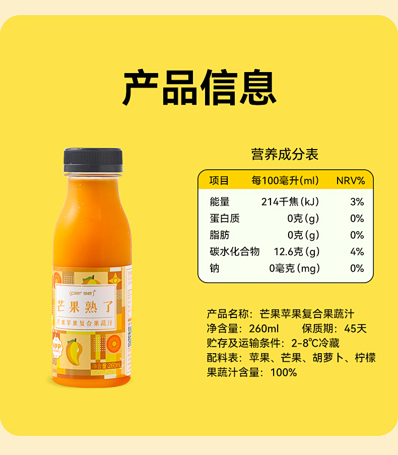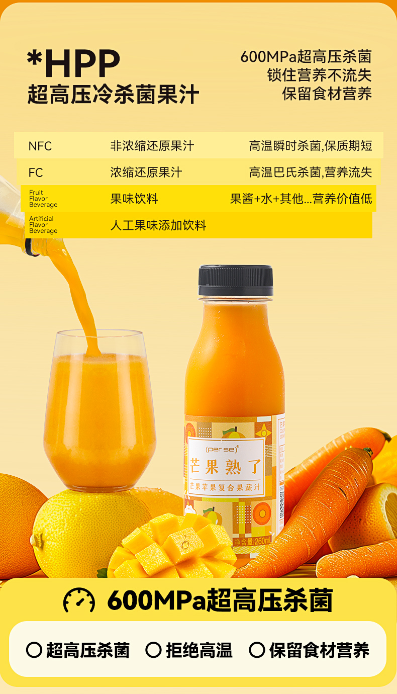 HPP芒果苹果复合果蔬汁260ml*6瓶装鲜榨纯果汁0添NFC轻断食代餐