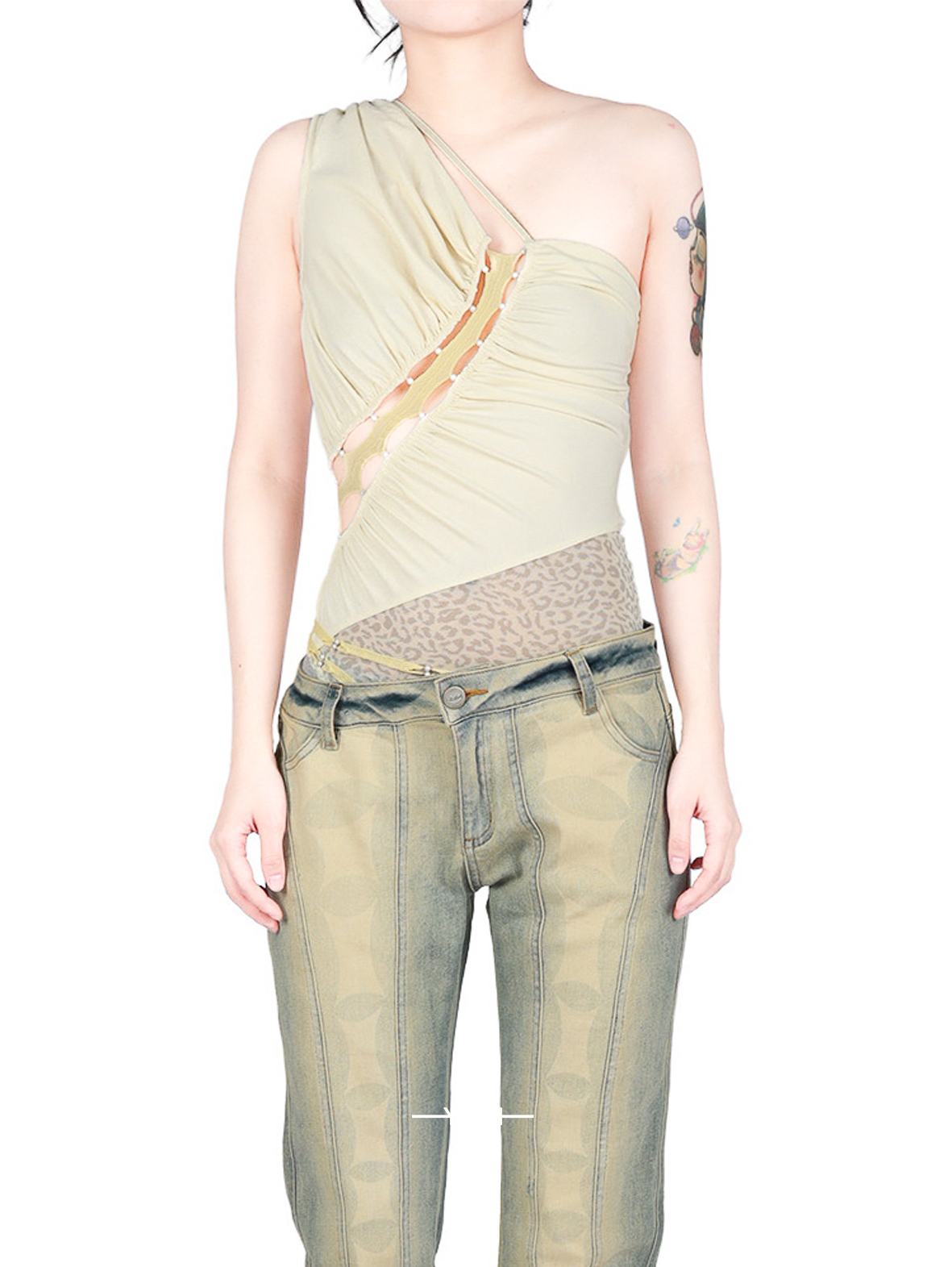单肩抽褶拼接豹纹网纱连体衣