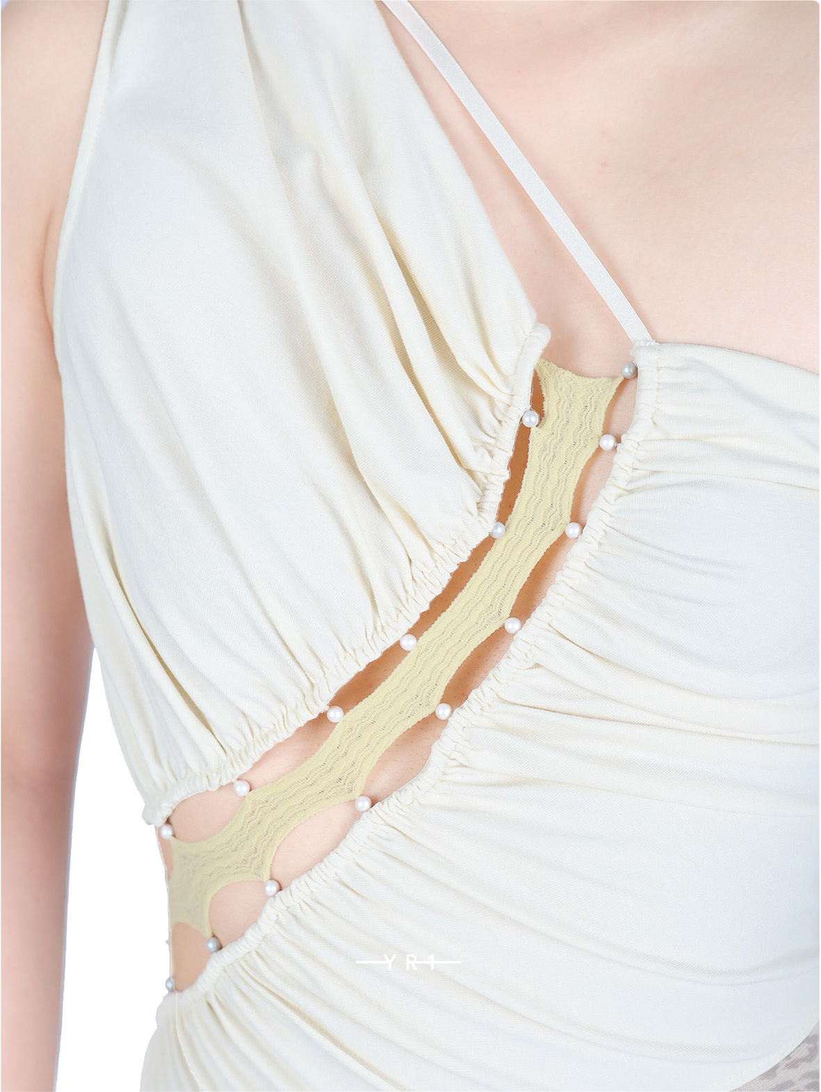 这款螺旋拼接抽褶斜肩吊带连体⾐,柔软舒适的棉⿇与弹⼒⽹纱拼接,胸前