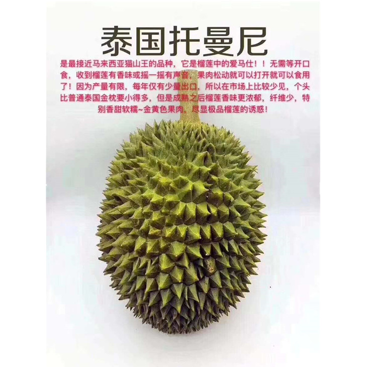 托曼尼又叫泰国猫山王!“猫山王”不愧是极品中的极品,一开盖,浓郁的香味迎面扑鼻,这种香味绝不是一般金枕能相比的。以前从未闻过如此香浓,醇厚的榴莲,沁人肺腑~!从色泽看的话,猫山王也堪称是极品。