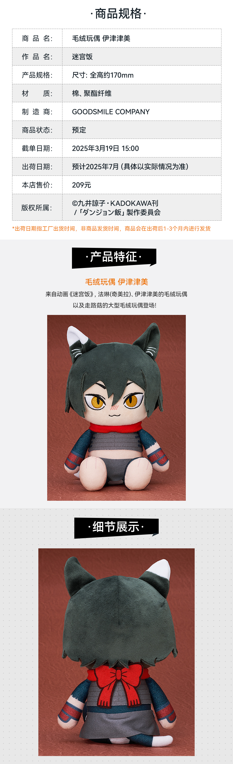 【GSC补款】毛绒玩偶 伊津津美 迷宫饭