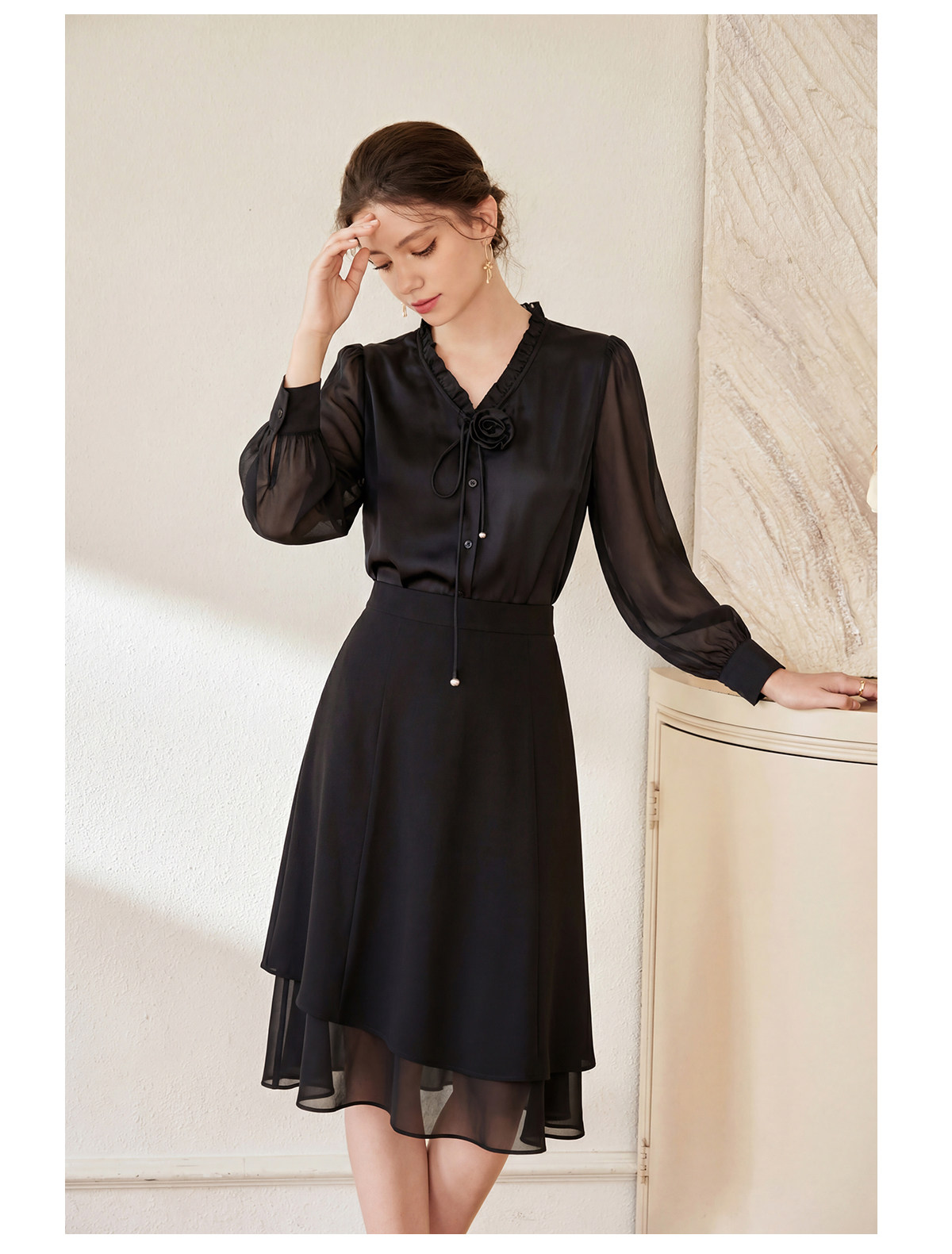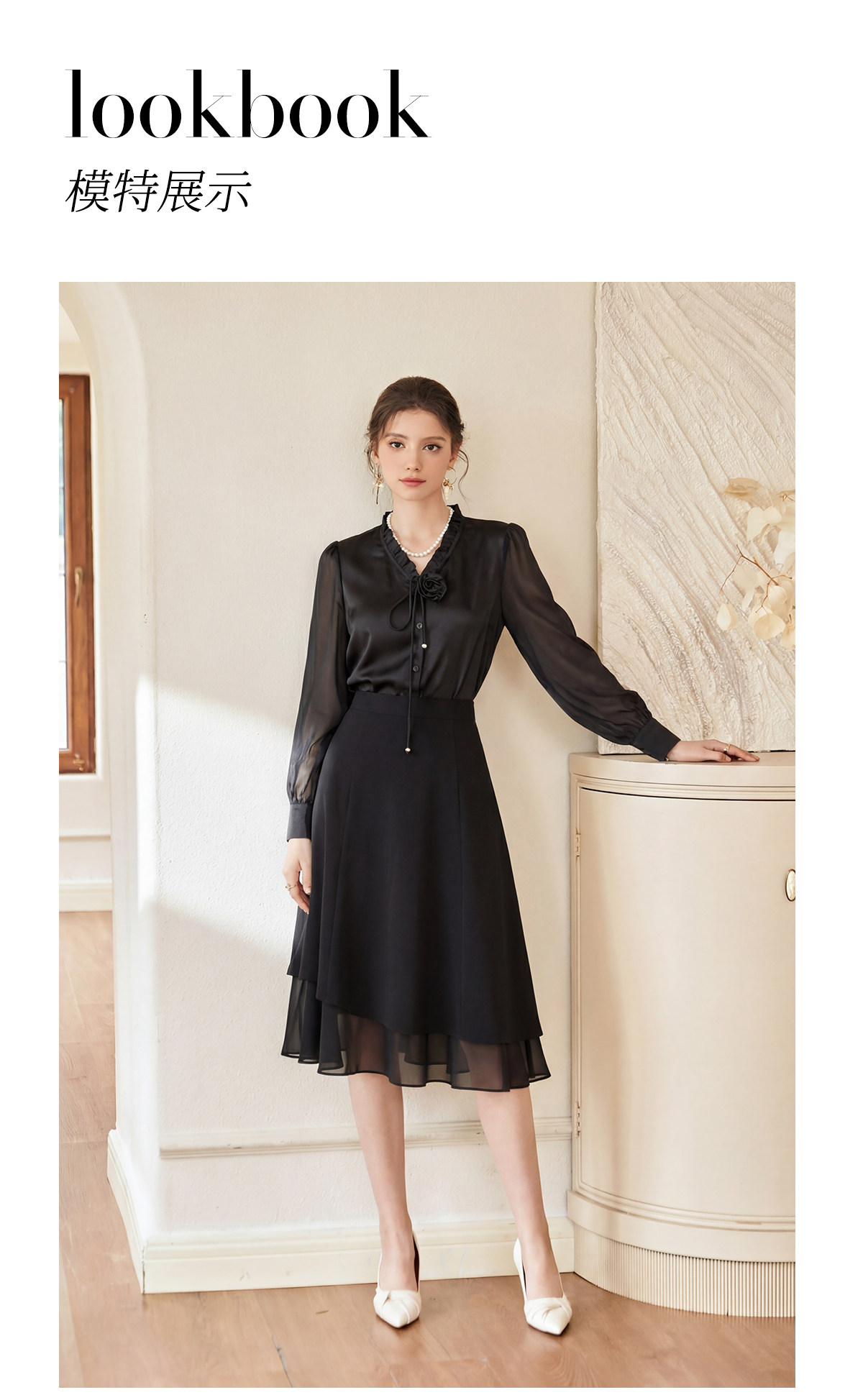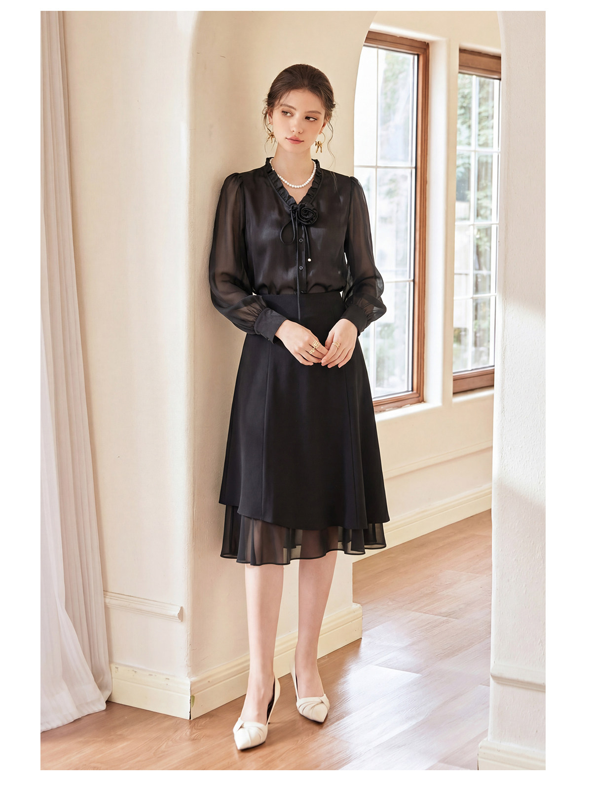 IWY/黑色灯笼袖花边领衬衫半裙两件套女收腰显瘦套装时尚新款25B757+25S777