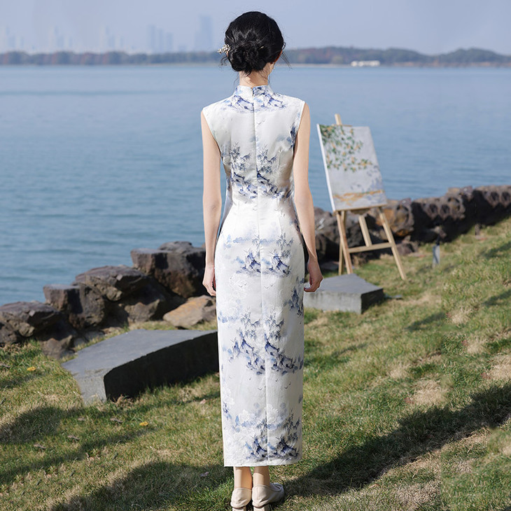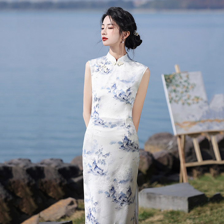 夏季青花瓷无袖新中式长款改良旗袍2025新款少女复古修身日常可穿旗袍ZA&WZY9345