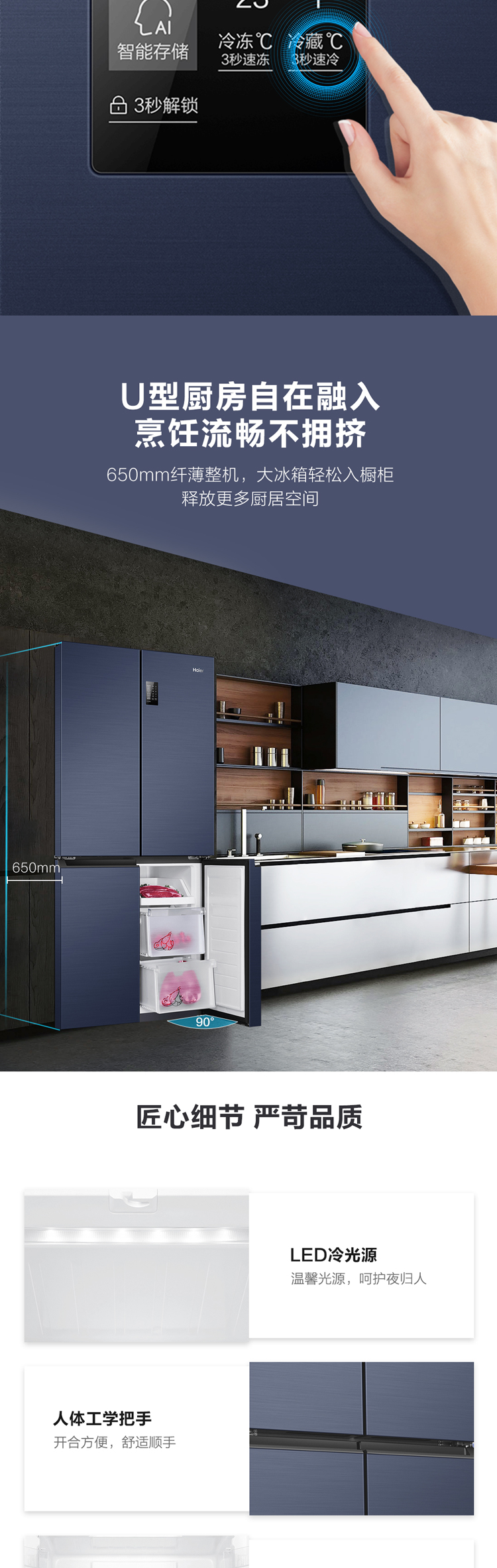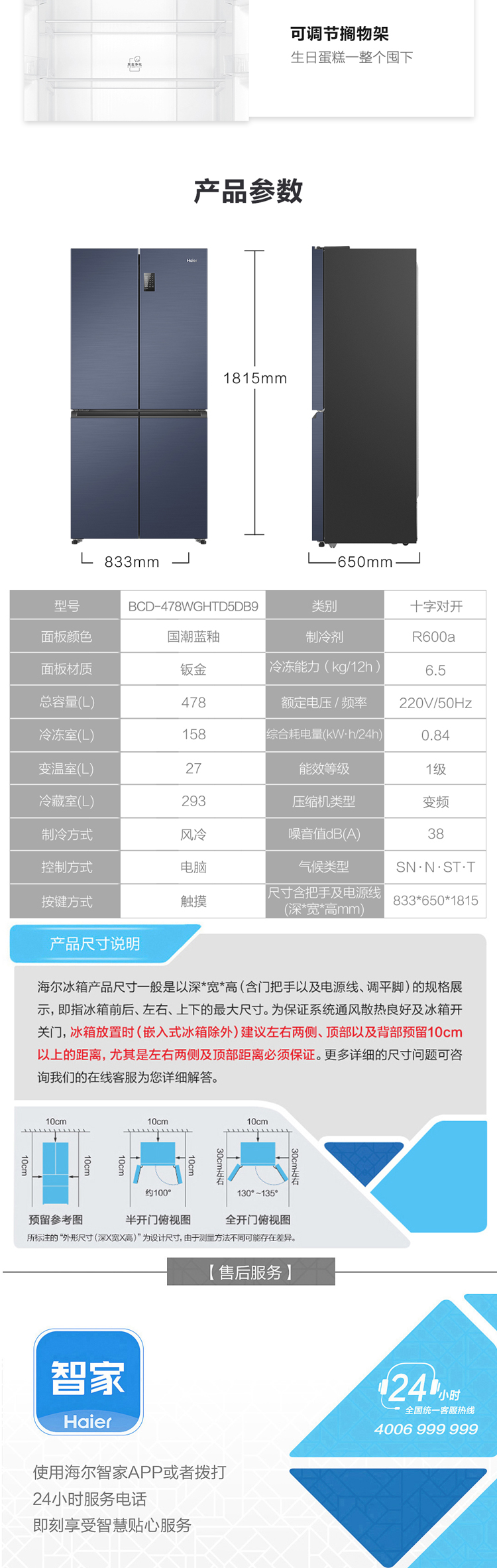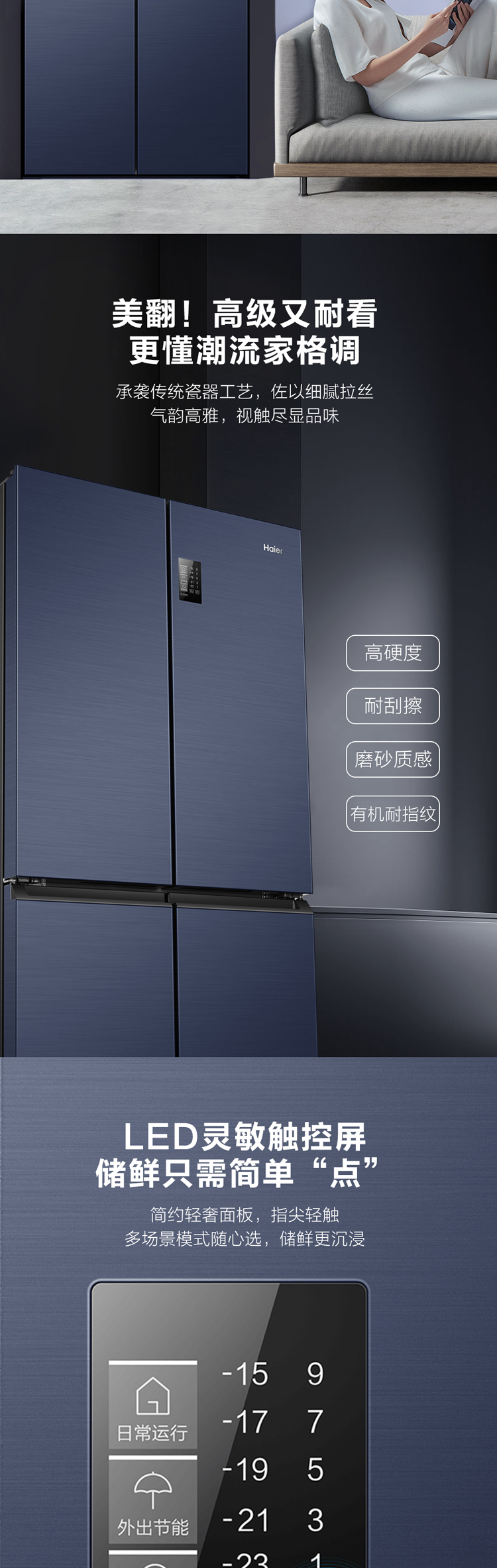 海尔478升无霜变频十字对开四开门母婴三档变温黑金净化超薄冰箱一级能效超大容量BCD-478WGHTD5DB9