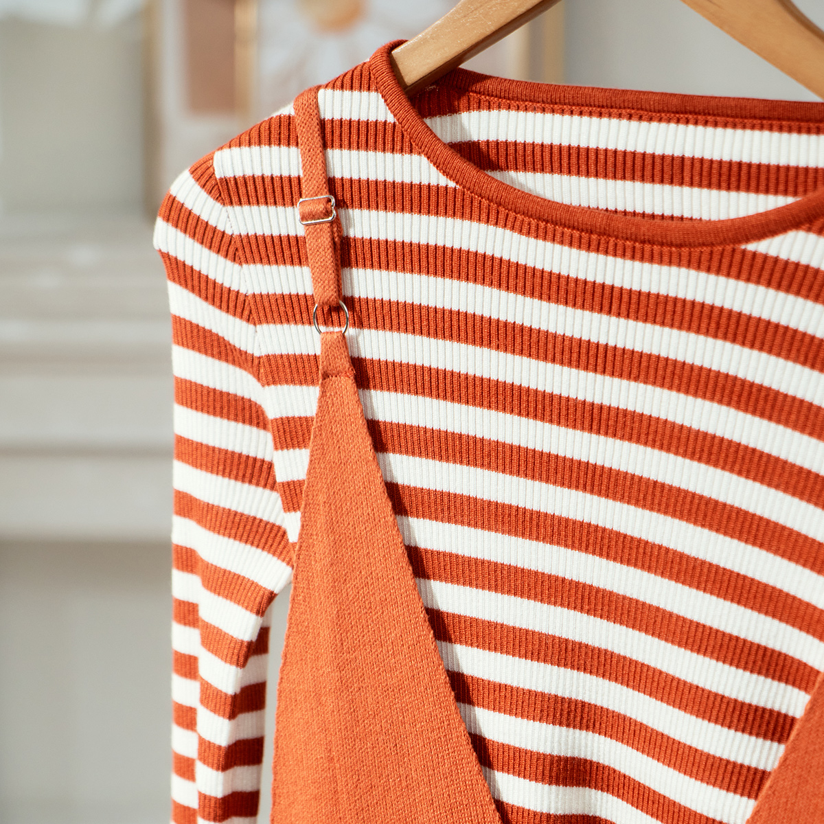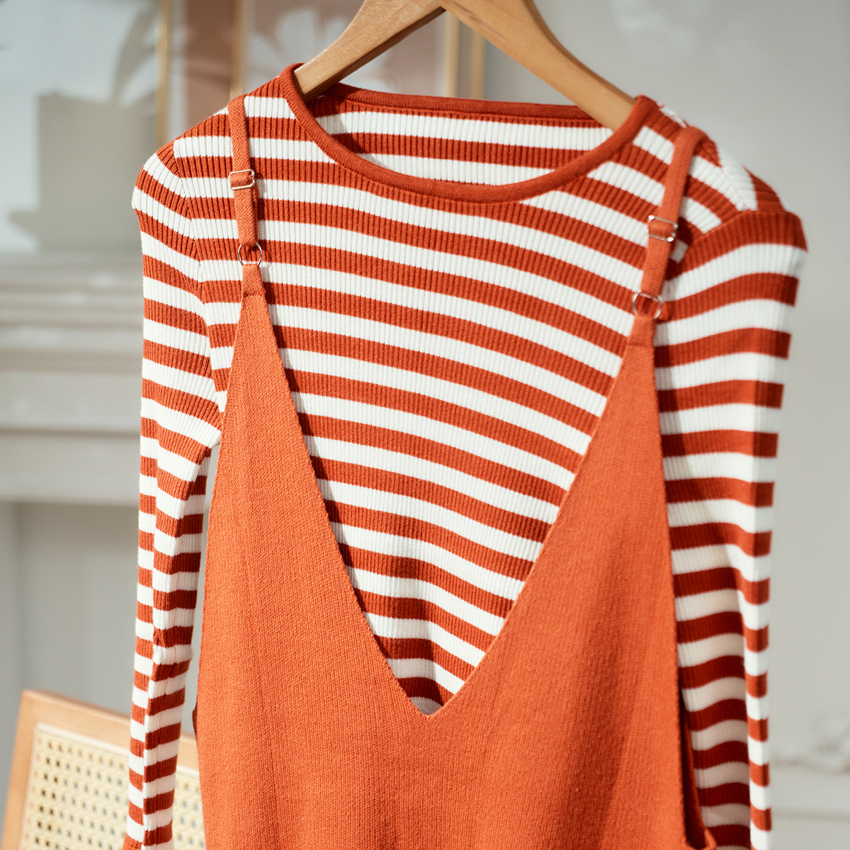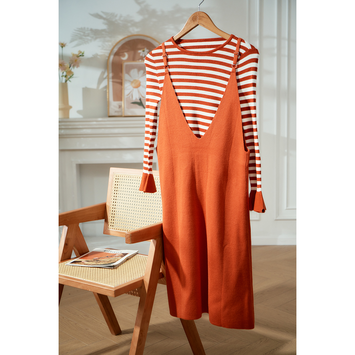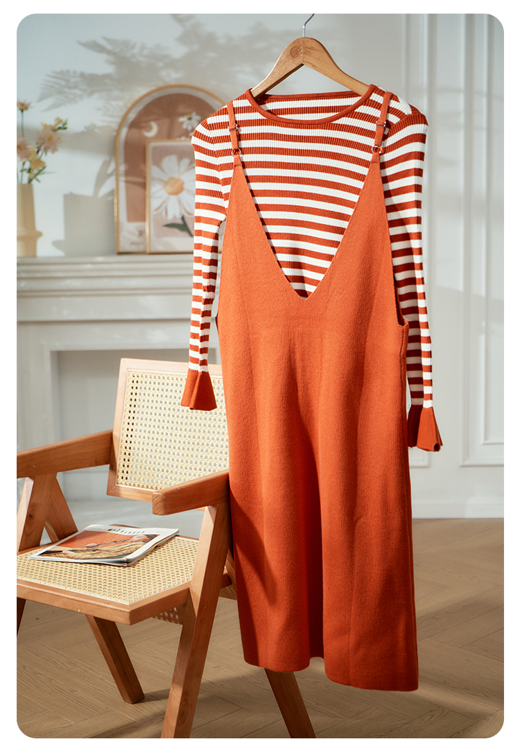欧芮儿2019春 时尚套装吊带裙女装喇叭袖针织两件套连衣裙