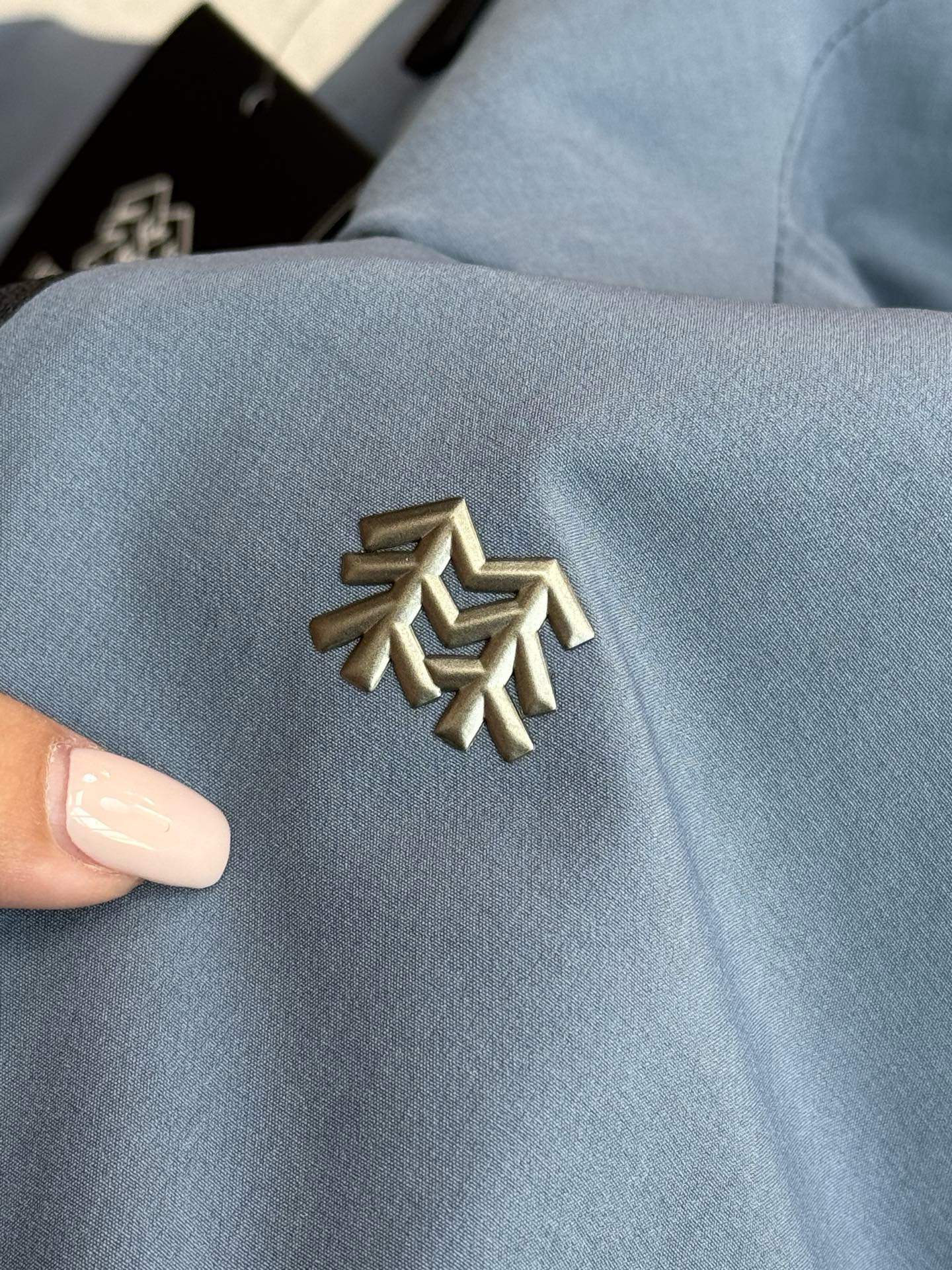 左胸位置镶嵌金属质感品牌标识,以立体几何纹理呈现,低调中彰显品牌辨识度。