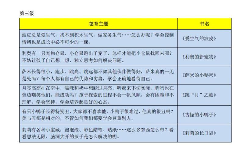3.每册绘本都含有特定的德育主题,关注孩子的心灵成长、德育发展;