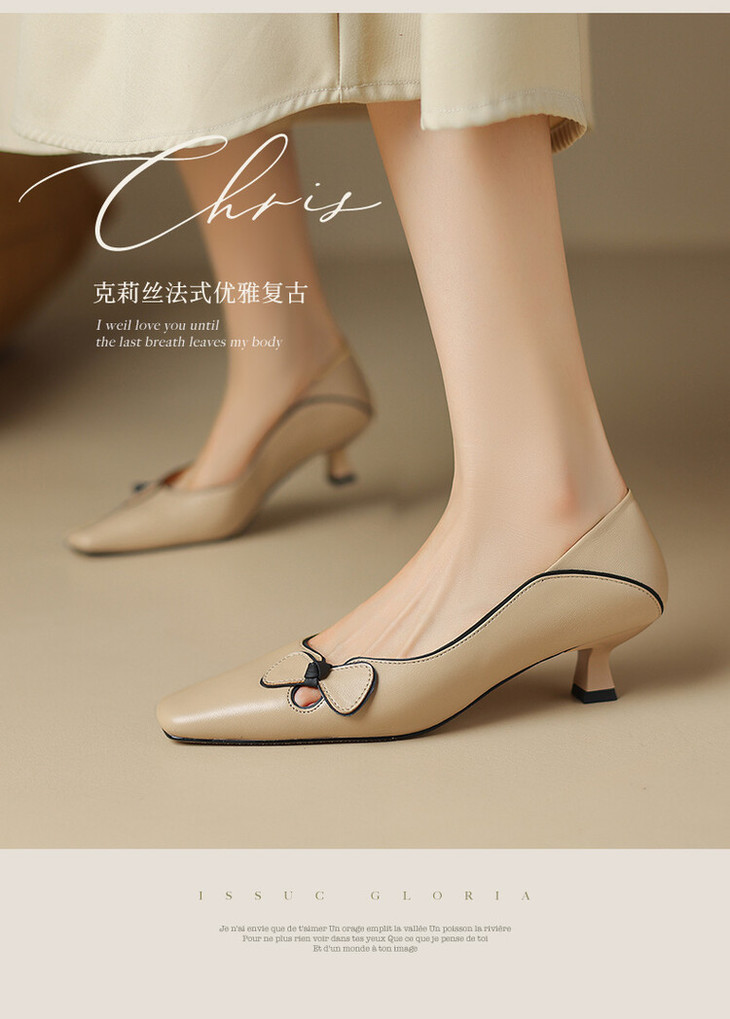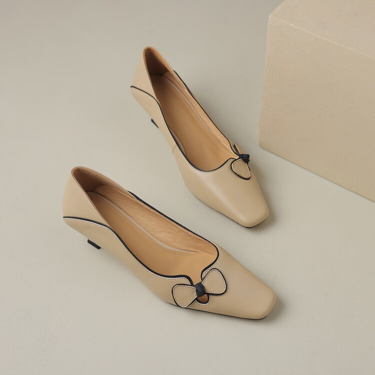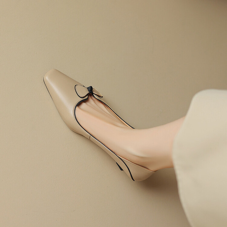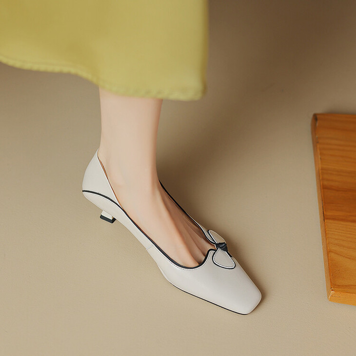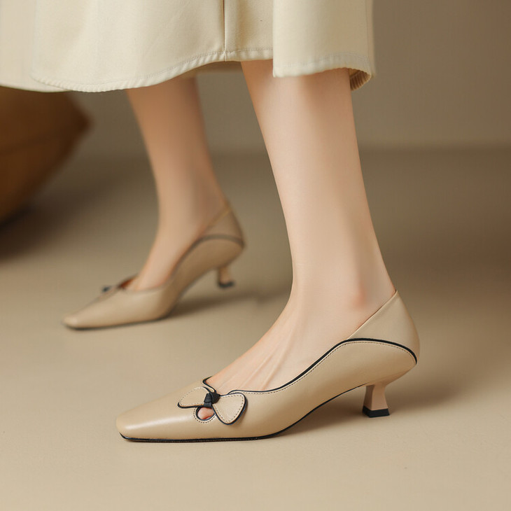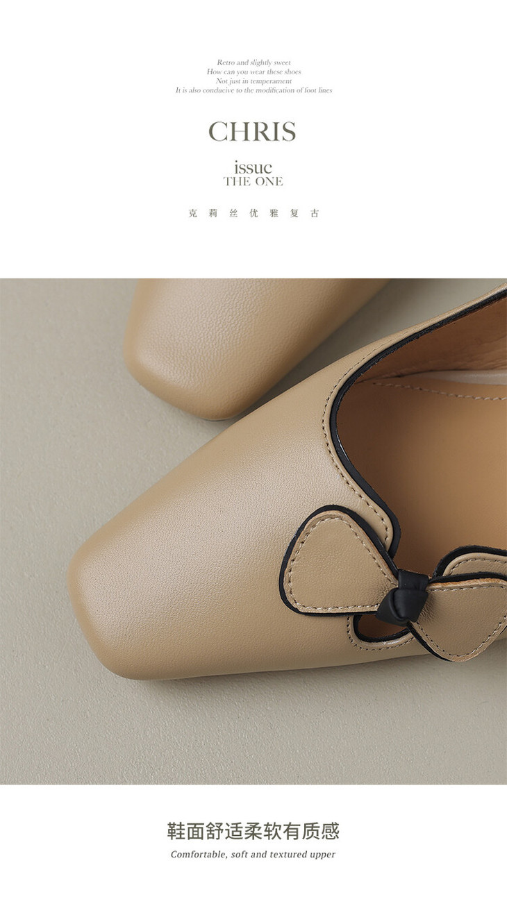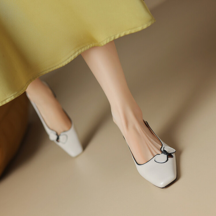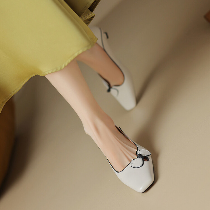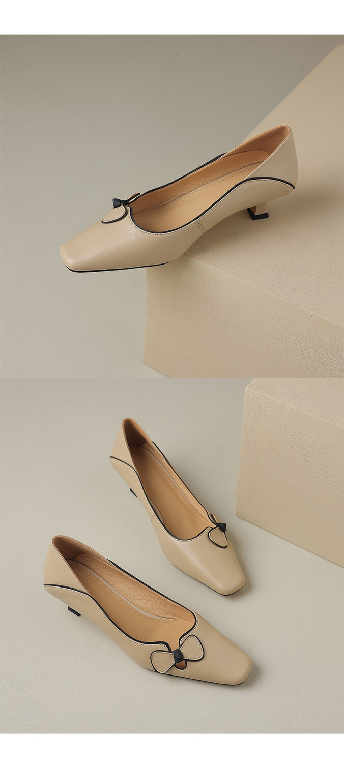 【预售5天】法式简约小方头浅口拼色蝴蝶结细跟软面中跟单鞋WC&M8219
