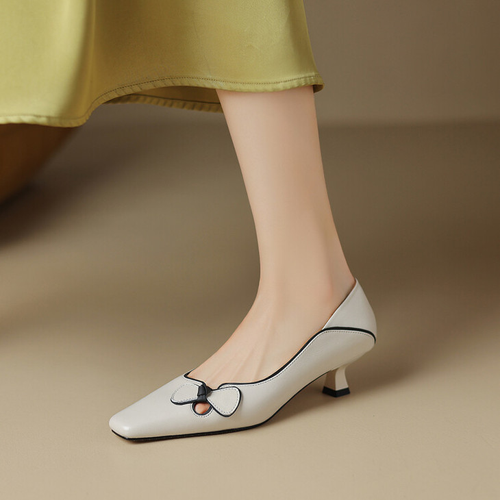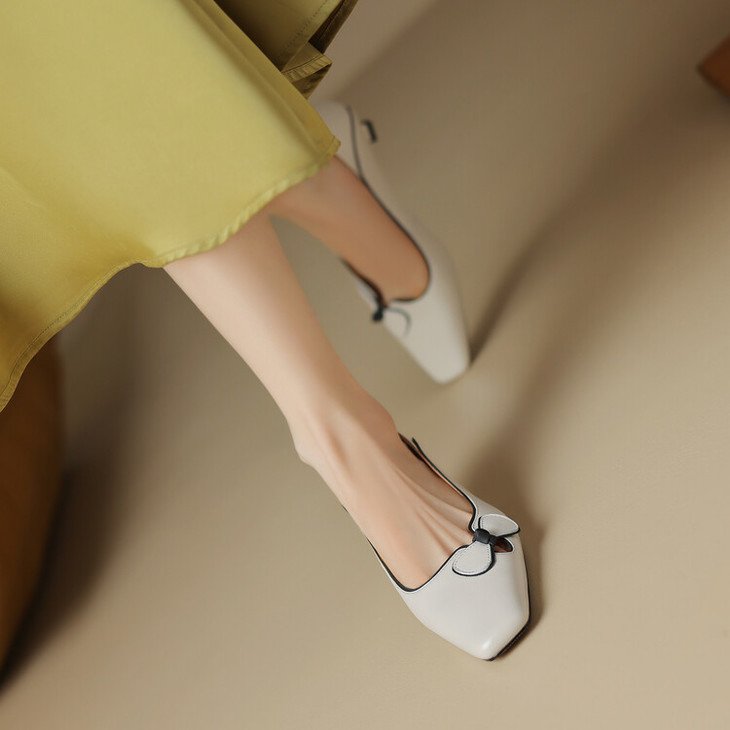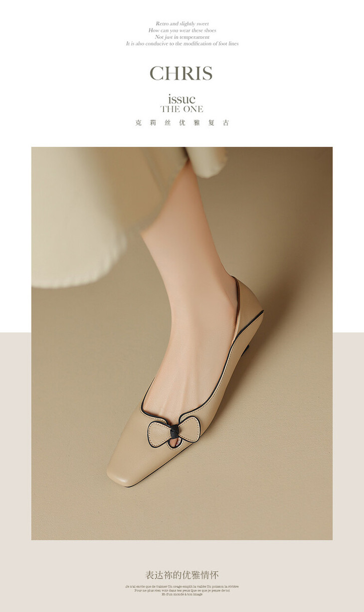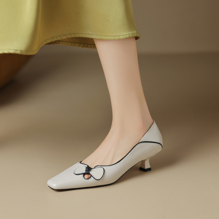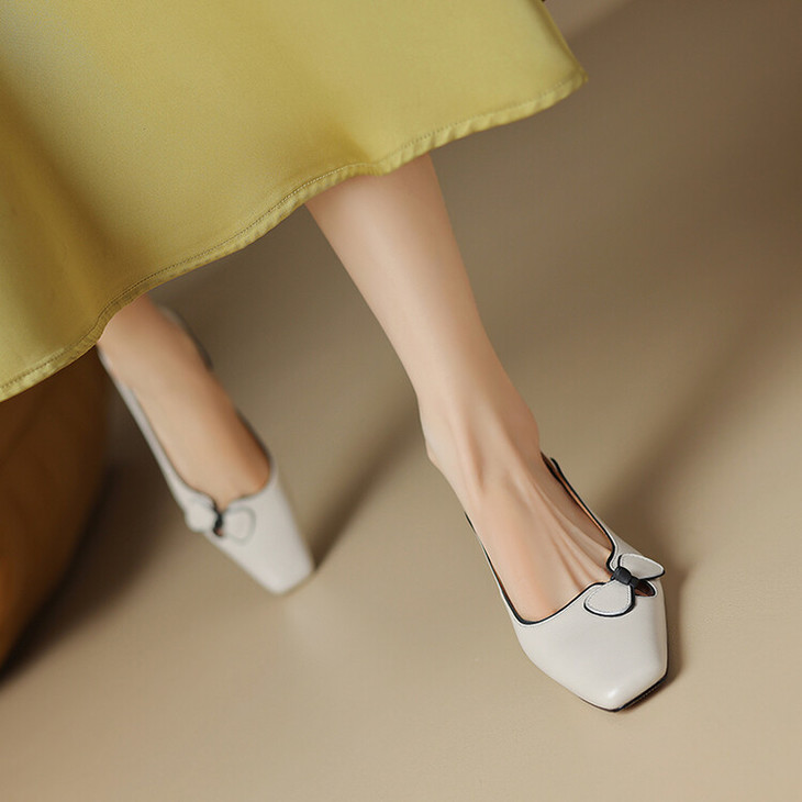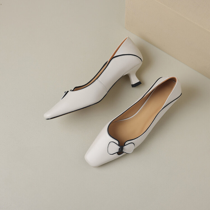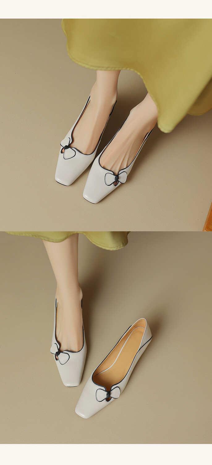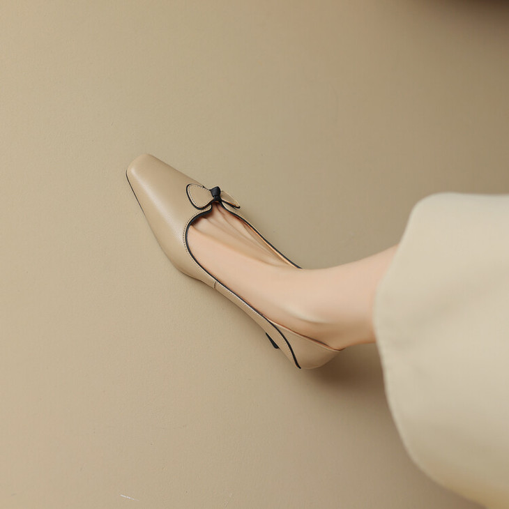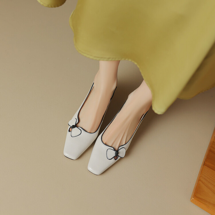 【预售5天】法式简约小方头浅口拼色蝴蝶结细跟软面中跟单鞋WC&M8219