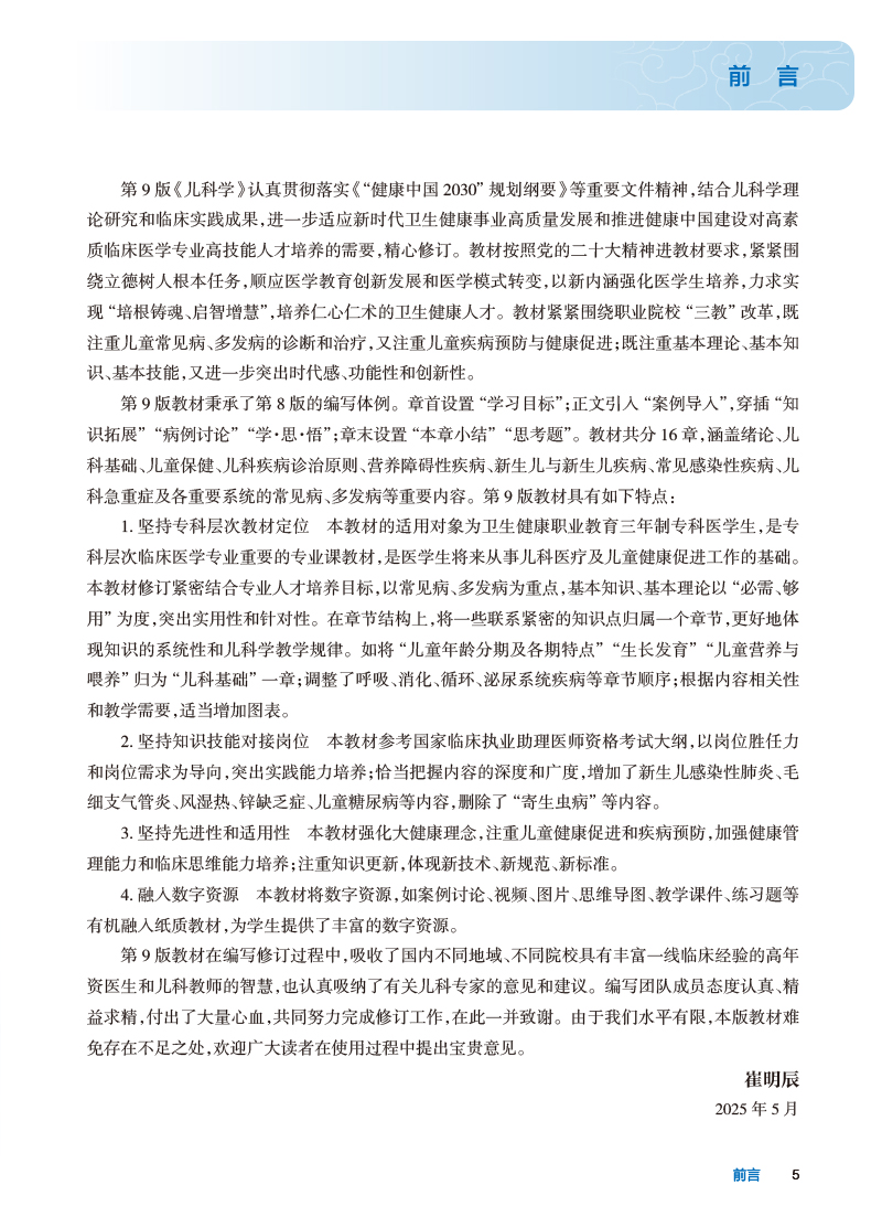 儿科学 第9九版 十四五规划教材 全国高等职业教育专科教材 崔明辰 主编 供临床医学专业用 9787117376174人民卫生出版社