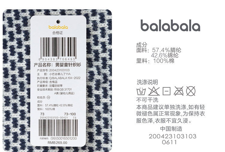 巴拉巴拉婴儿毛衣儿童冬季打底衫宝宝男童针织衫套头时尚帅气有型
