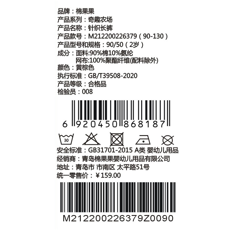 棉果果夏季新品男童纯棉凉感针织长裤M212200226379