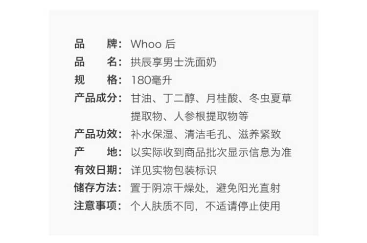 【中欧班列精选】 Whoo 后 拱辰享男士洗面奶 拱辰享君泡沫洁面膏 180mlYLPY