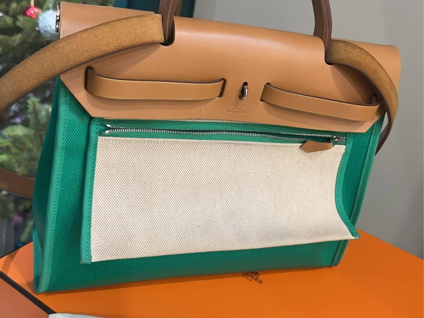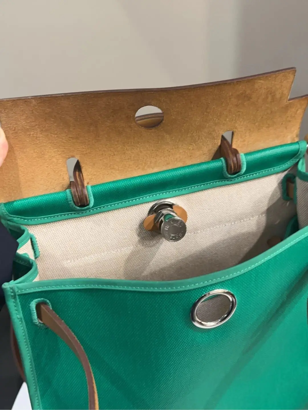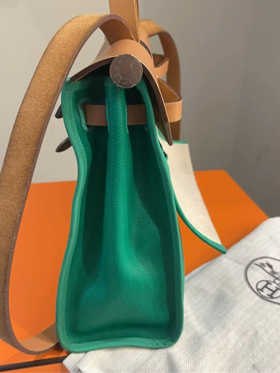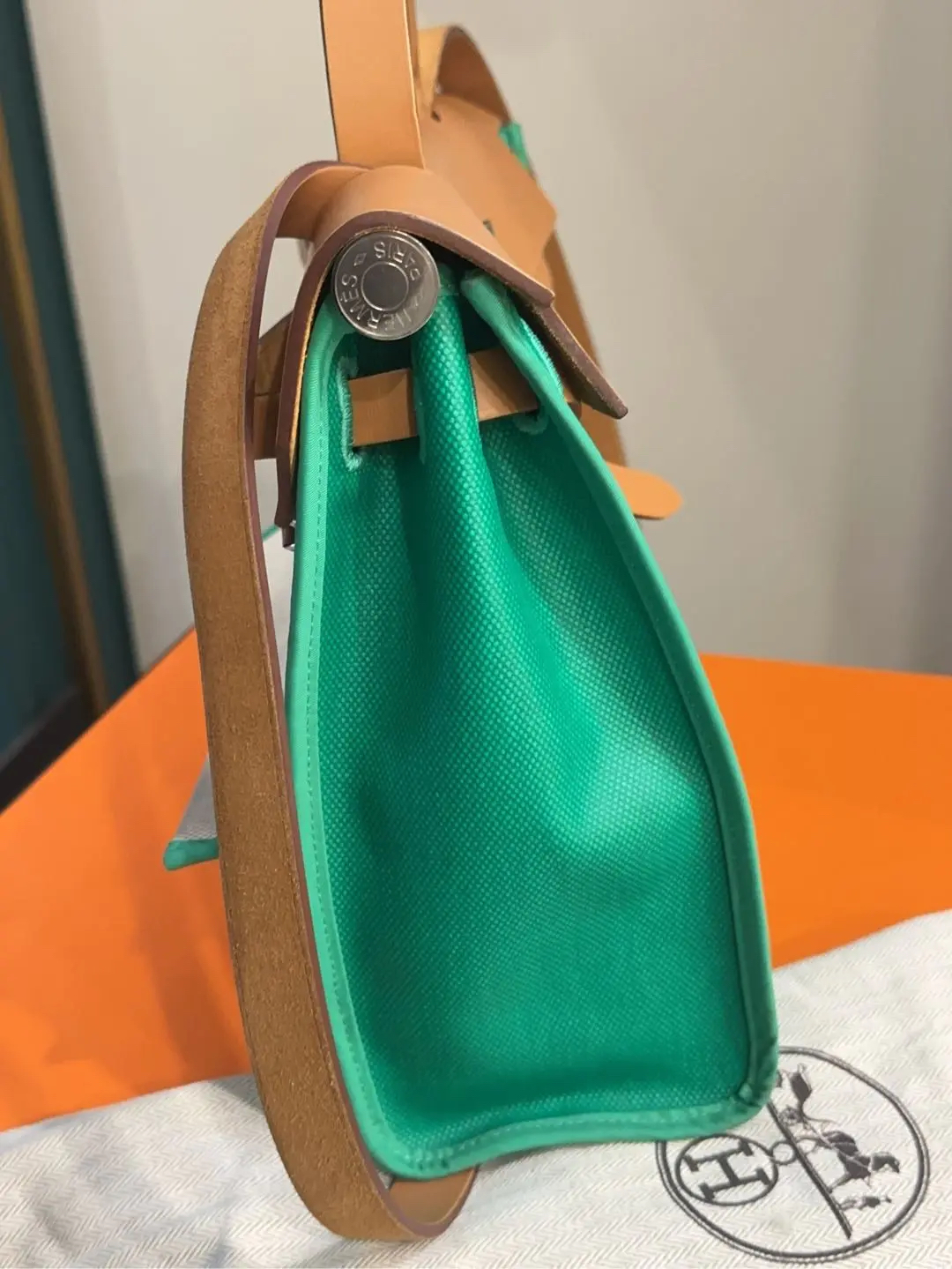 【商品详情】正品二手 爱马仕 Herbag 31 帆布拼皮 薄荷绿拼米色 斜挎包🥃97新 31*26 U刻 配件:吊牌 票 防尘袋 盒子。轻便舒适休闲。