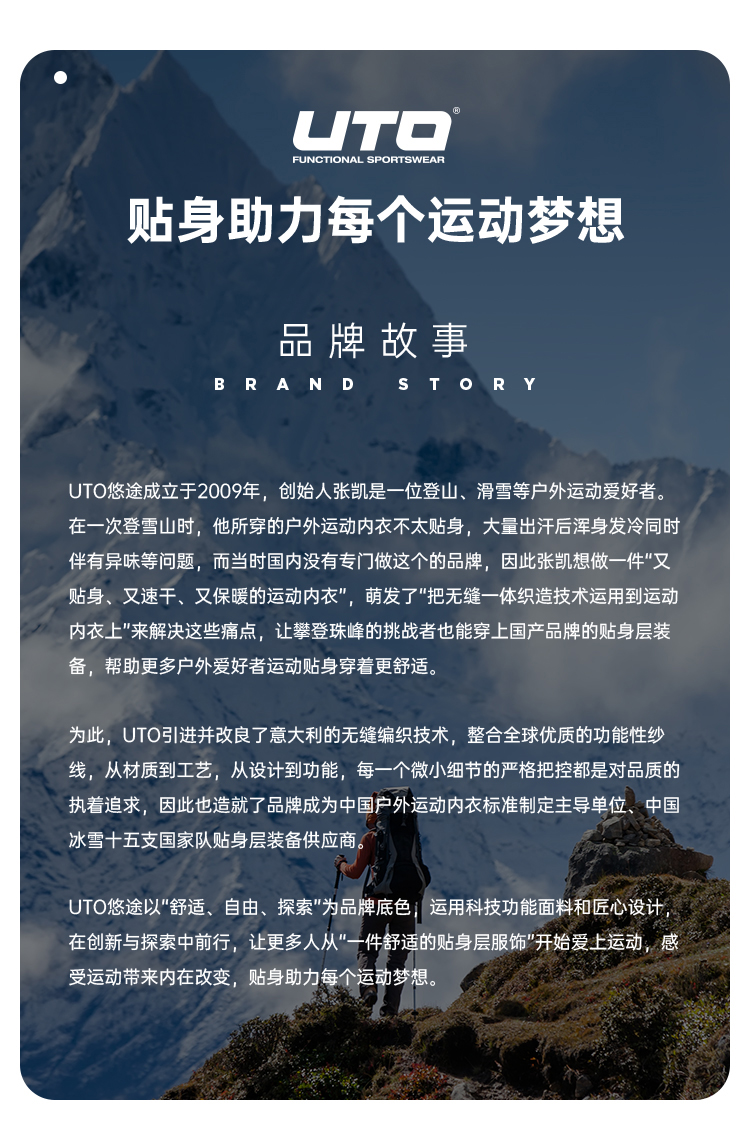 UTO悠途潜心于贴身运动装备的研发、设计和生产。从纤维到组织,从设计到工艺,在无缝贴身运动装备领域,树立国内标杆。 UTO着力于品牌互联网化,不断采集大量运动数据,为跑步、健身、滑雪等不同类型的运动爱