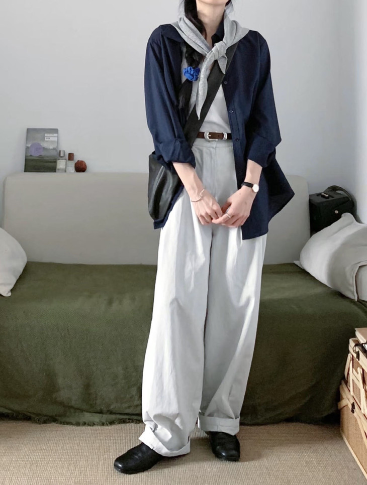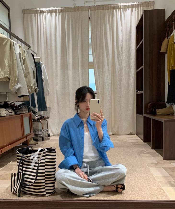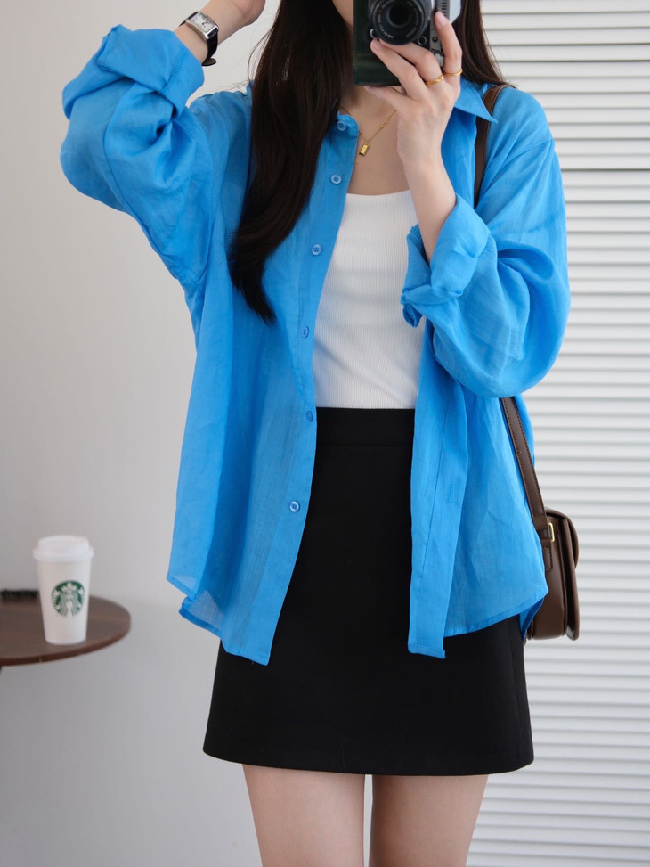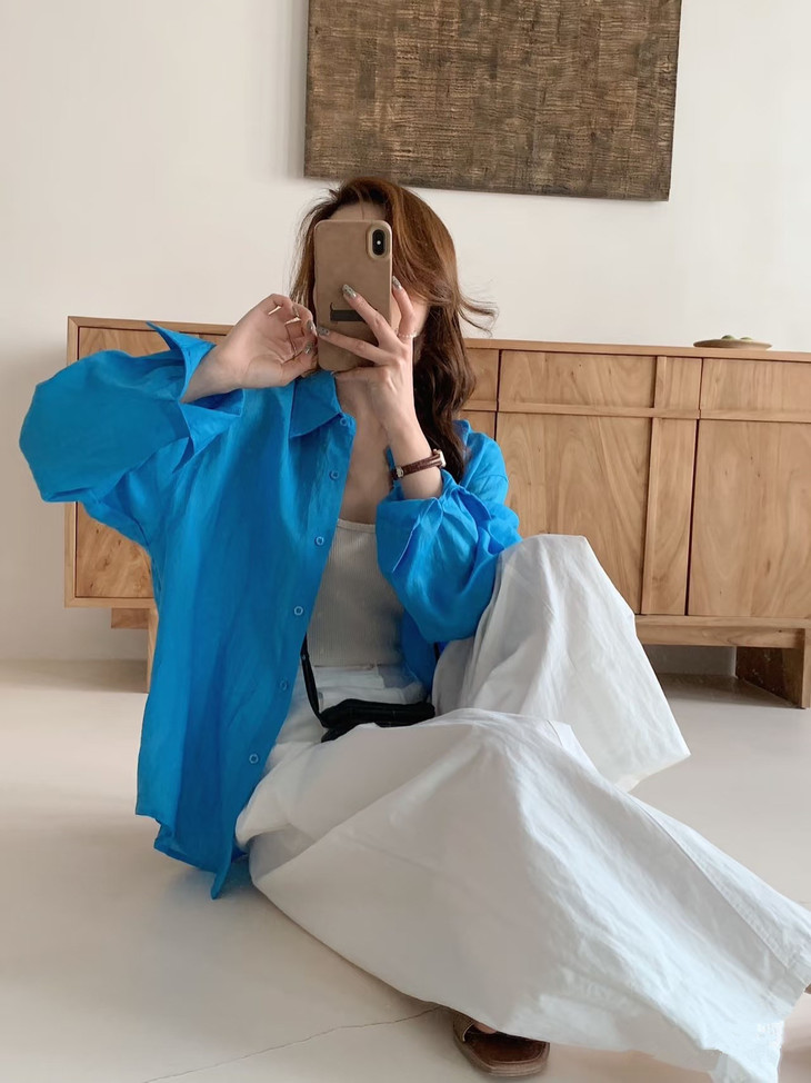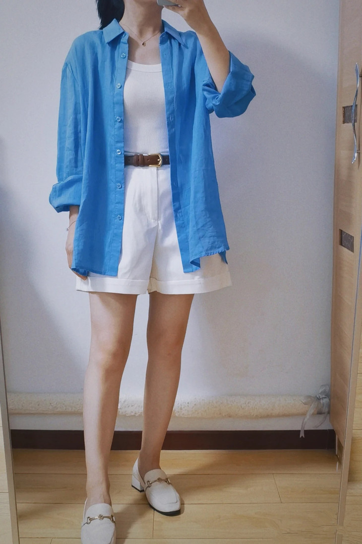 夏日显白神器湖蓝色衬衫春夏到了我还蛮喜欢出这种显白鲜亮的颜色真的是简洁大方到极致散发出干净、纯粹的气质!!