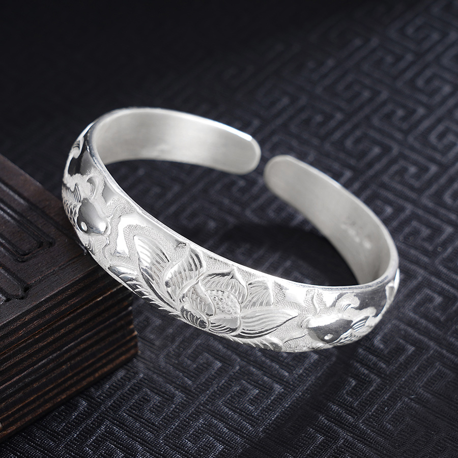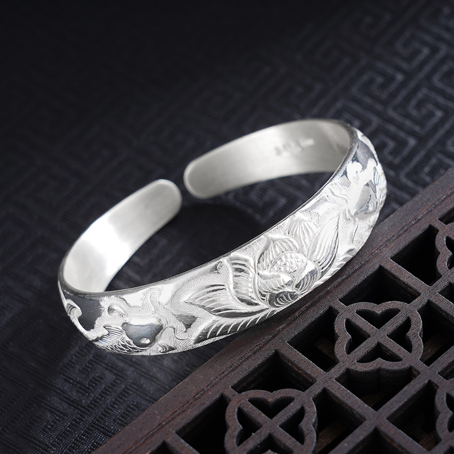 【寓意】:子佩集匠心手作银镯,采用成都金银器制作技艺,于镯体之上錾刻游鱼戏莲之景,辅以抛光工艺,更显婉约清雅。寓意好运连连,吉庆有余。