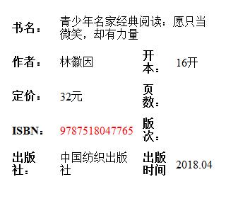 《青少年名家经典阅读:愿只当微笑,却有力量》是由名家写就的关于人生的散文合集。有林徽因对生活的真切感悟、孙犁写他青年时代对书的热爱,老舍谈知识分子的生活情趣,胡适对青少年的人生建议,鲁迅先生谈如何读书、写作。里面有你,有我,与大师谈心,做当下的反思。希望这能帮你推开孤单,得到力量。