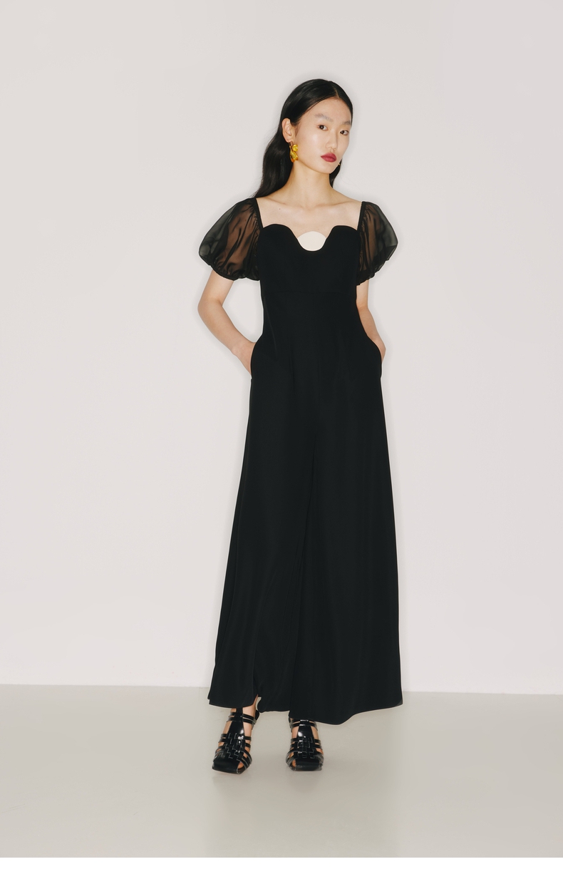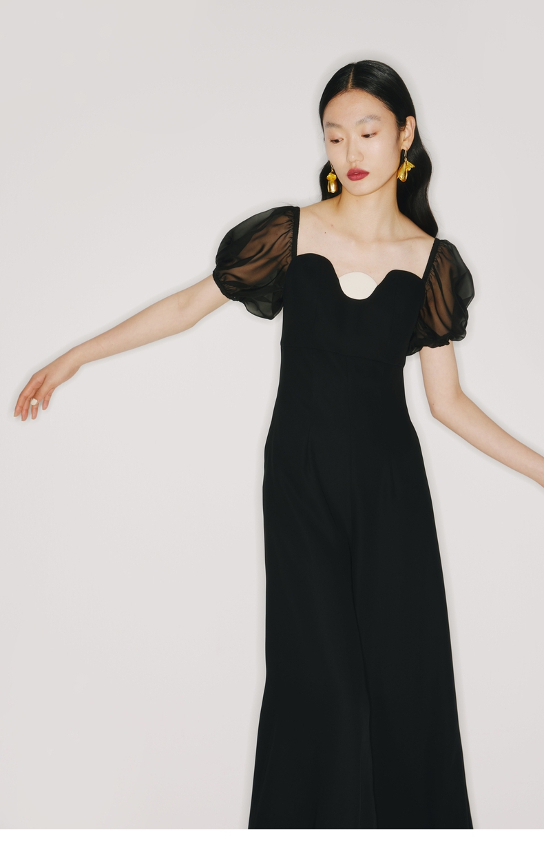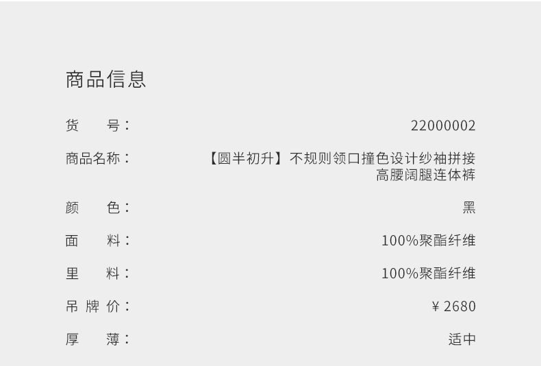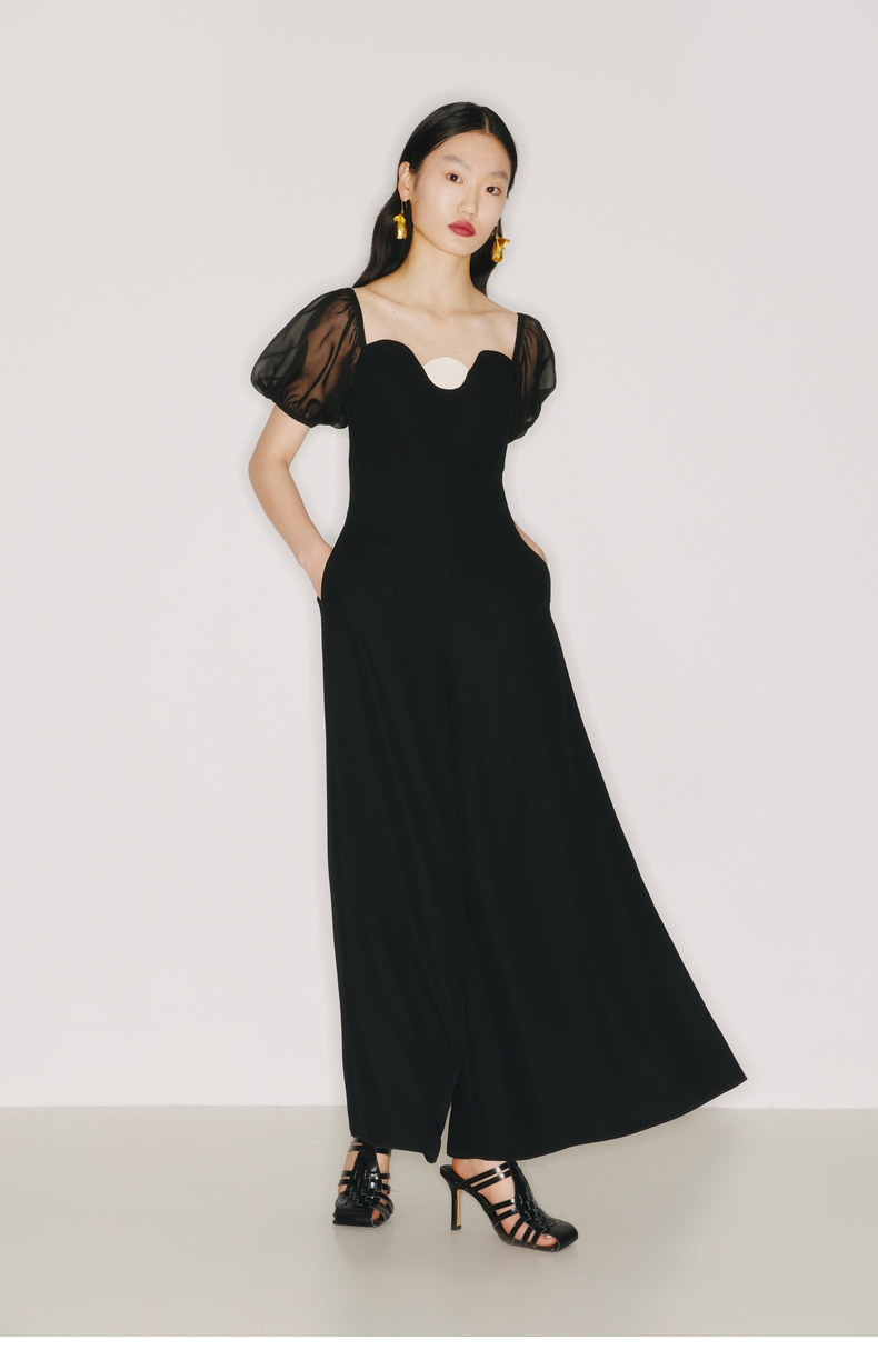 【圆半初升】不规则领口撞色设计纱袖拼接高腰阔腿连体裤/22000002