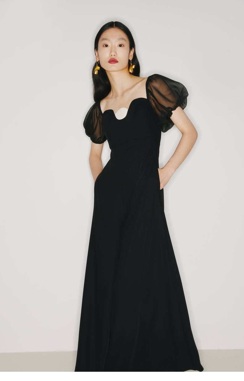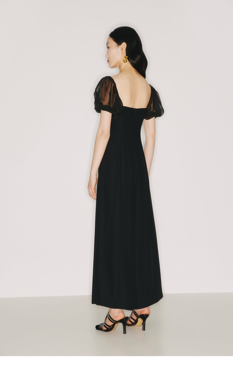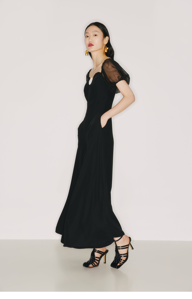 【圆半初升】不规则领口撞色设计纱袖拼接高腰阔腿连体裤/22000002
