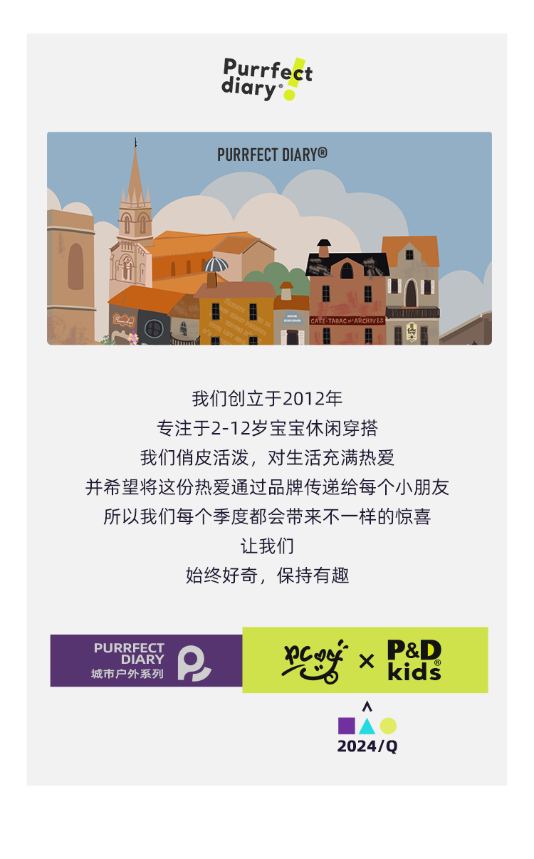 - Purrfect-Diary专注于贴近自然随性的穿着概念,轻奢平价的童装文化传播,在产品设计上更加注重婴童穿着的舒适性、安全性、更出众的国际化品牌,将欧美的育婴文化在中国进行深入的传播与推广。