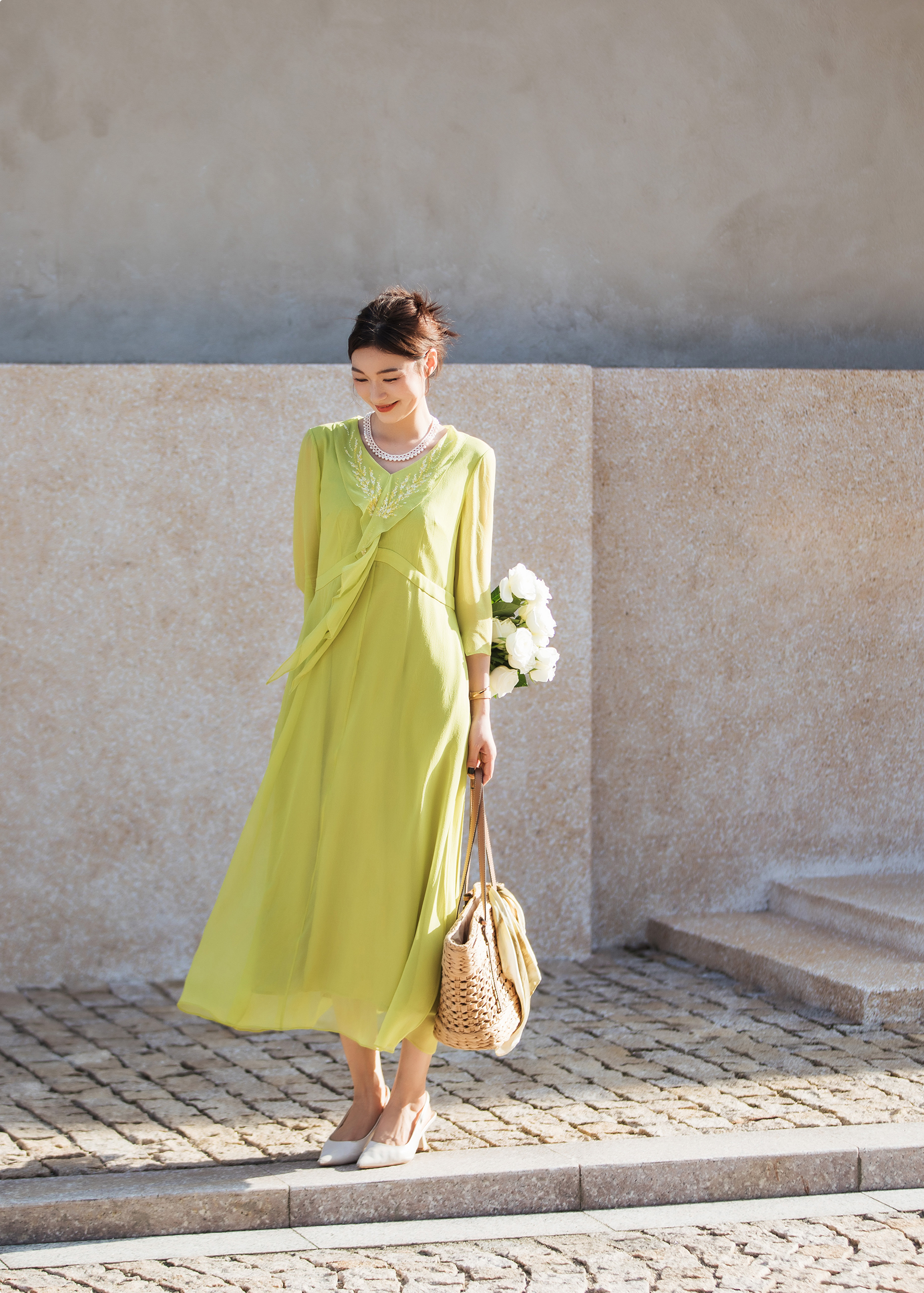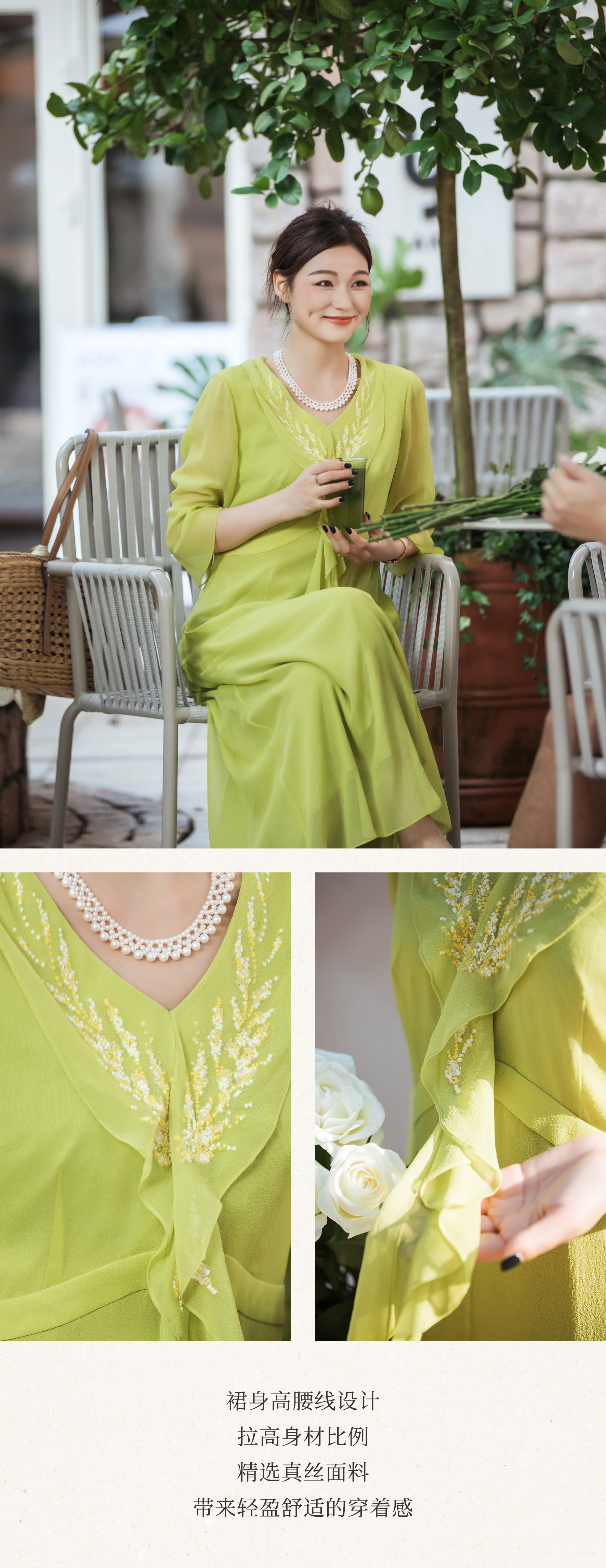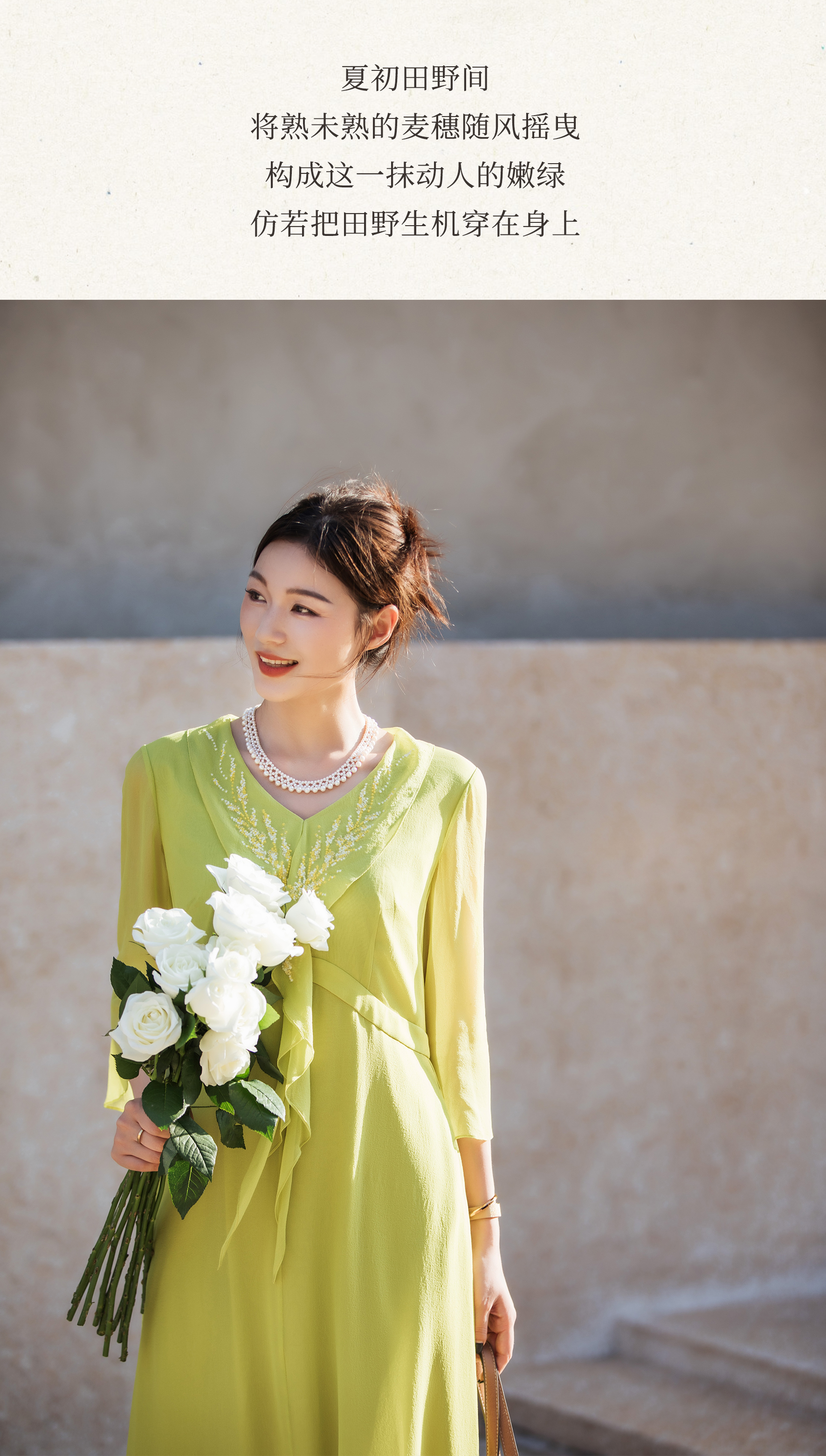 【林栖设计小店】【林栖推荐】(现货)麦穗绣花绿色真丝连衣裙女2025早秋100%桑蚕丝连衣裙N1953320
