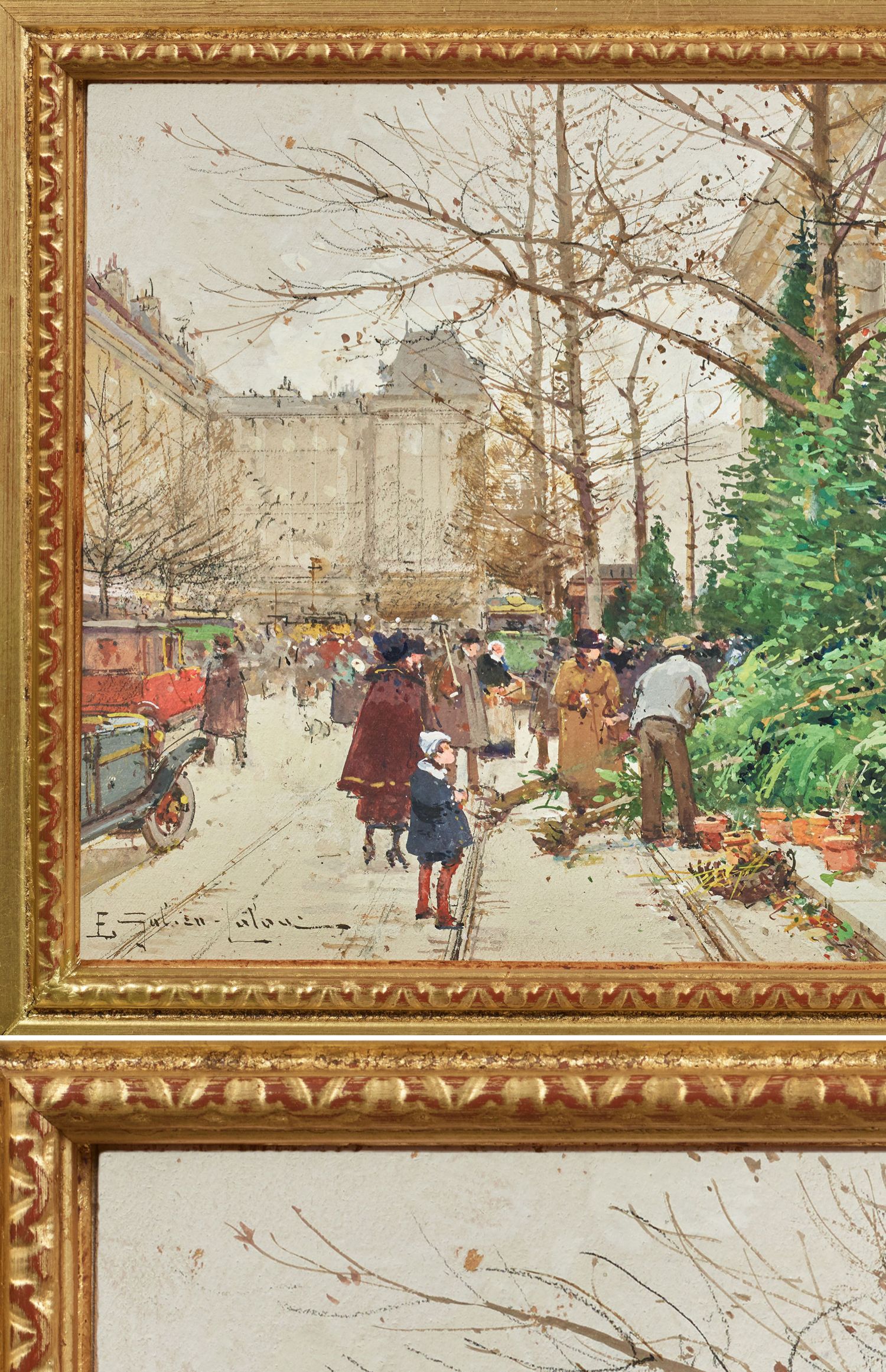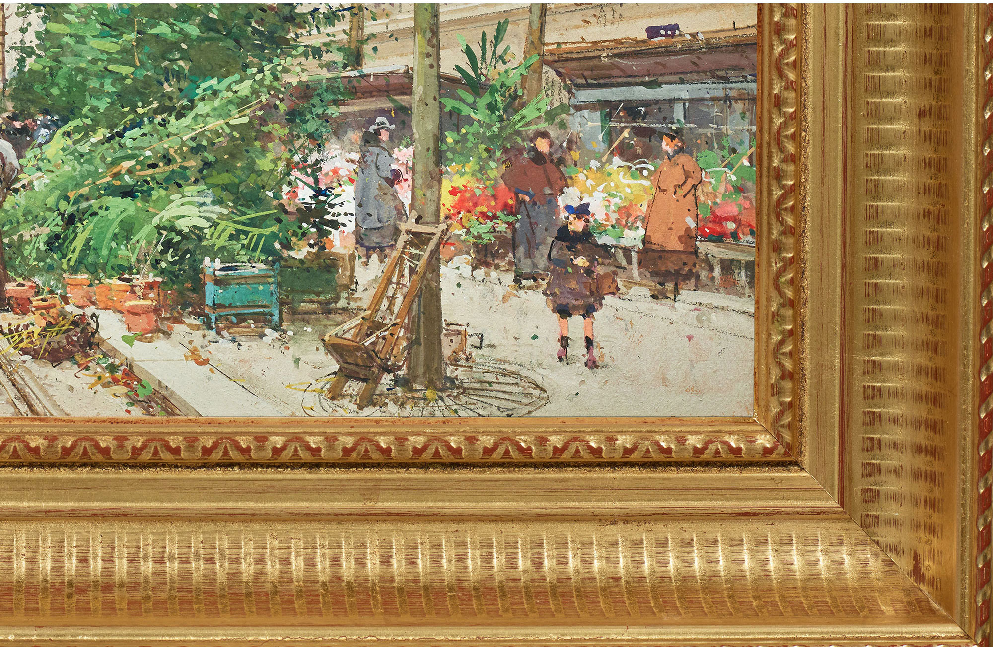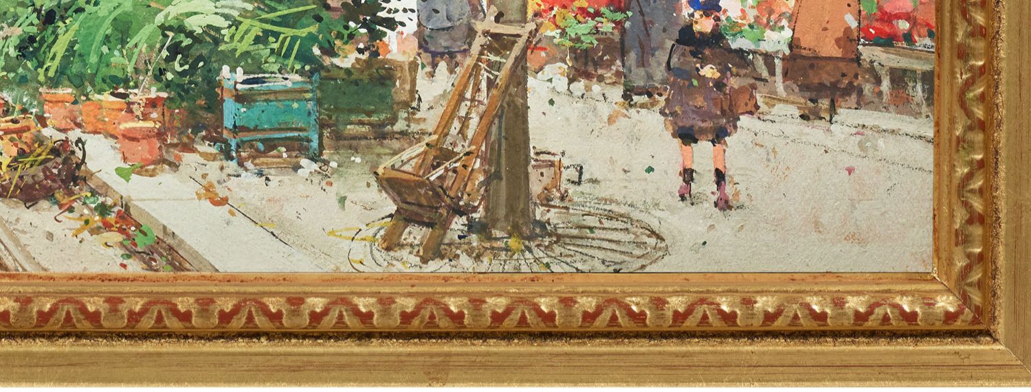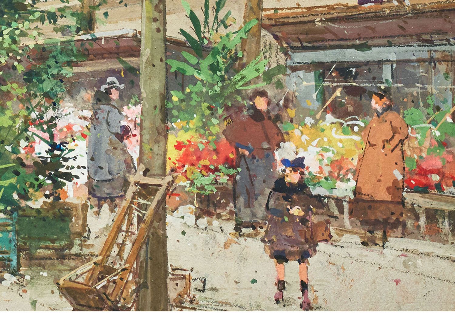 独角鹿西洋古董法国艺术家签名水粉画《圣诞前的巴黎花卉市场》