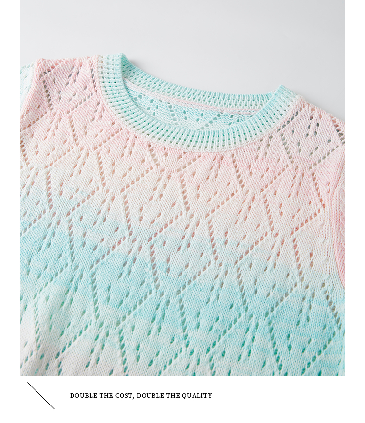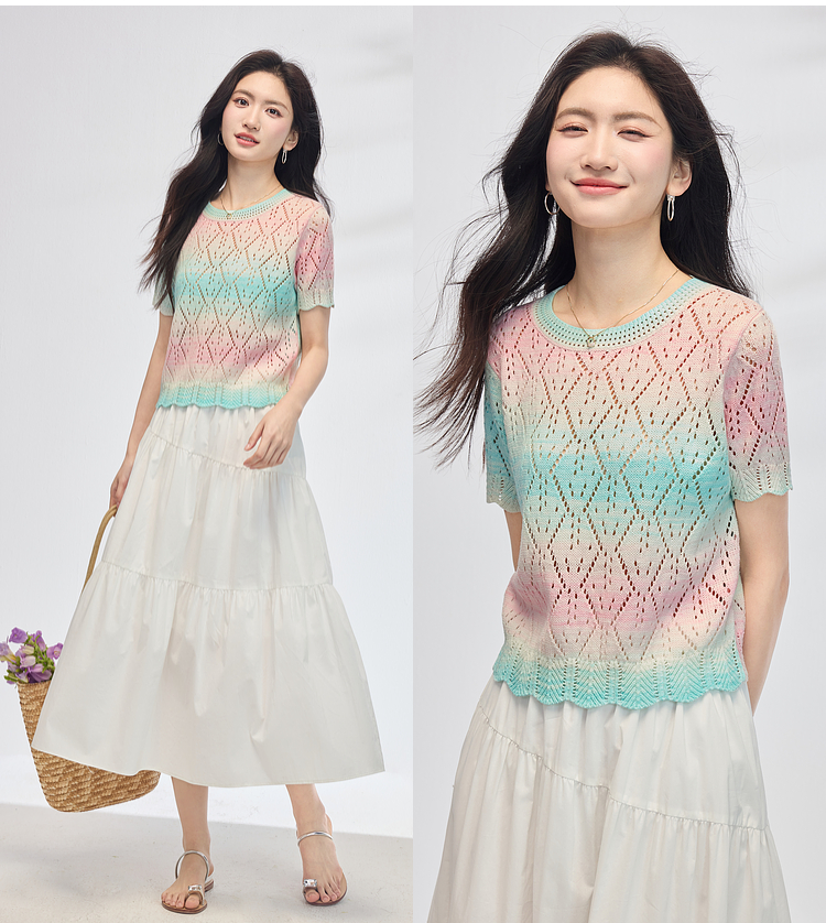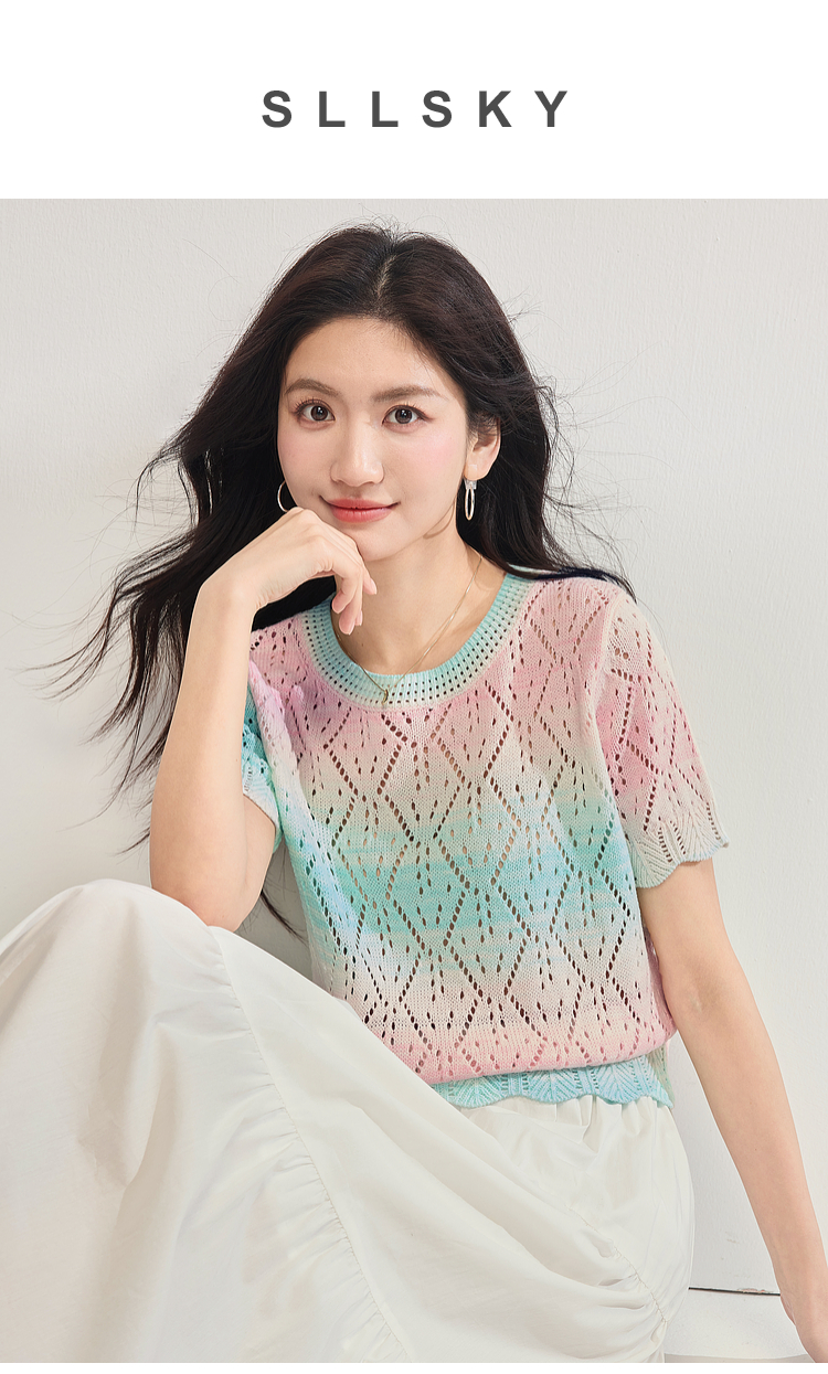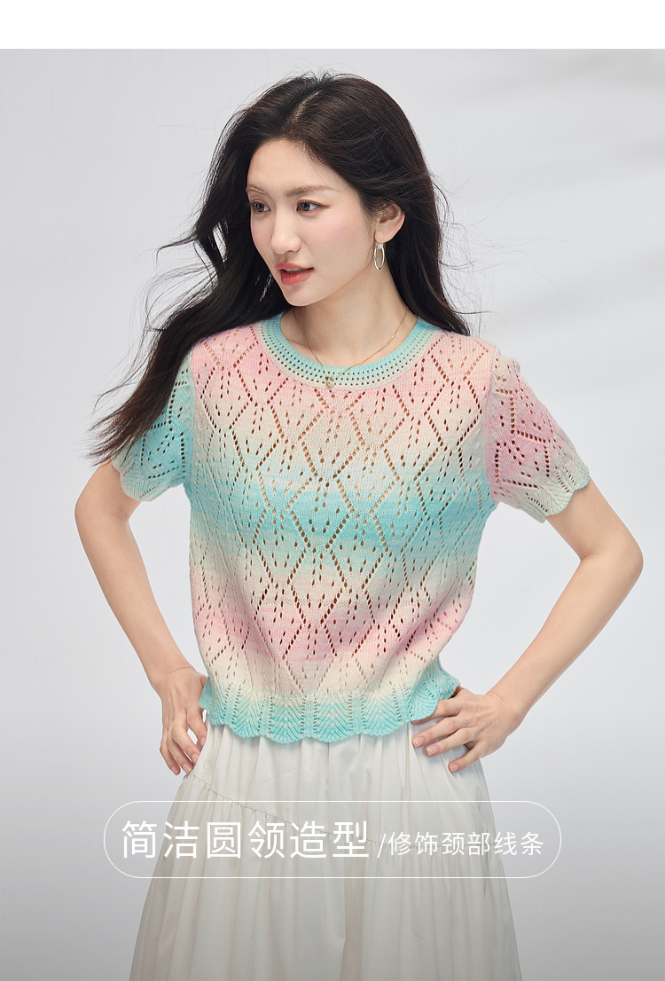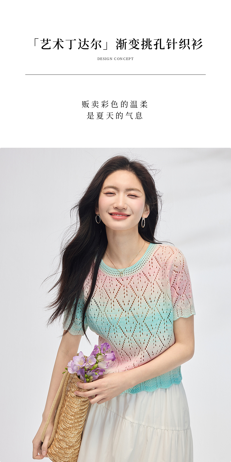【周末秒杀】熙世界丁达尔渐变镂空短袖针织衫女薄款圆领短袖上衣2025夏季新款
