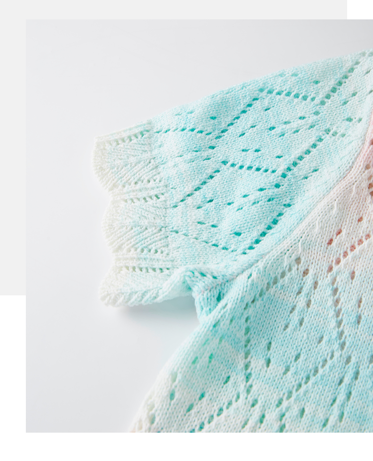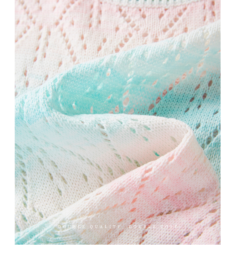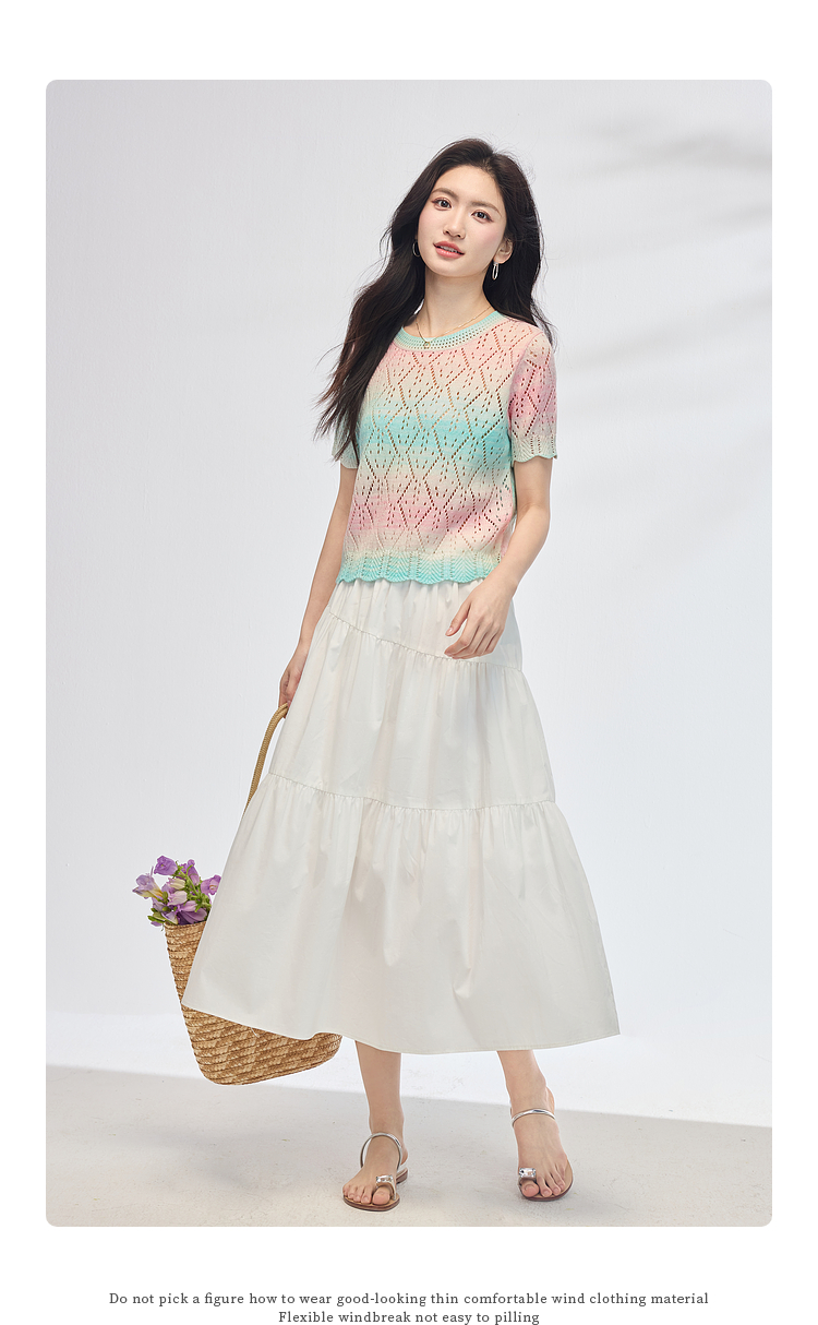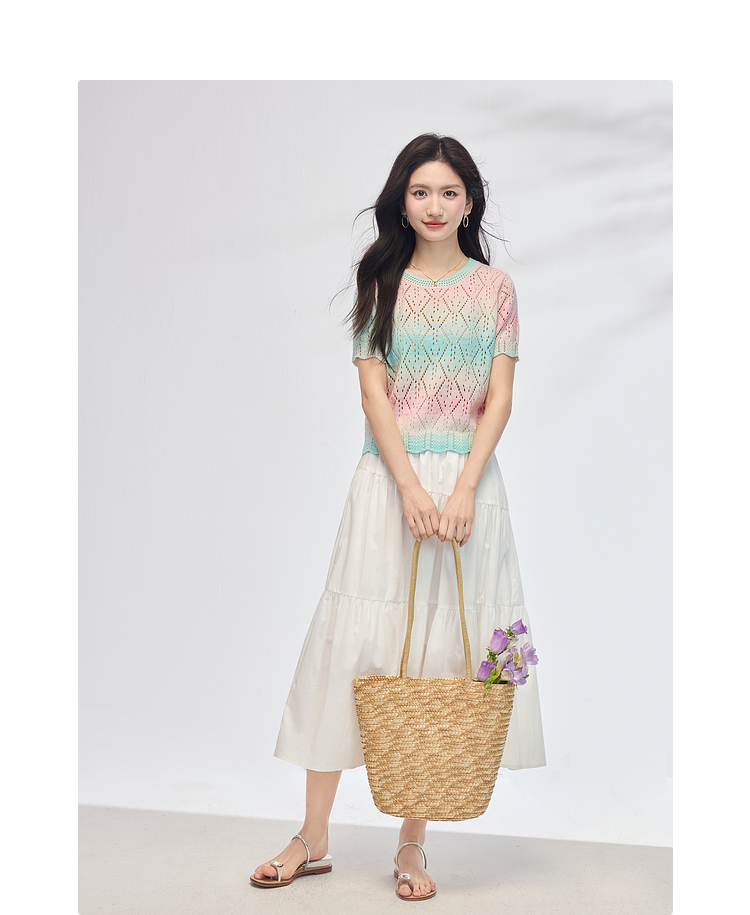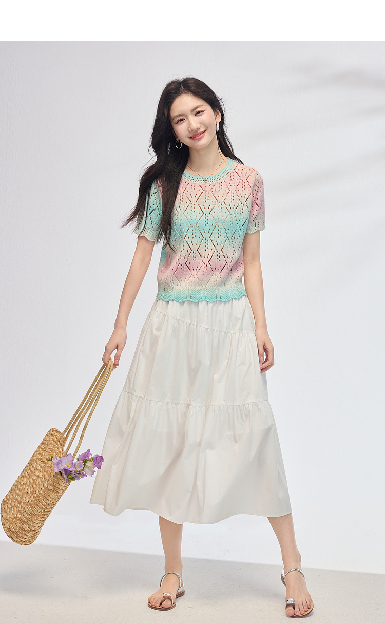 【周末秒杀】熙世界丁达尔渐变镂空短袖针织衫女薄款圆领短袖上衣2025夏季新款