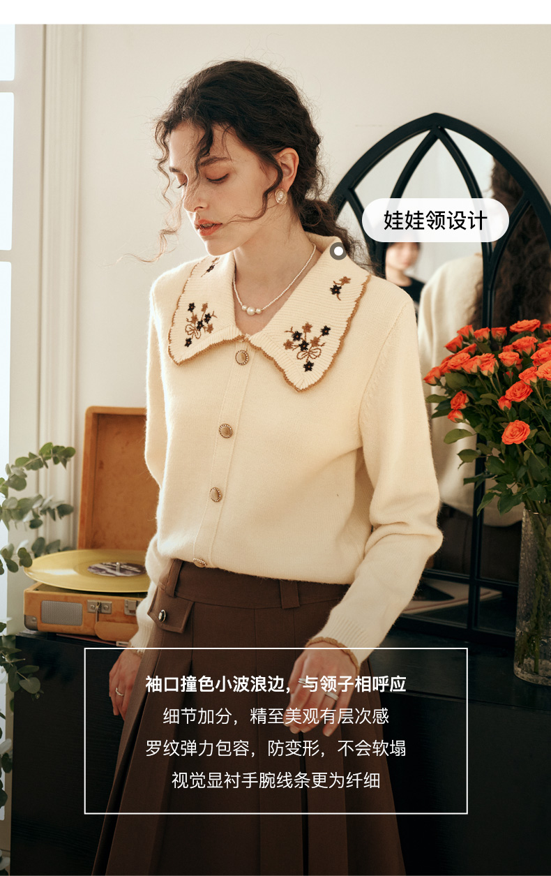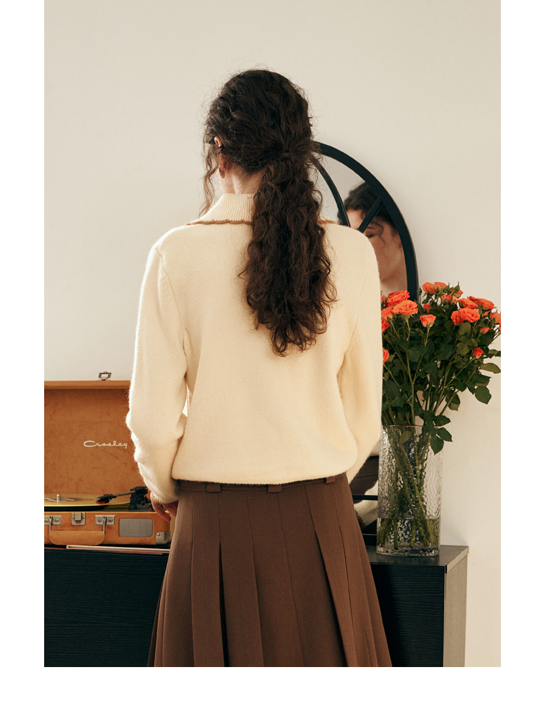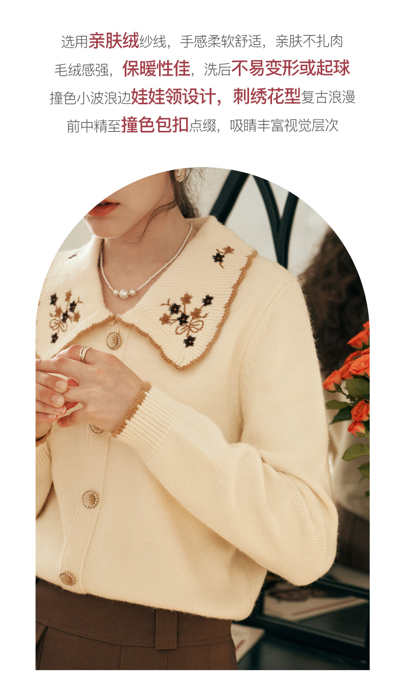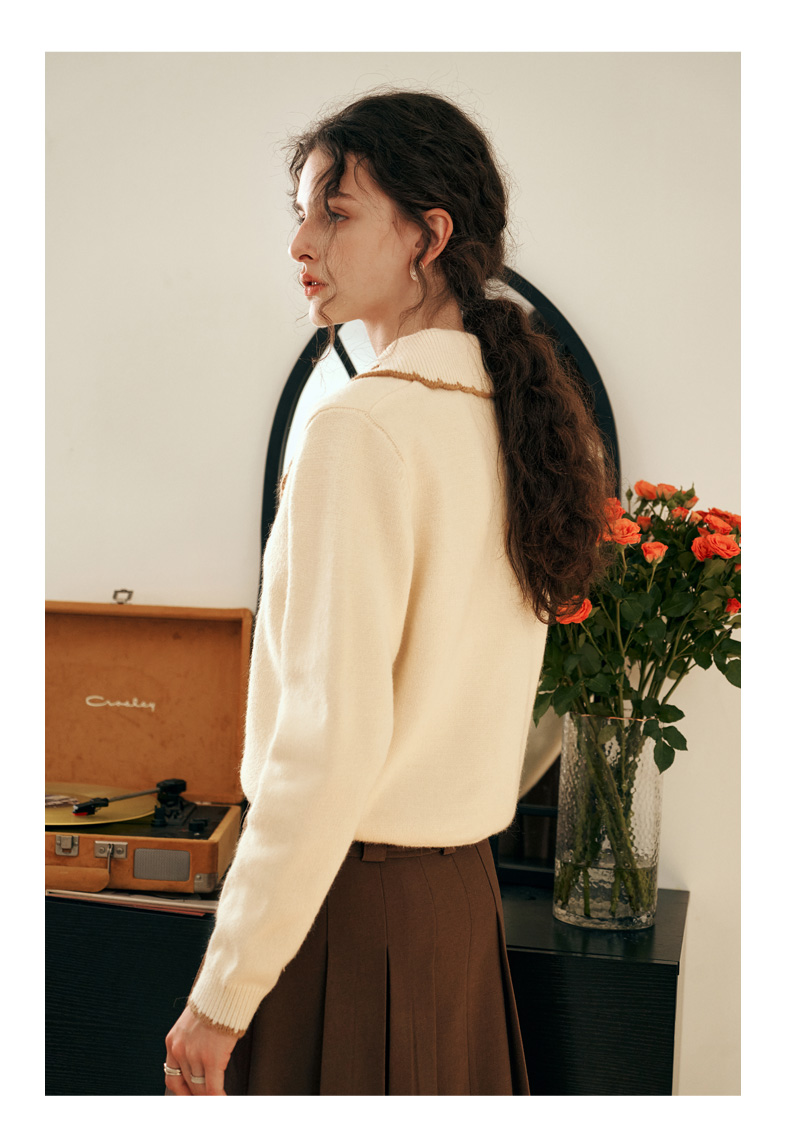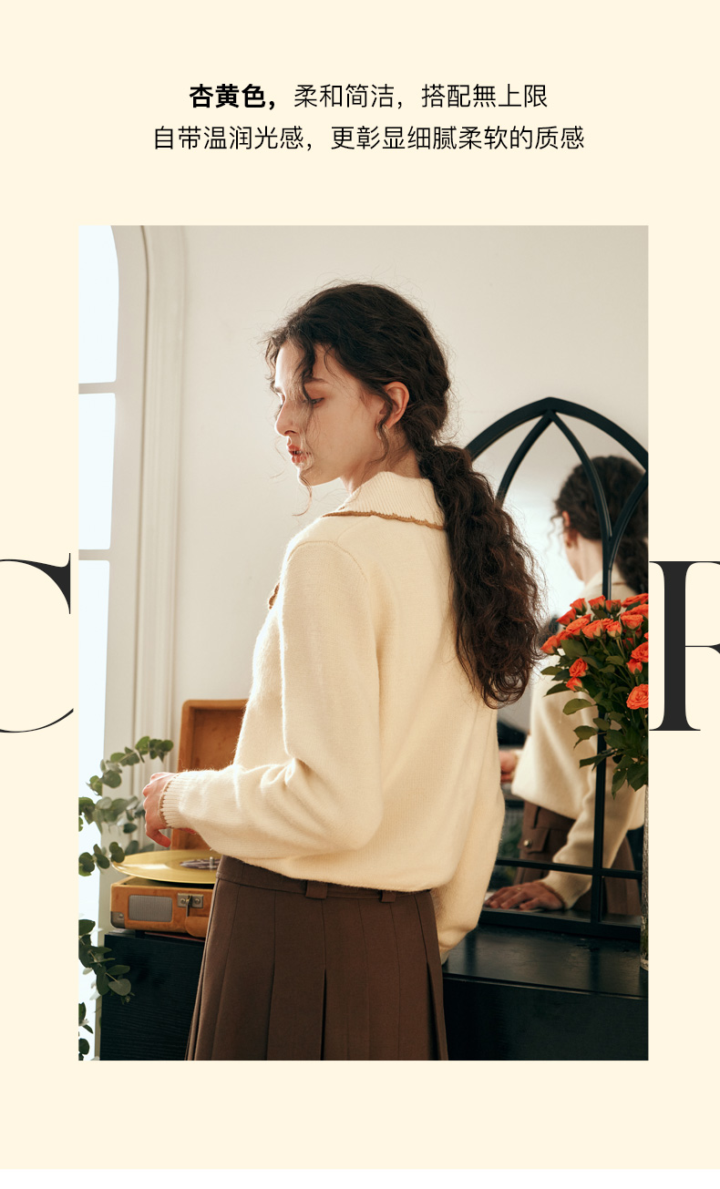 OLrain欧芮儿法式杏黄色毛衣女早春2025年新款复古宽松娃娃领上衣