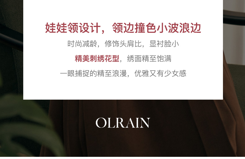 - “精致”是欧芮儿olrain品牌文化的核心,欧芮儿认为,精致的女人,不但要外在动人,更要内在迷人,内外兼修,有魅力、有气质、有内涵,自信而不自傲,优雅而不矫揉,自有万种风情而不轻浮,更不故作矜持。