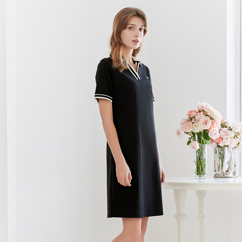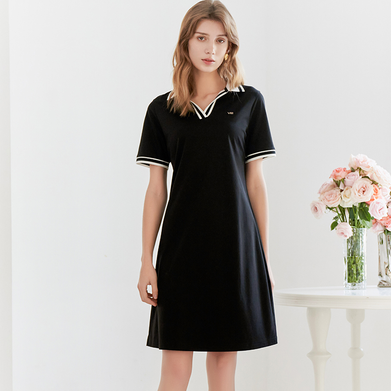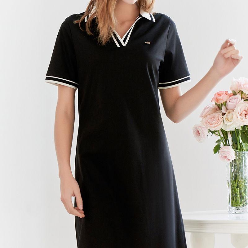 【纯棉V领撞色连衣裙】23年春夏新品女士中长款连衣裙修身显瘦黑色裙子