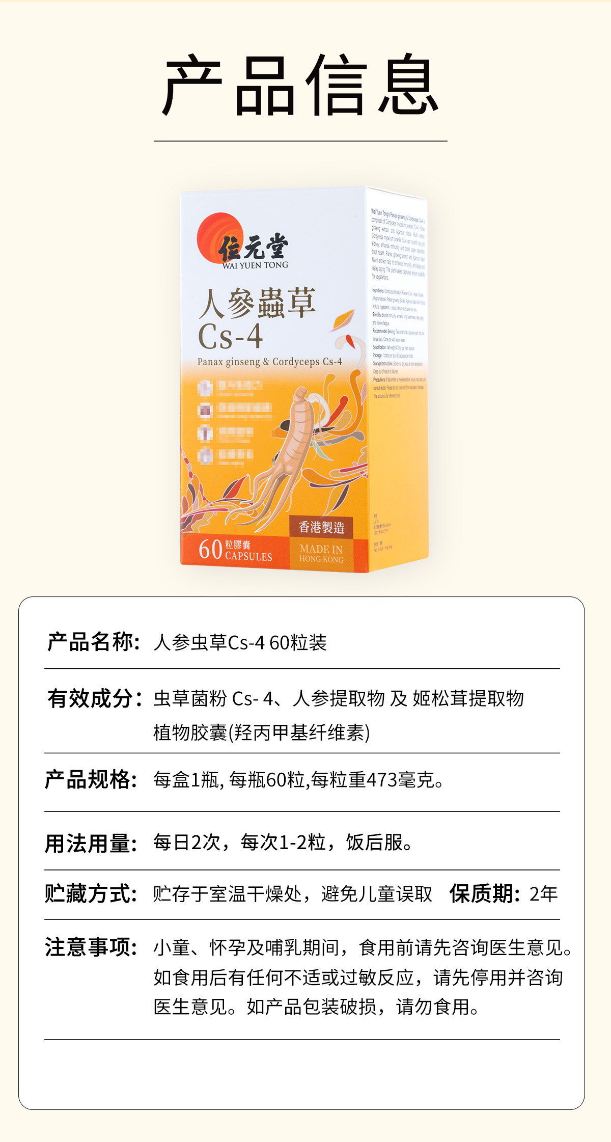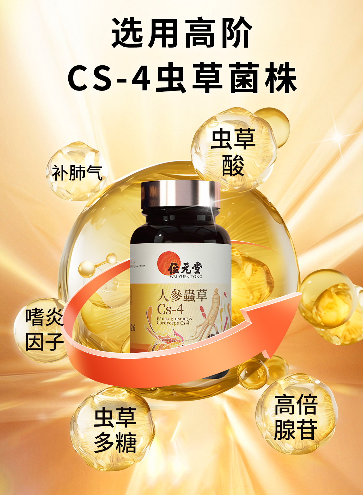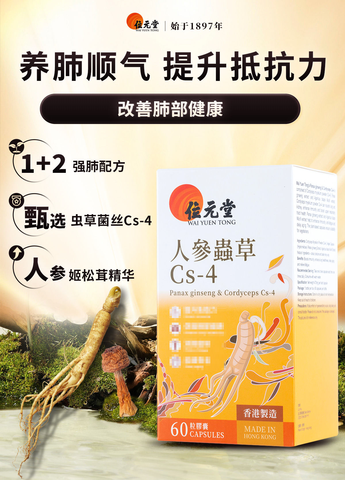 ⁵店庆活动:近效清99元【香港位元堂-人参虫草Cs-4胶囊】发酵提取的Cs-4菌种+人参+姬松茸 60粒/瓶 效期至26.5.3 YY05-QTT-YTHP