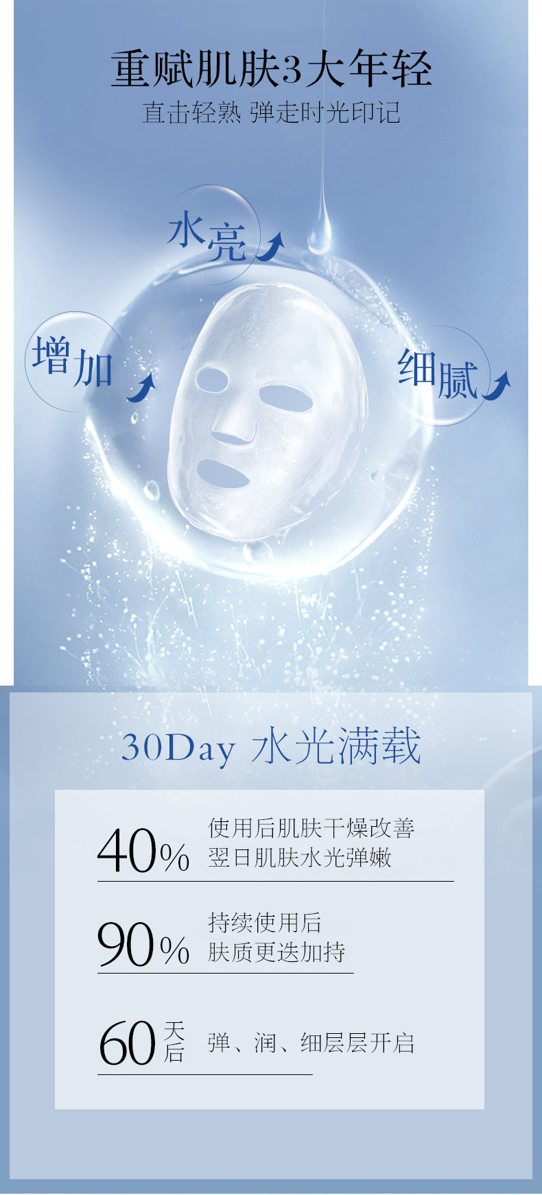 4.【源自院线抗老效果的组合拳】类肉毒素乙酰基六肽-8抑制肌肉收缩的神经介质传递信号,无痛式淡纹;专利燕麦β-葡聚糖促进胶原蛋白新生,填充式填平静态纹;水光针的核心成分透明质酸钠填充组织空洞间隙嫩肤;3大专利组合出击,凌驾于医美抗老效果之上,无痛、无创,非侵入式解决肌肤老化问题。