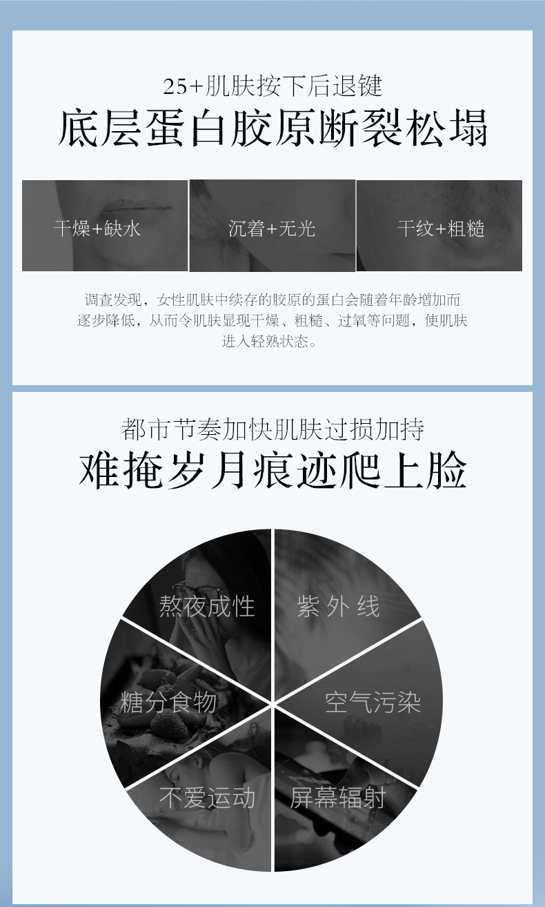 1.熬夜加班/刷剧/带娃肌肤暗沉无光、松垮疲态、纹路突显