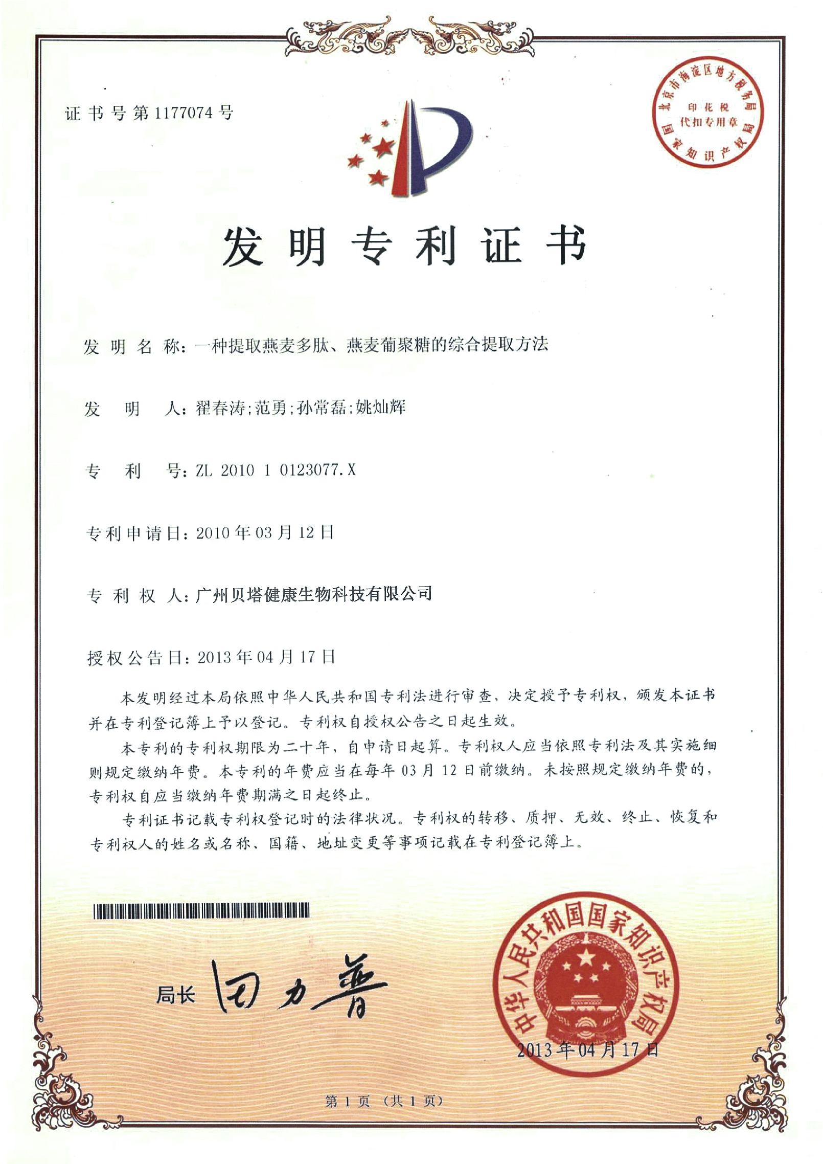 专利成分:燕麦β-葡聚糖