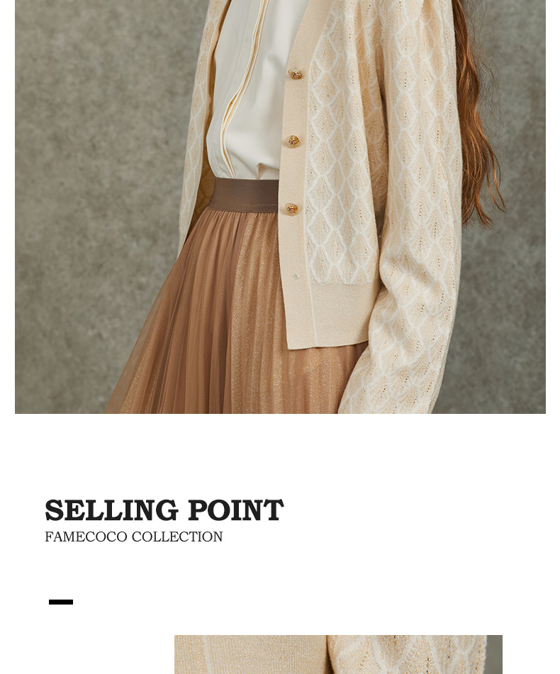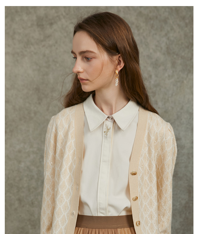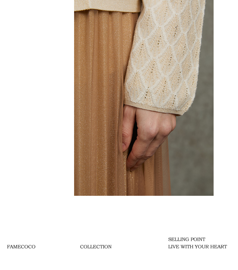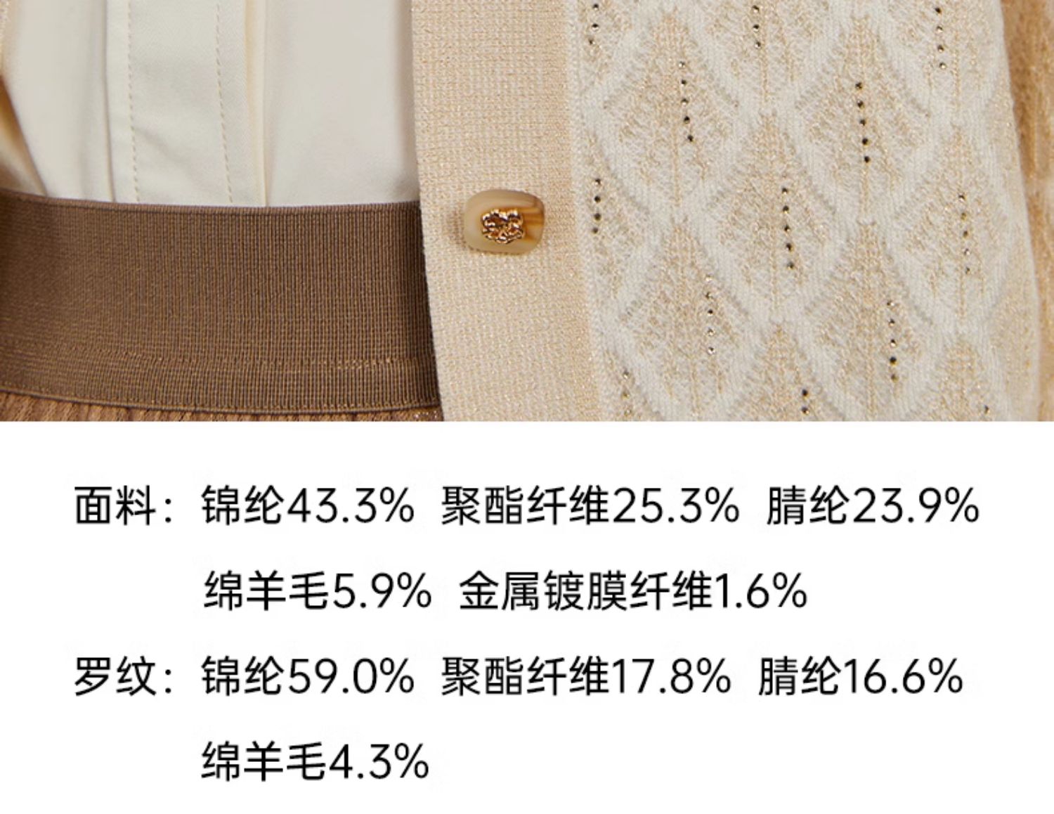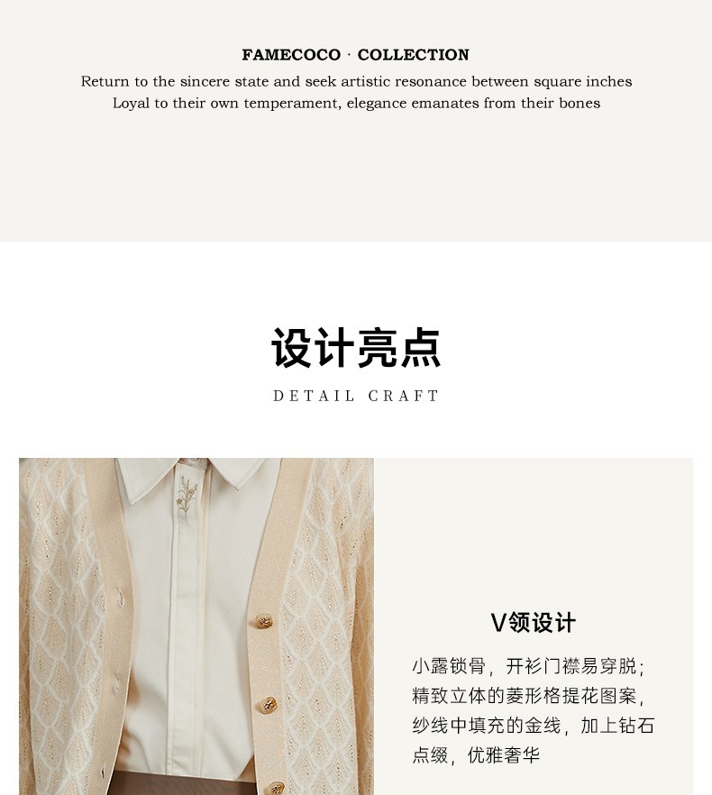 Famecoco范可儿V领毛衣开衫高级金线点缀菱格提花FAC6DE010