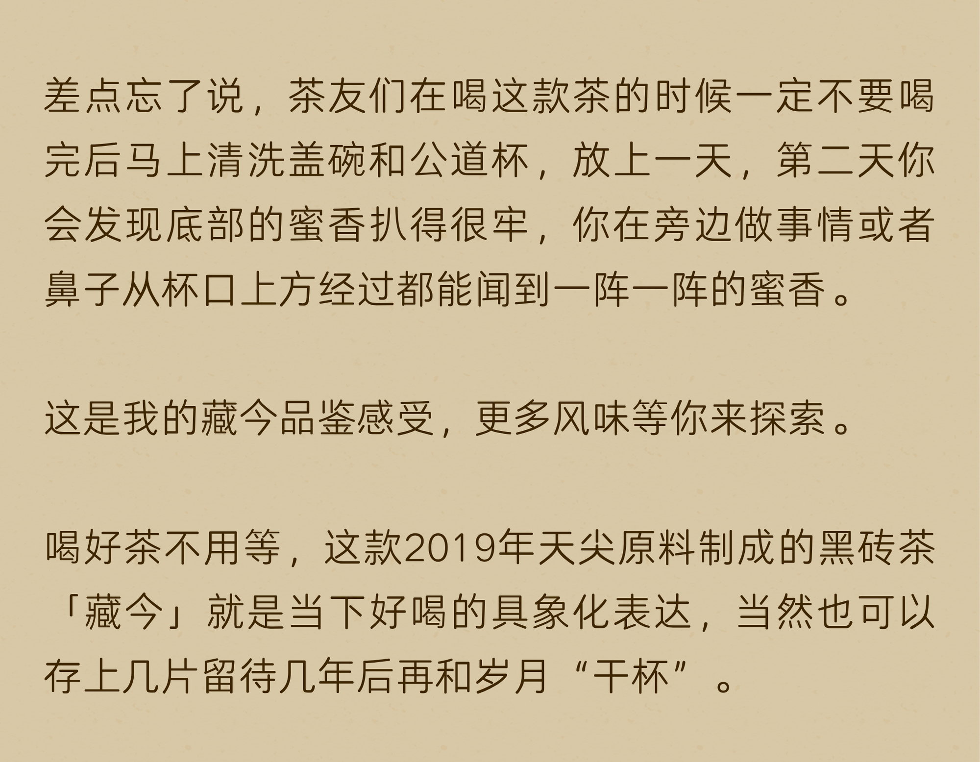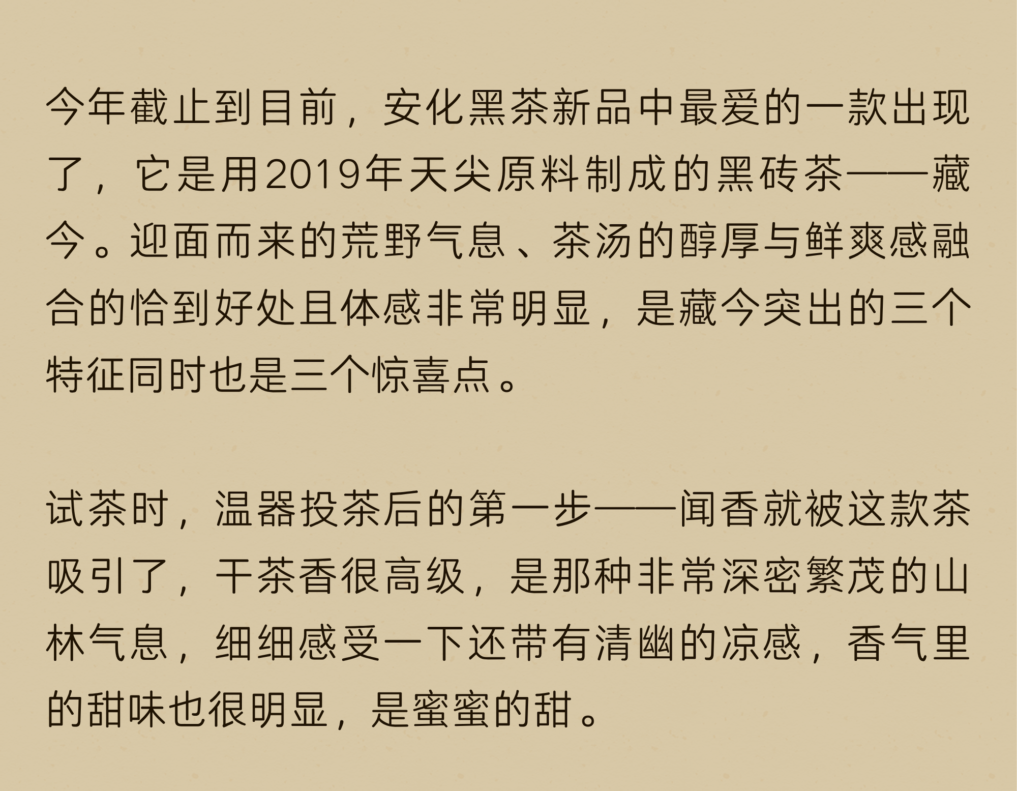 安化黑茶「藏今」2019年荒野原料 手工杀青 迎面而来的荒野气息 木质香融合蜜香 醇厚与鲜爽感并存