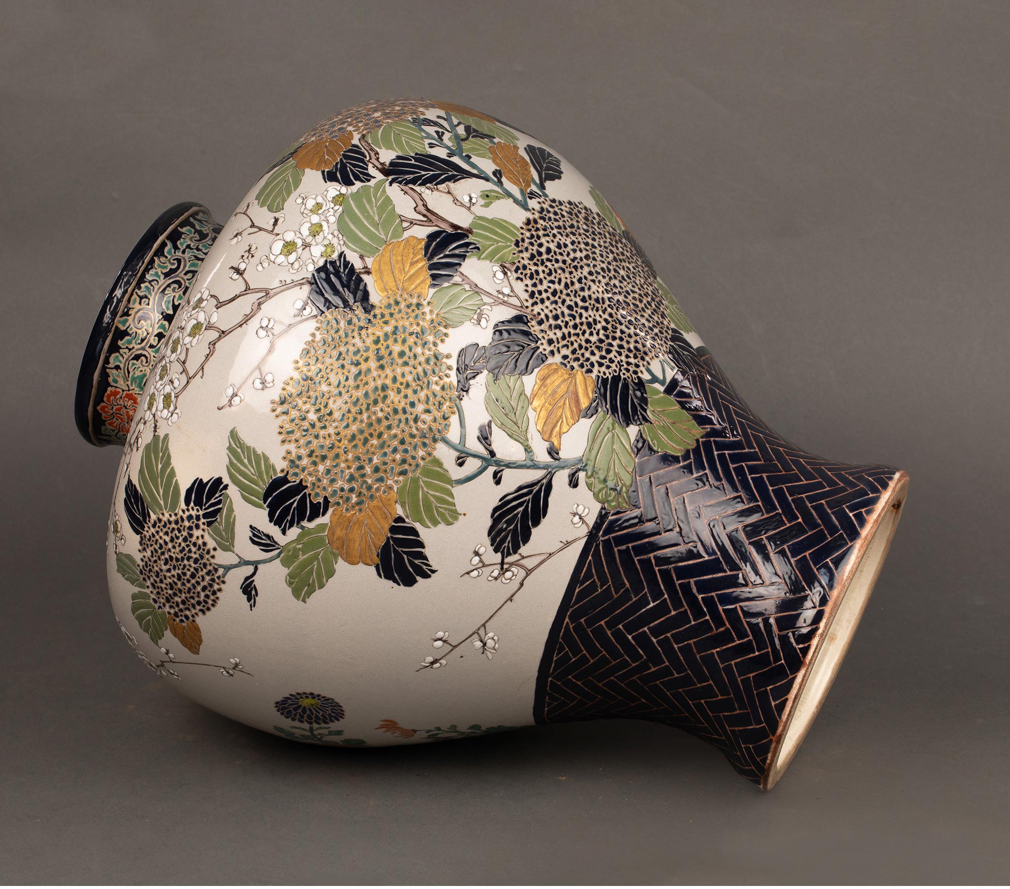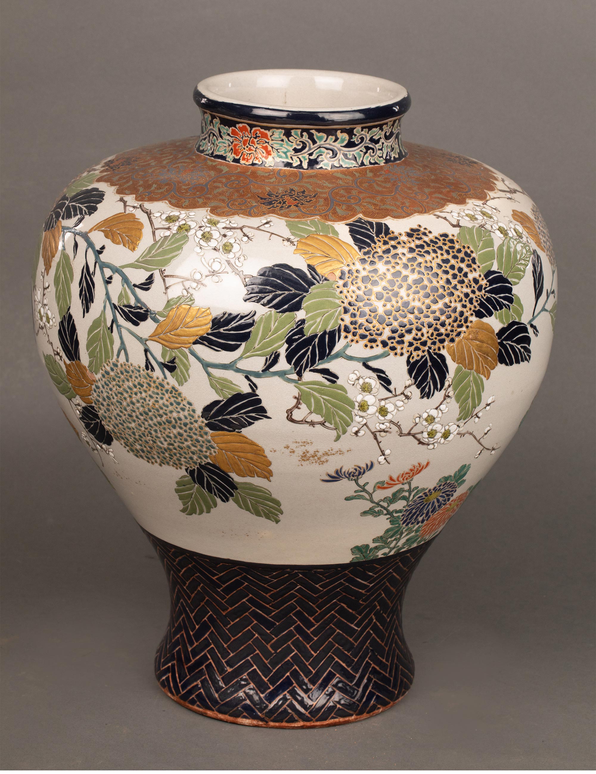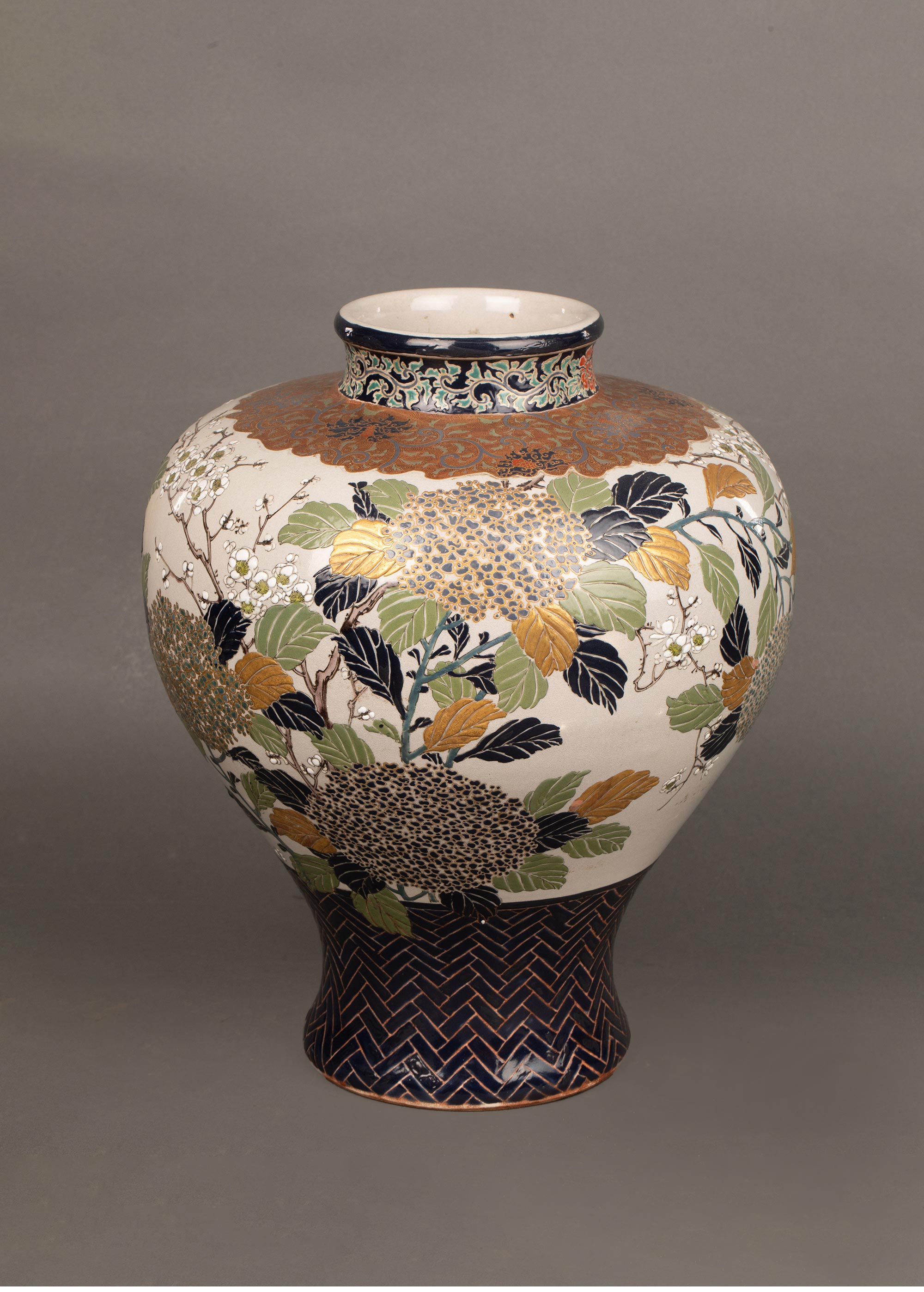 1900年代日本明治时期出品岛津家丸十字家徽款祥瑞花叶纹描金彩绘萨摩烧花瓶