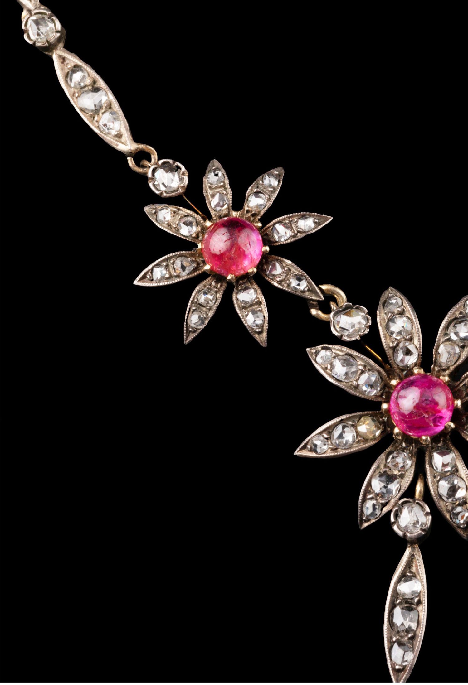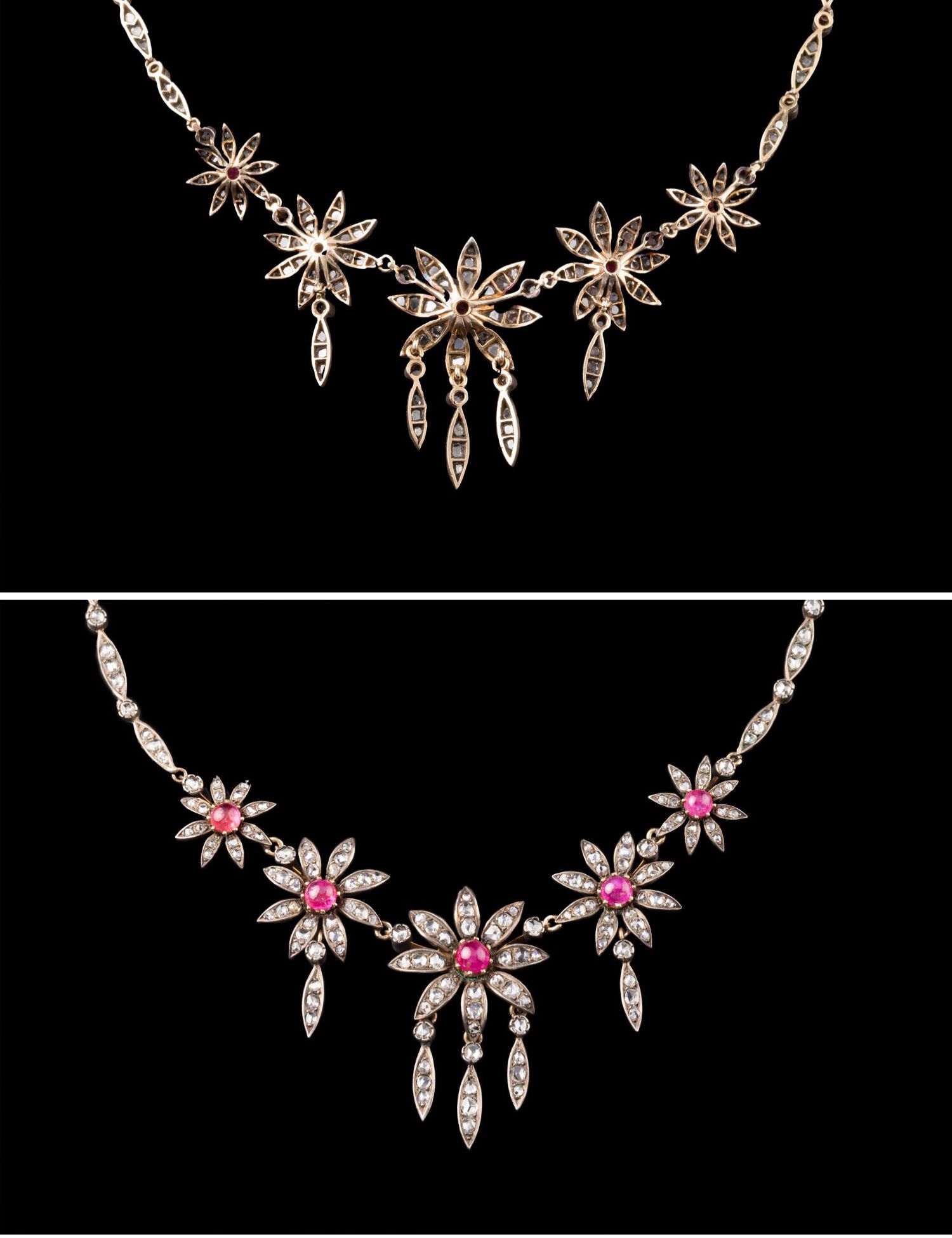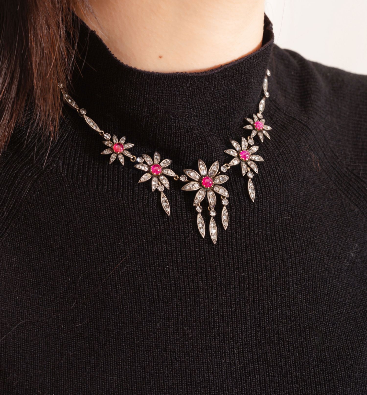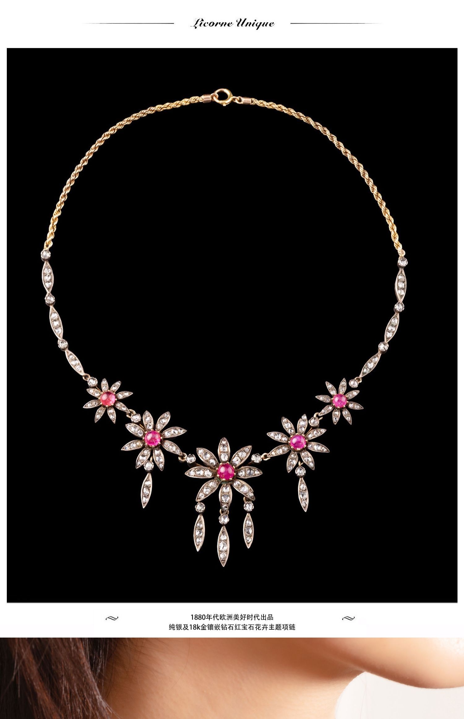 独角鹿西洋古董首饰欧洲vintage珠宝纯银及18K金镶钻石红宝石项链