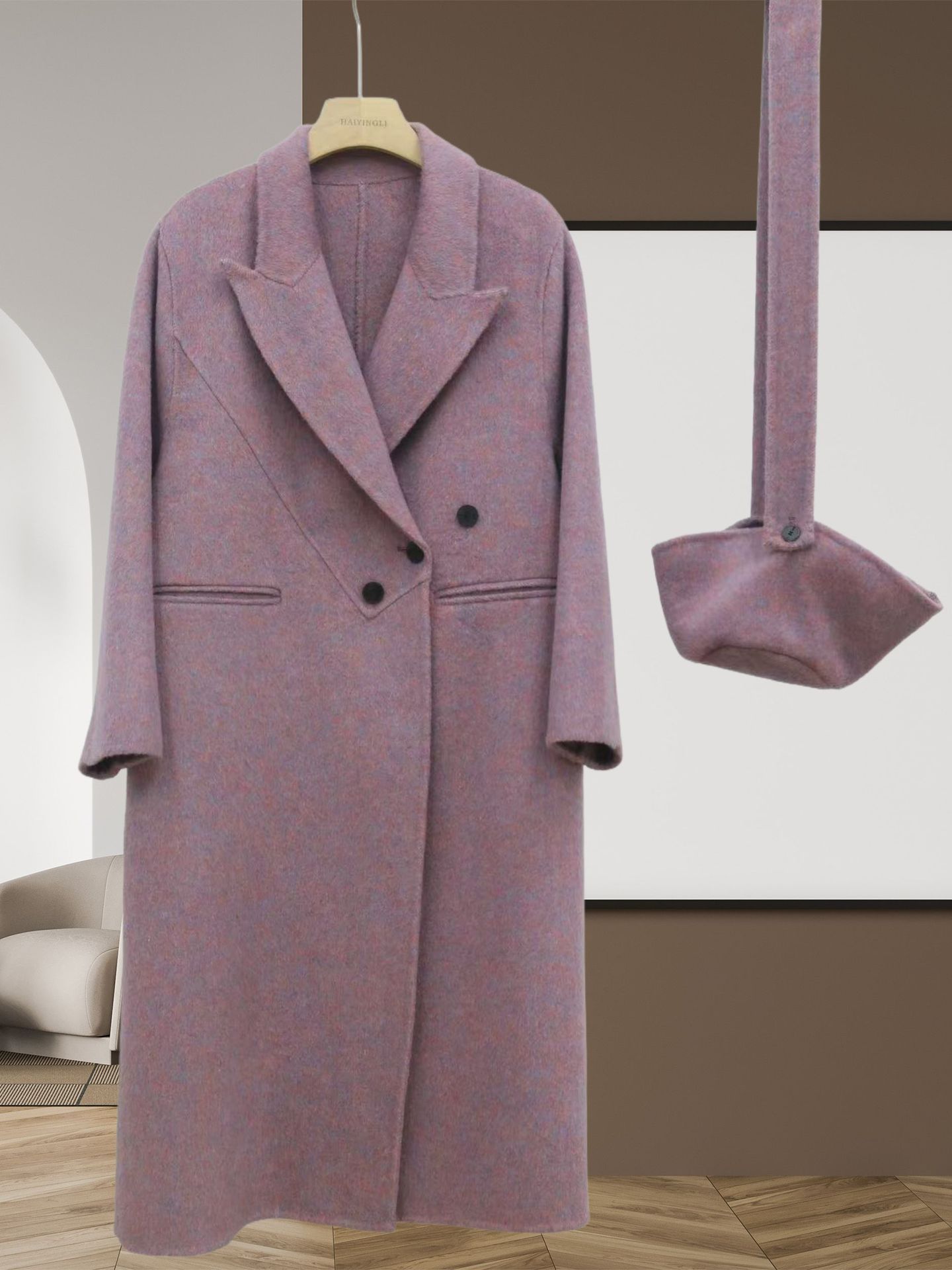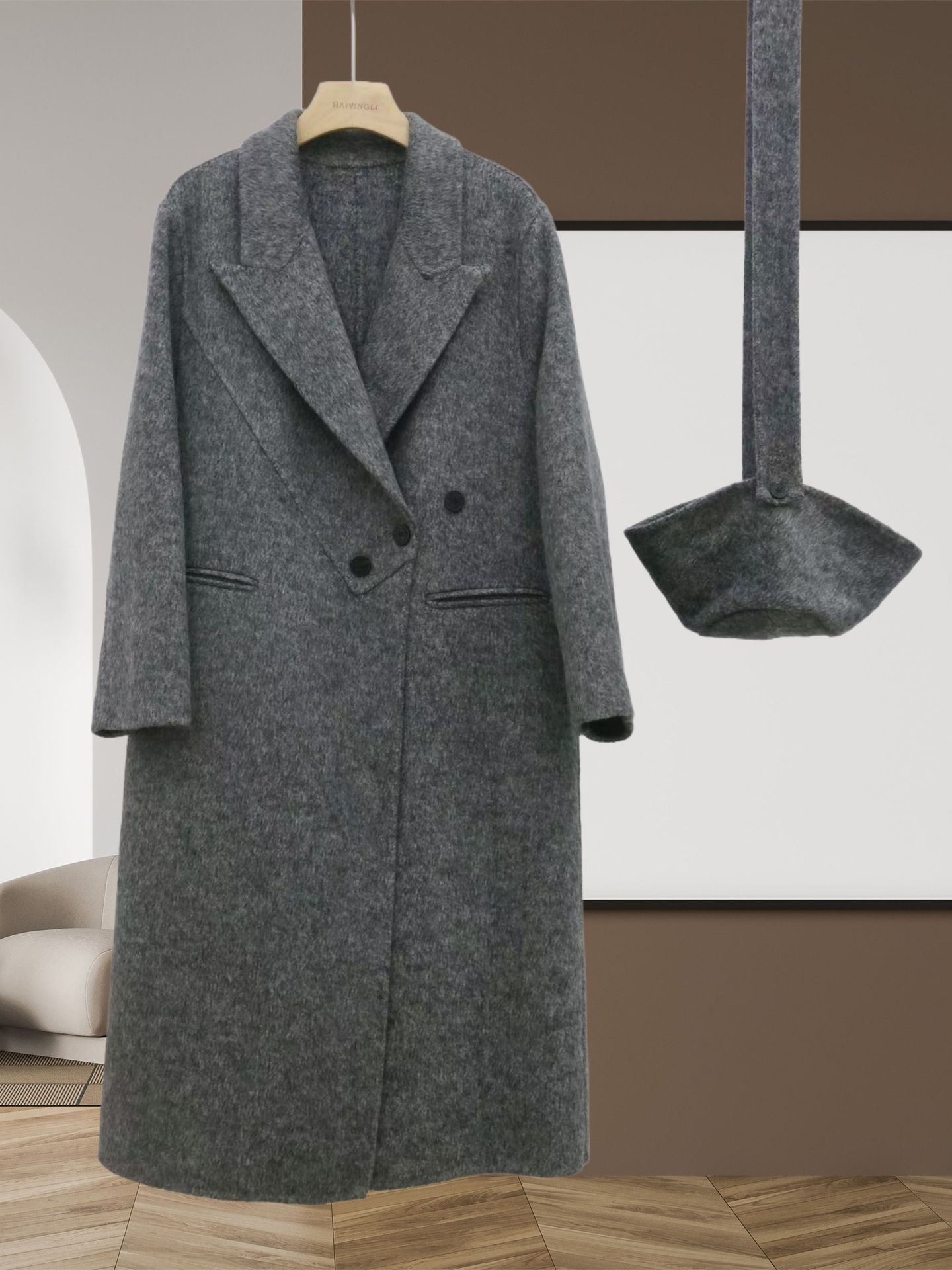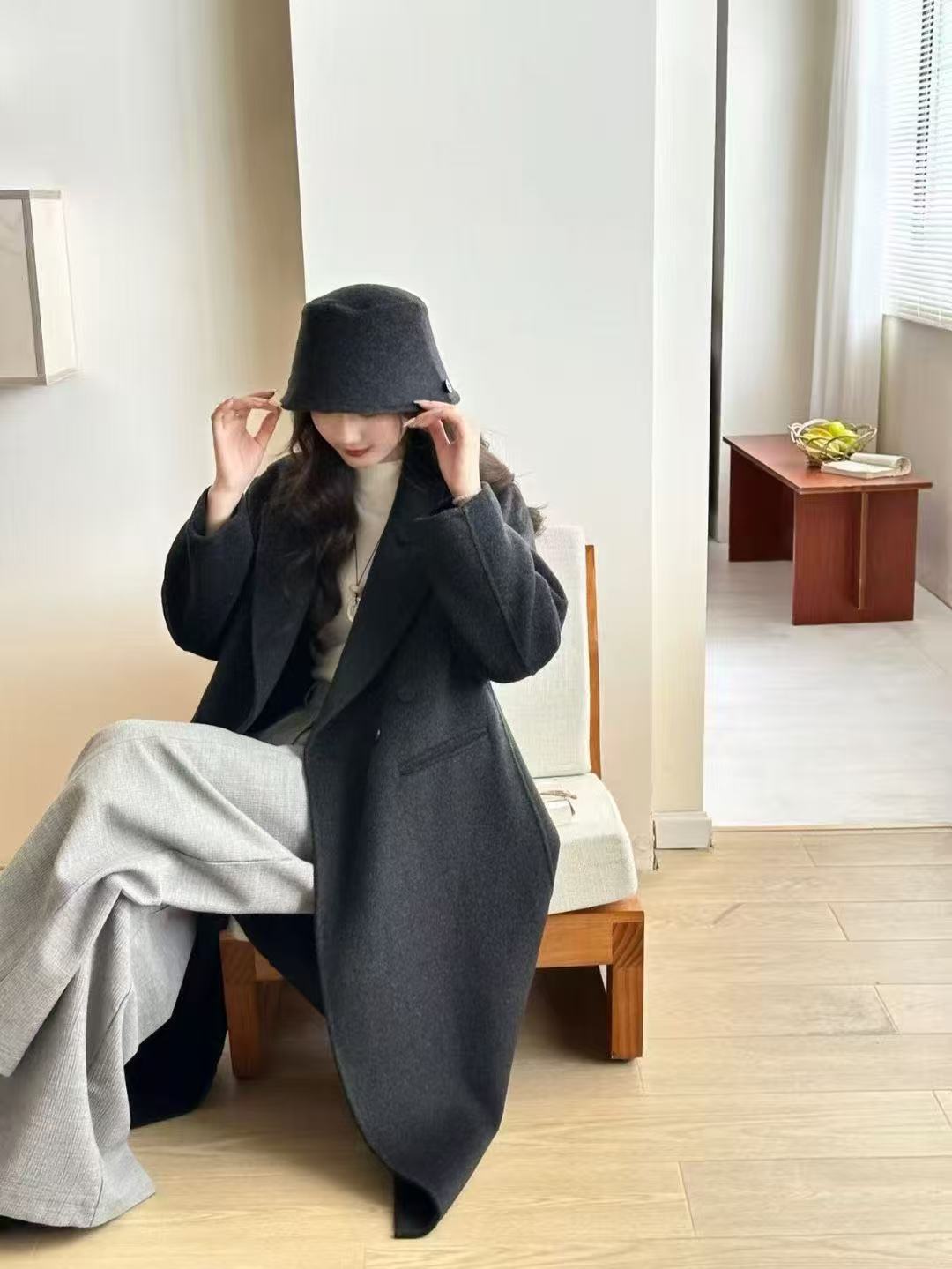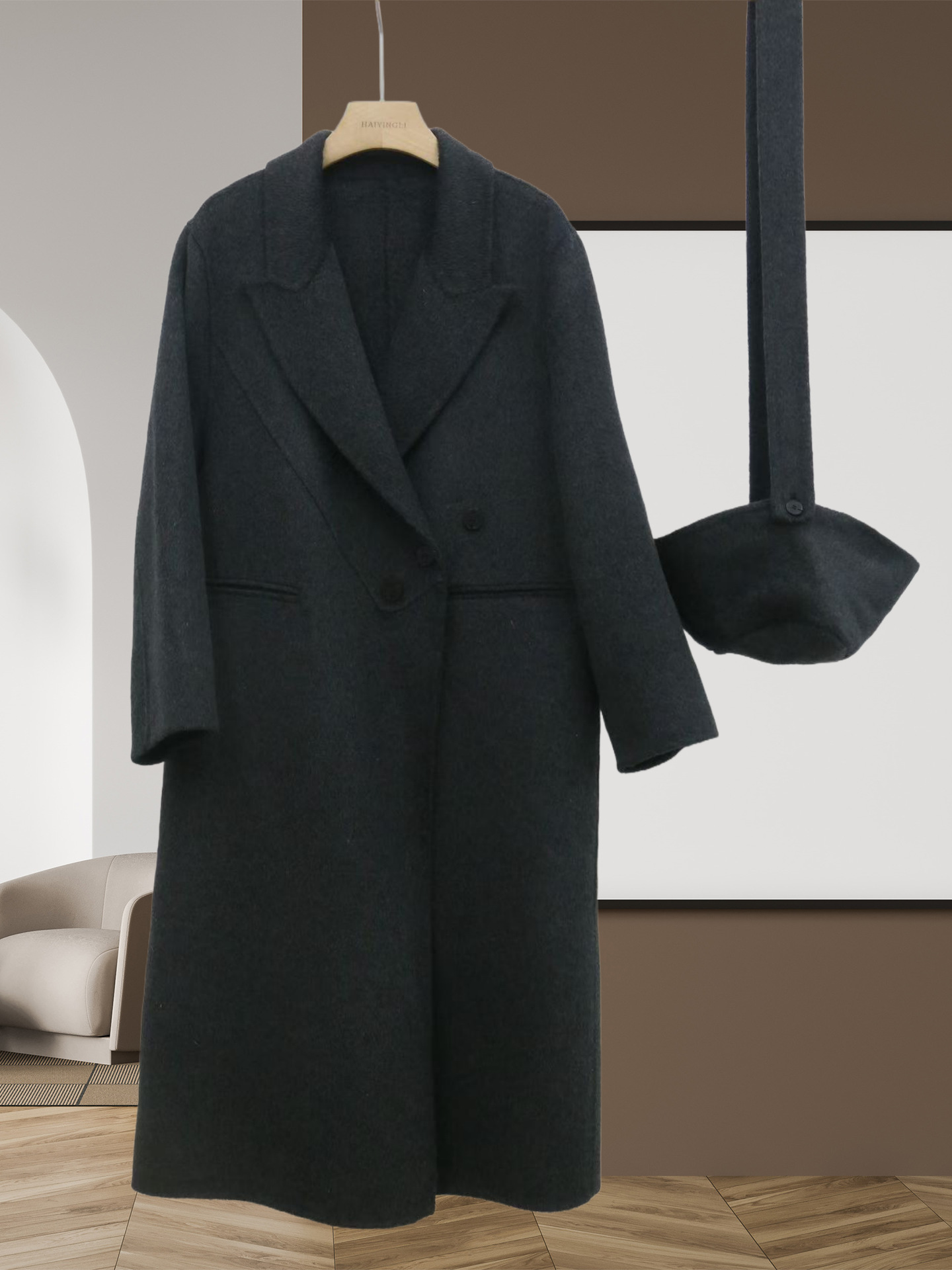 【YW】无忧购长款双面100%羊毛大衣西装领渔夫帽两件毛呢气质外套(截单后3-5天发货)